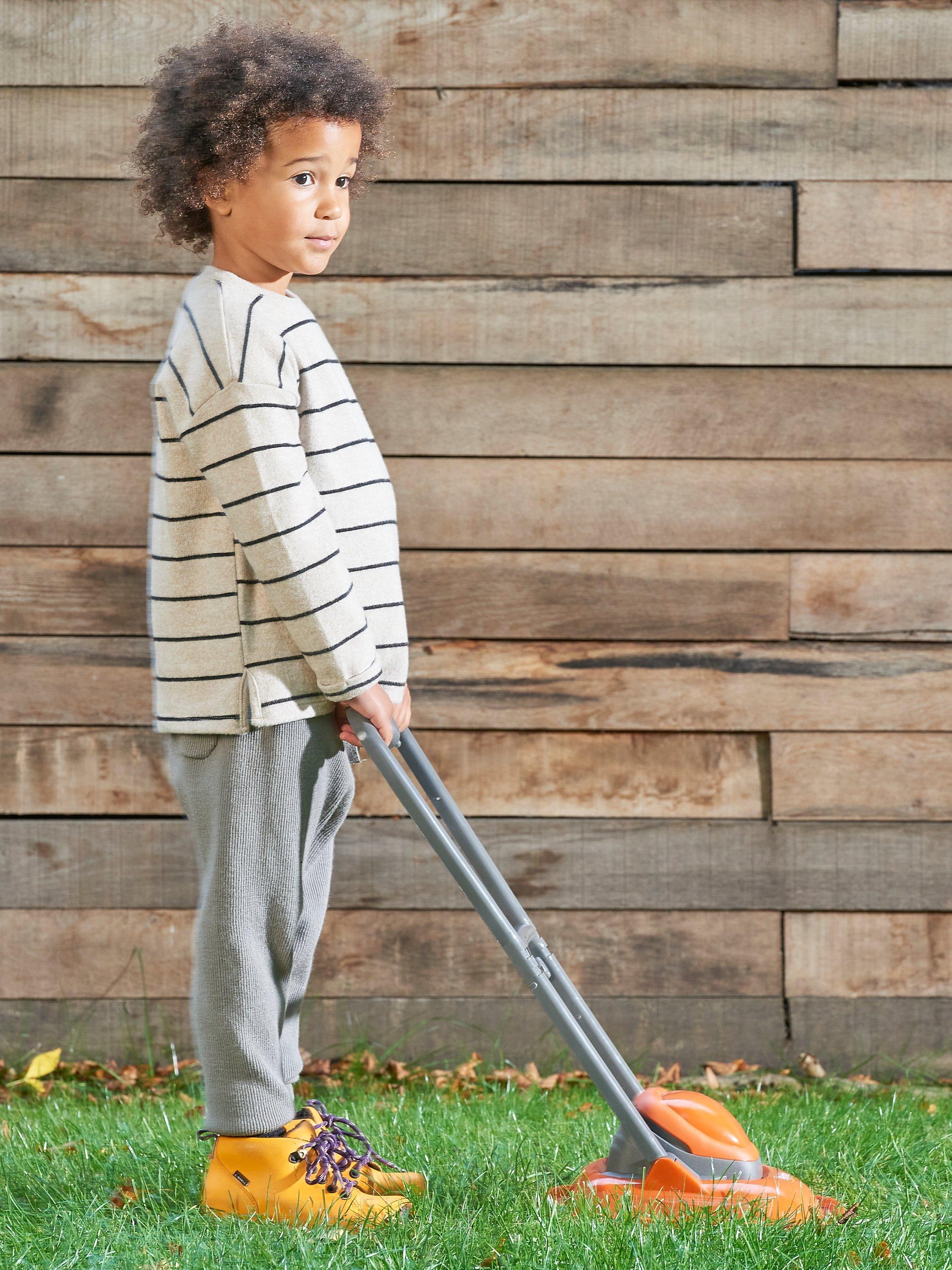 Easy to assemble, with a 2-part handle, it has a "click" sound when pushed along and it looks just like the real thing with its bright orange shape and Flymo logo.