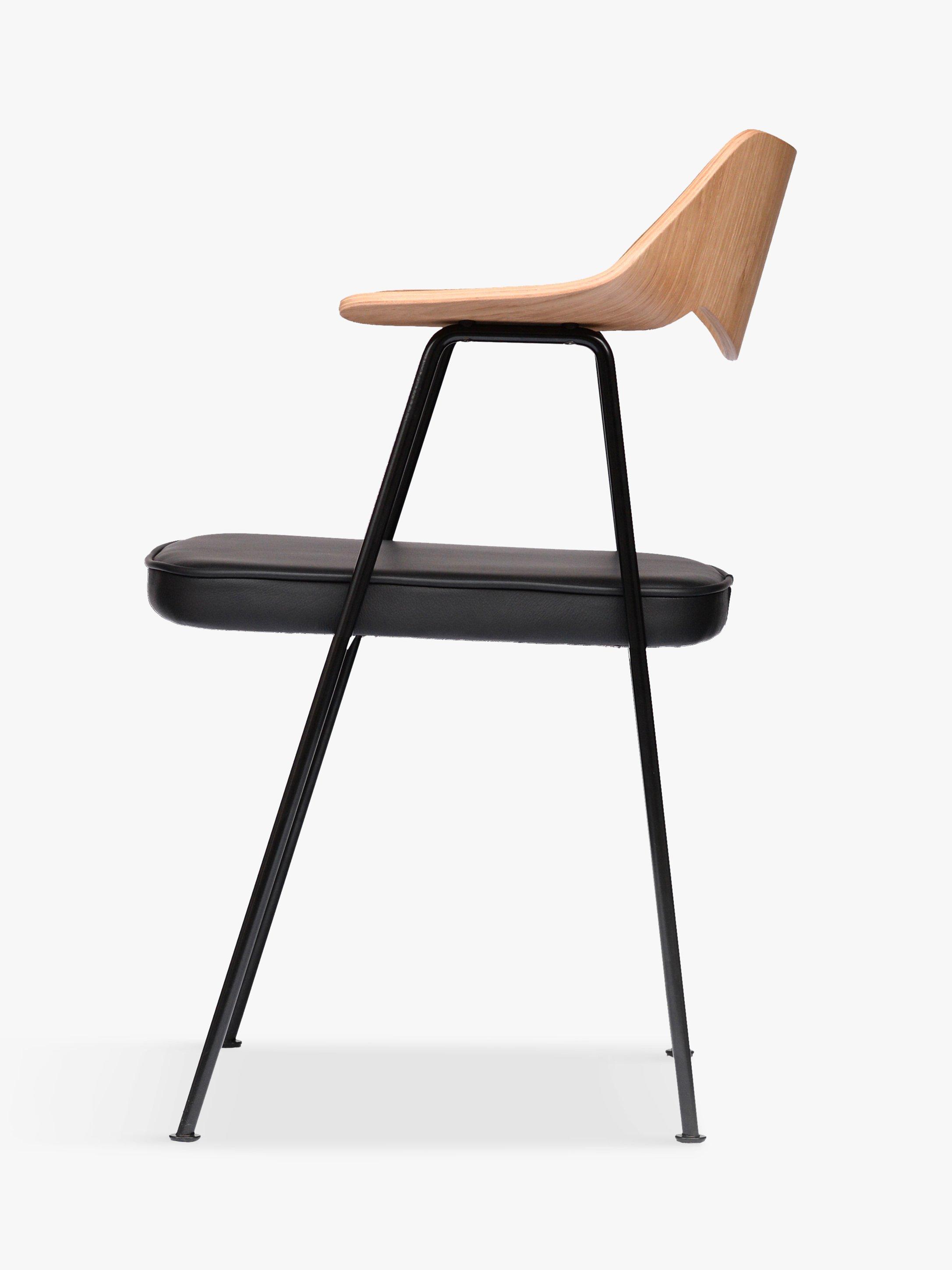 Finished with a walnut-veneered ply back, black powder-coated steel frame and black leather upholstered seat pad – in the words of Robin Day: ‘metal for strength and lightness ... wood for touch and appearance.’