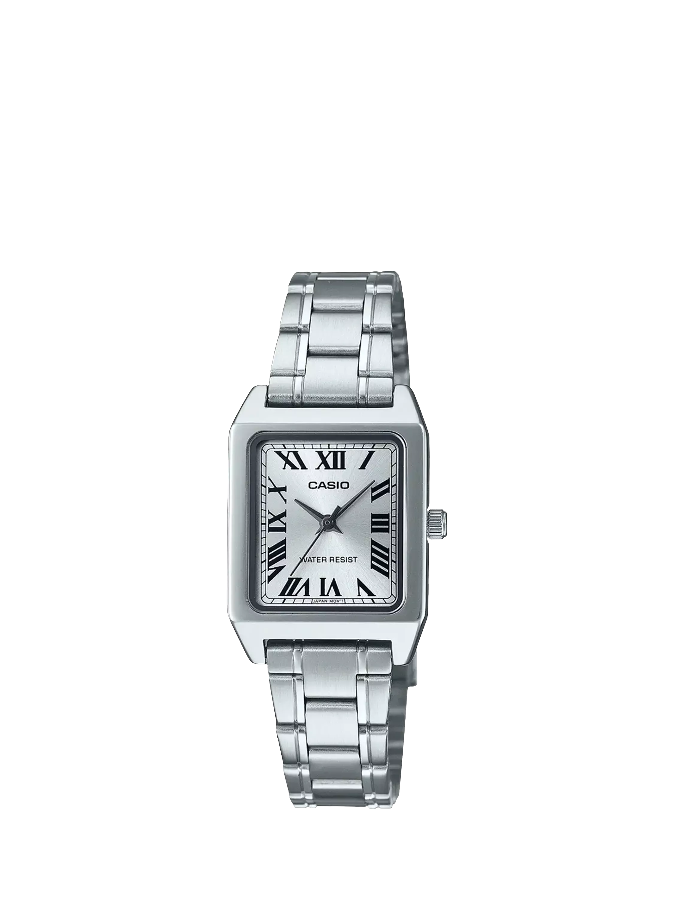 A bold, square version of Casio's classic metal analogue watch. The elegant face colour and roman numeral index are arranged to create a chic and elegant design.