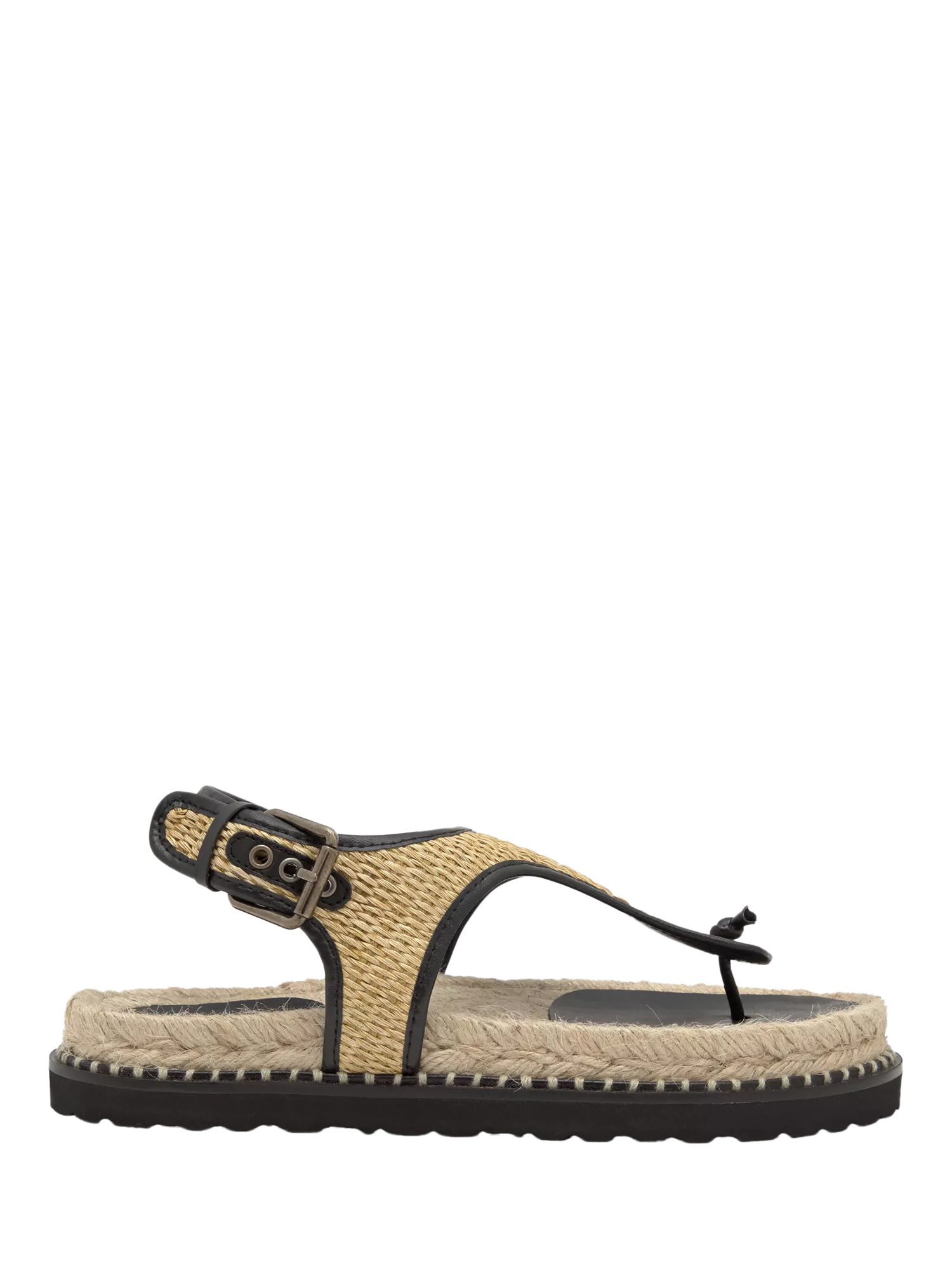 Flat open-toe thong sandal made of natural raffia. Can be worn to elevate any casual outfit.