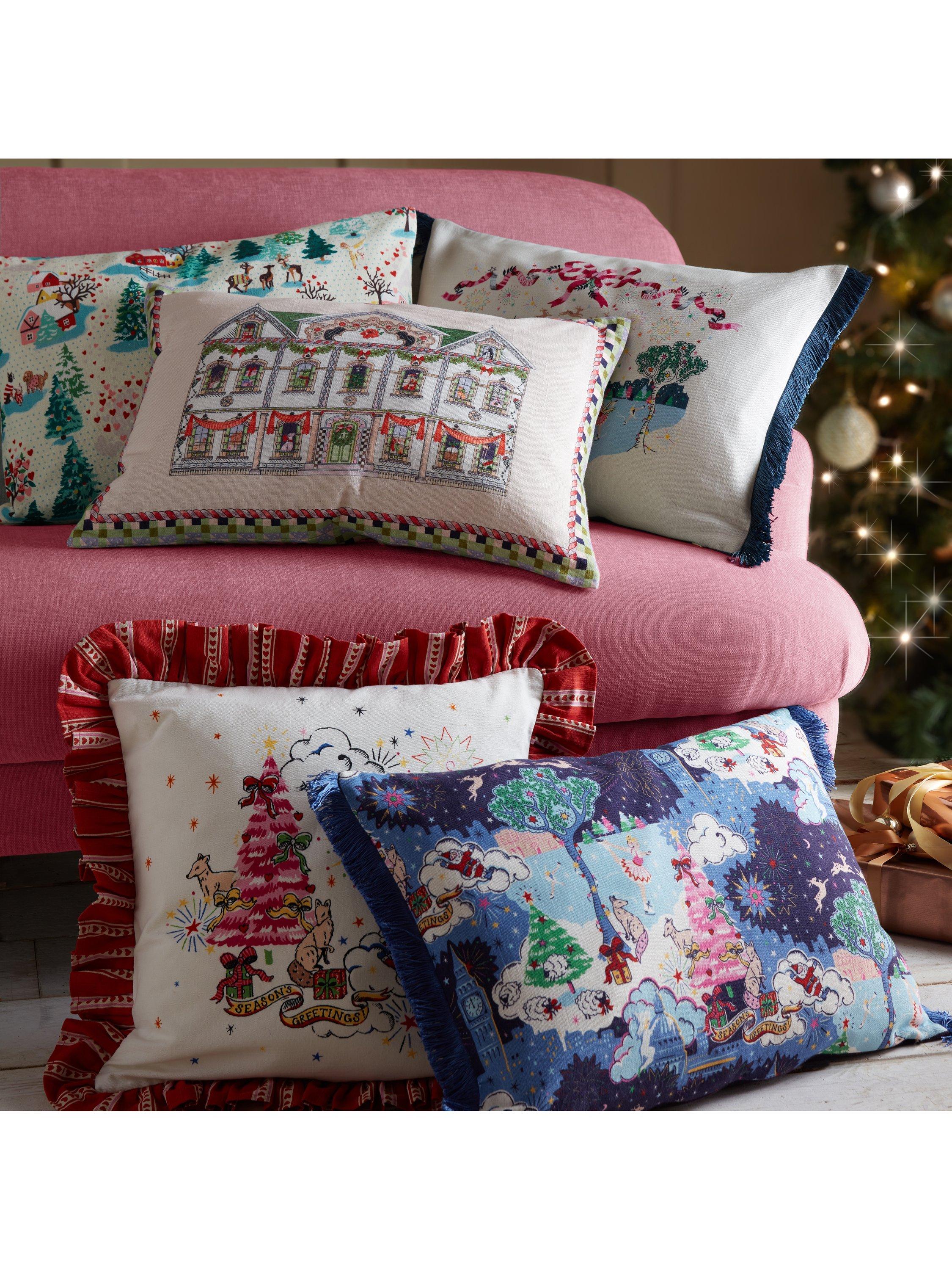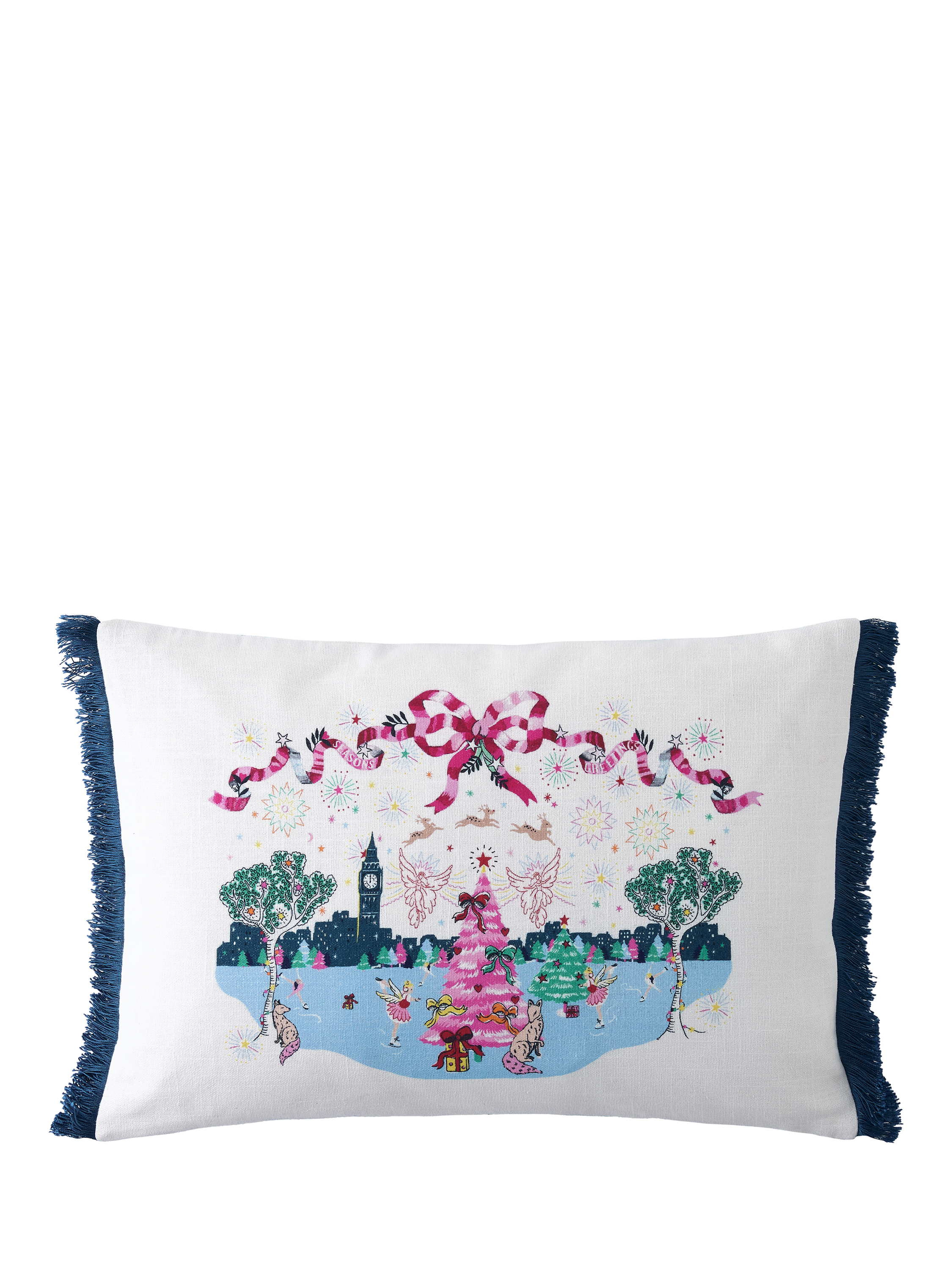 A beautiful hand painted winter scene is printed onto this soft cotton cushion. Cheerful figures elegantly skate around a joyful Christmas tree with an iconic London skyline. A pretty printed pink ribbon delicately frames the artwork whilst beautiful blue fringing detail finishes this cushion perfectly.