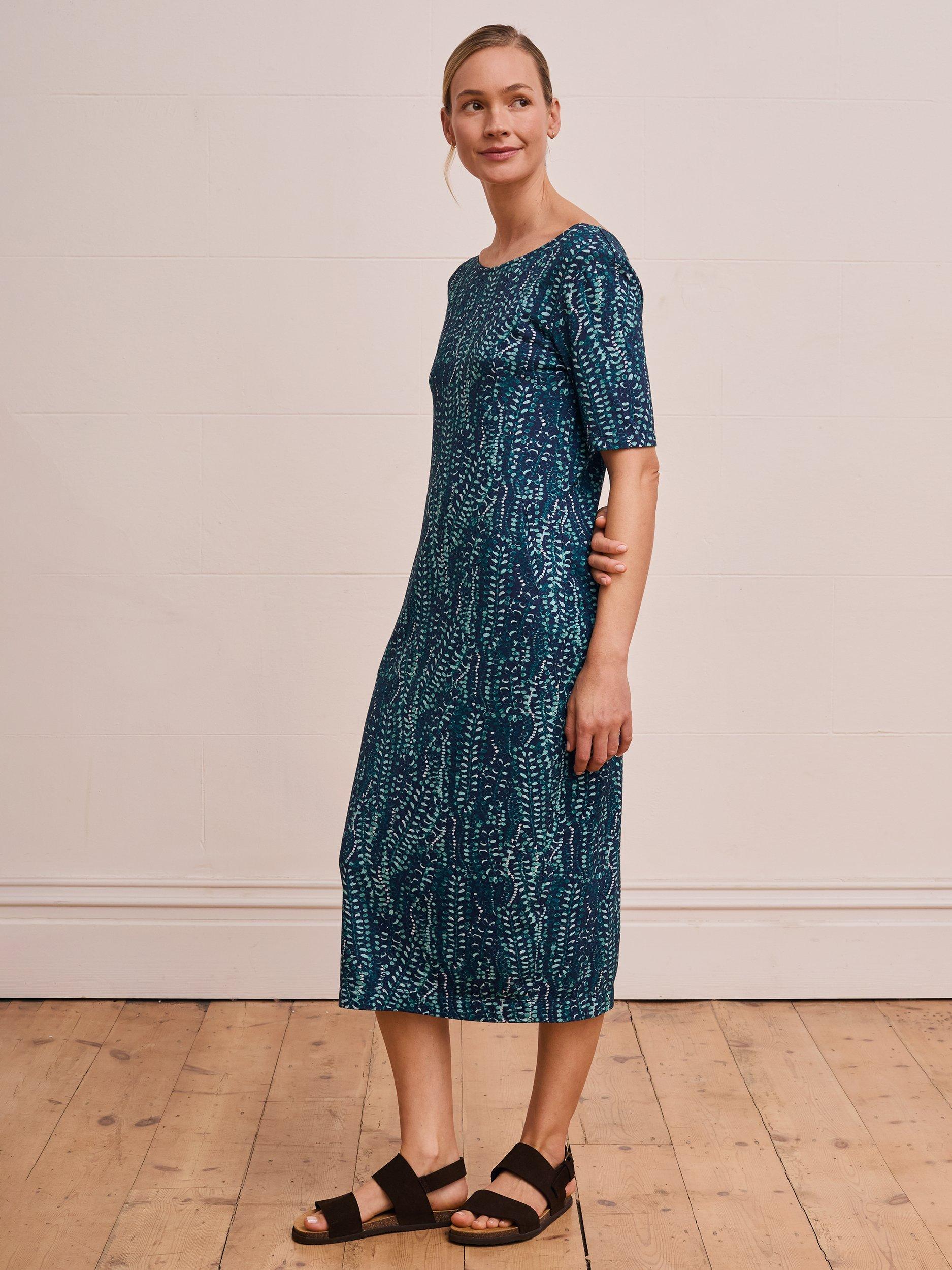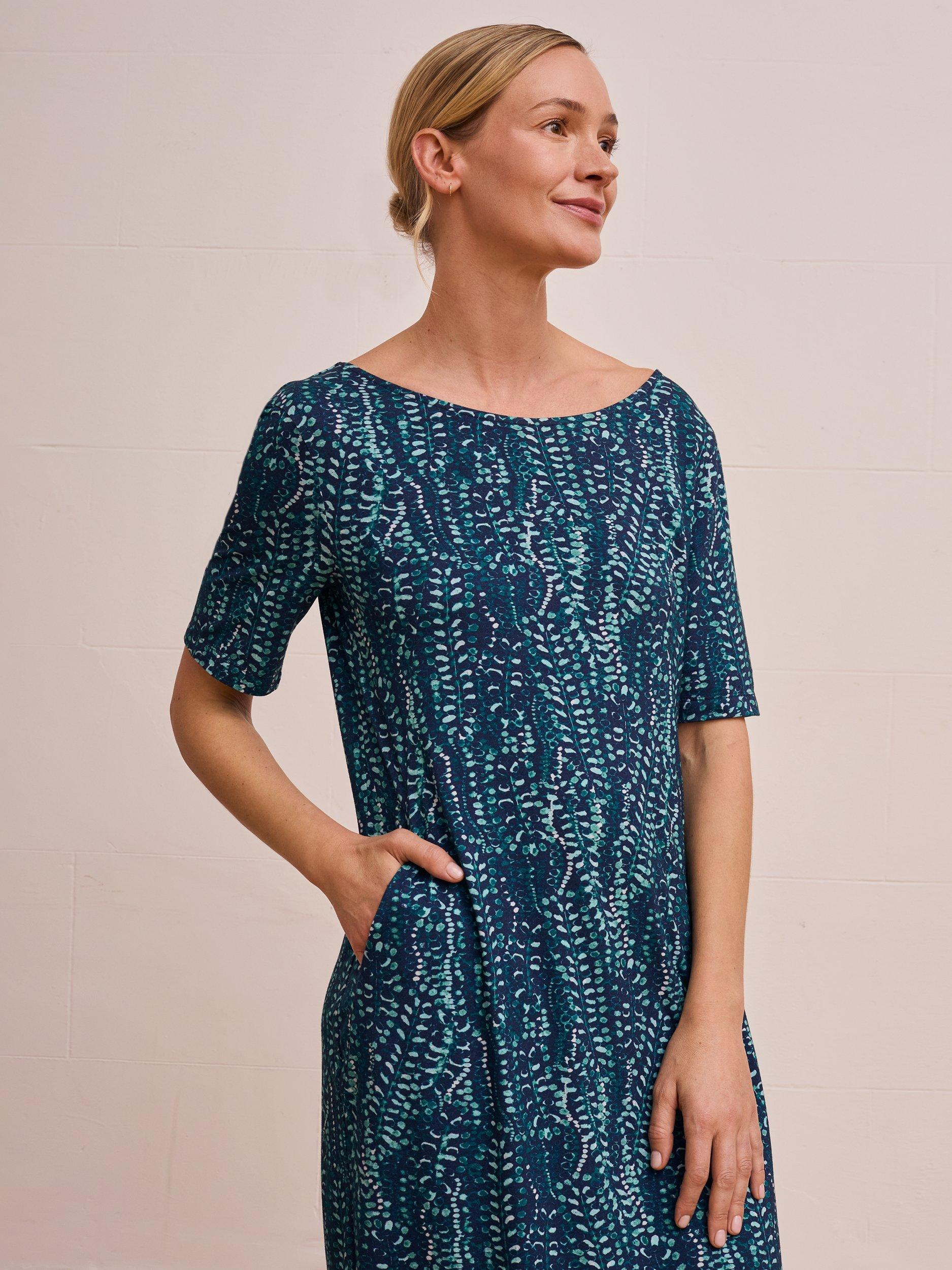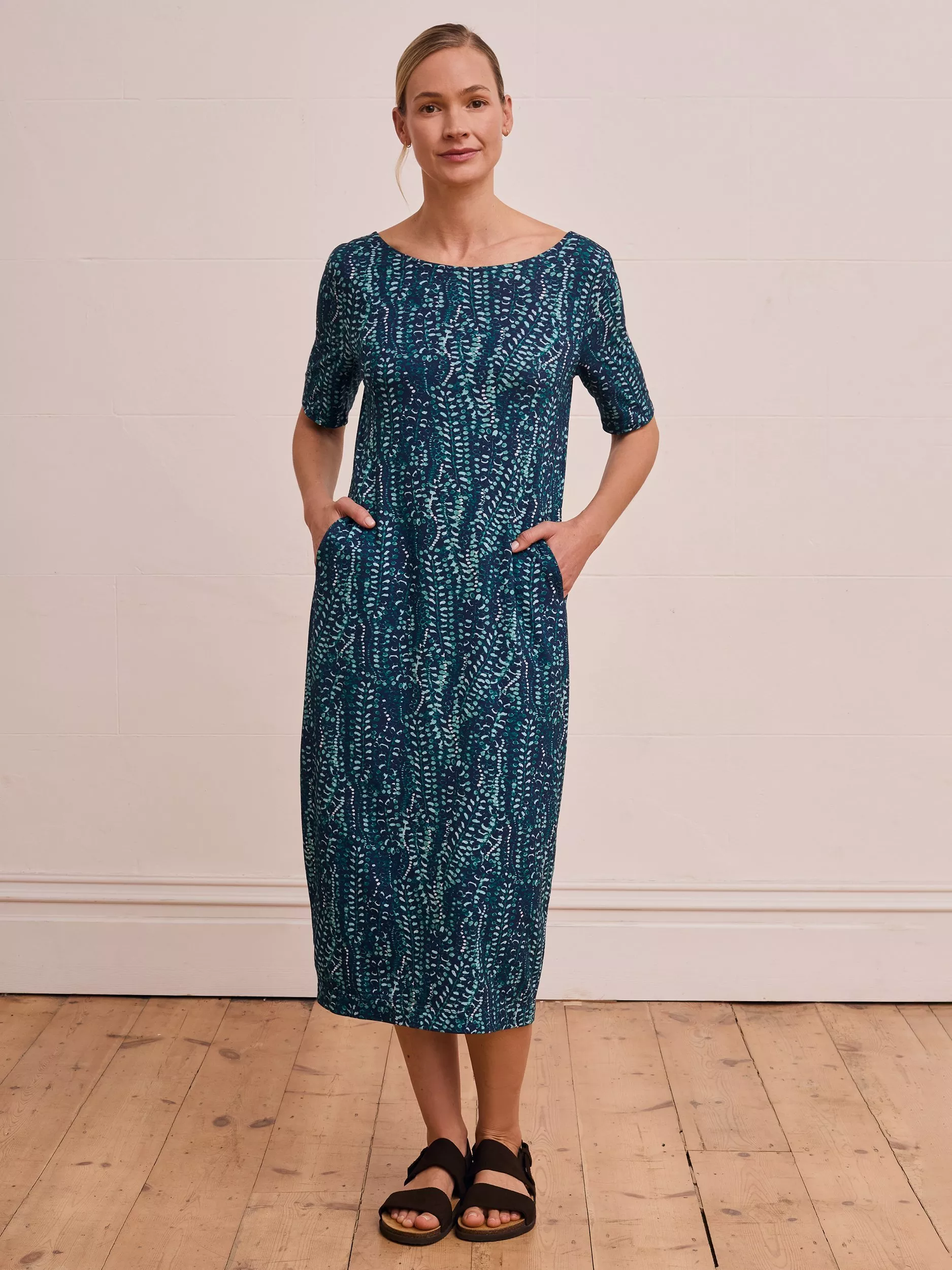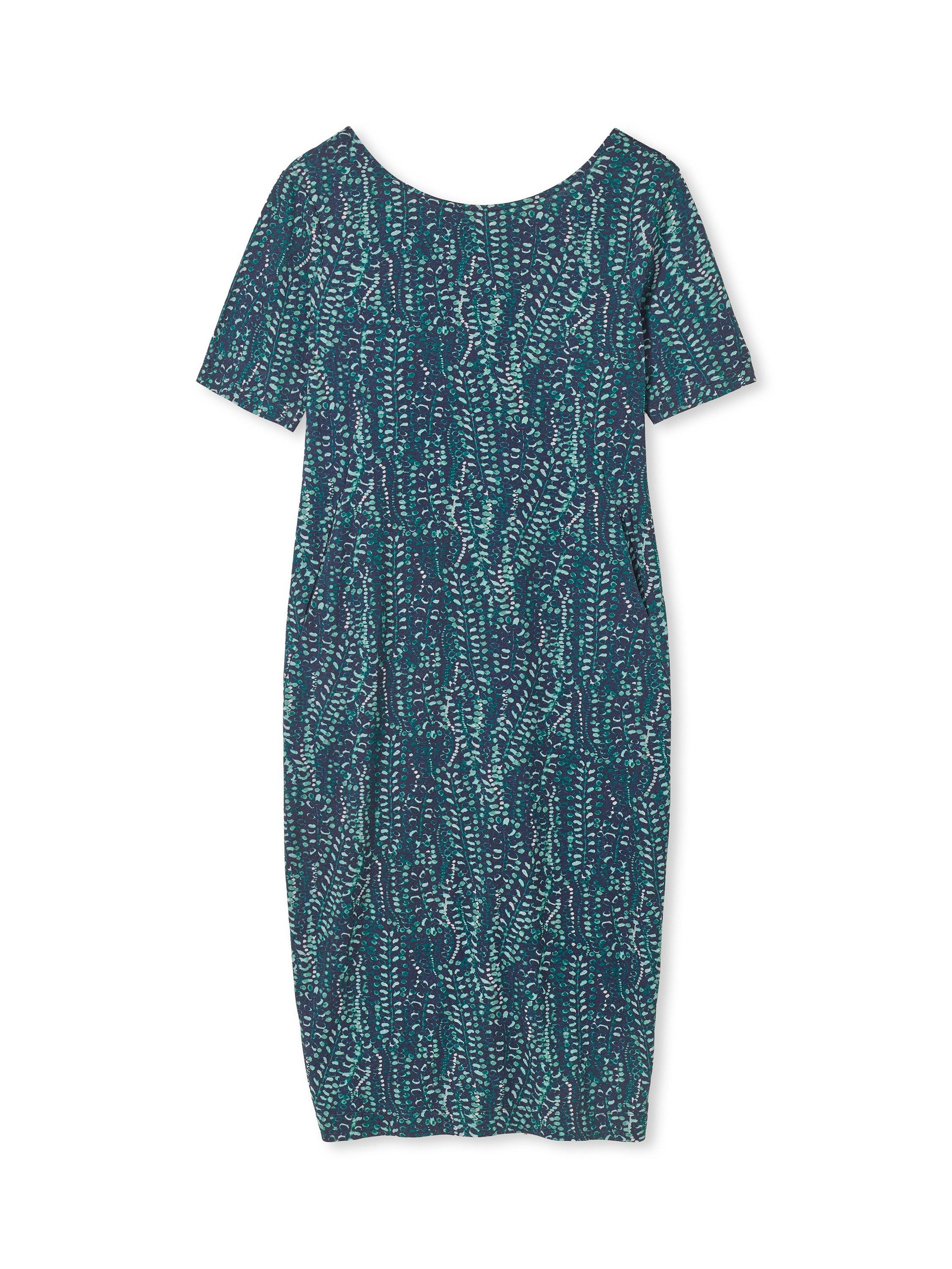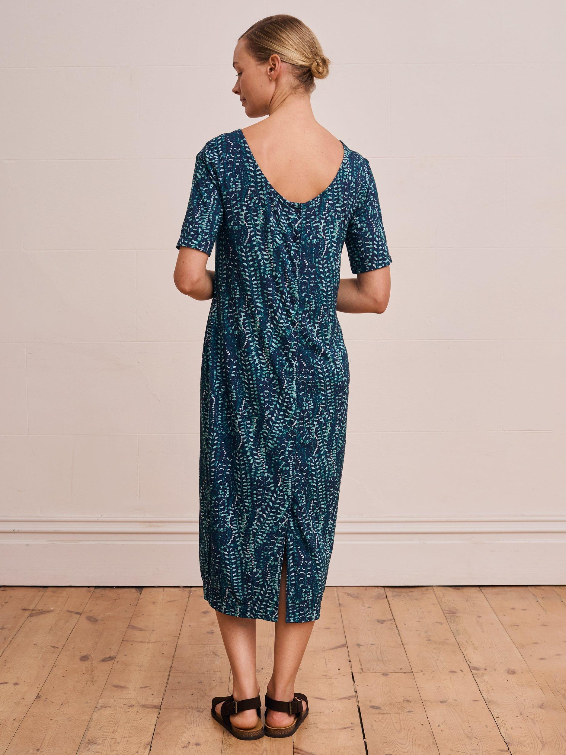 This fitted dress features a scoop neckline, short sleeves and pockets, designed with buttons on the back for subtle interest.
