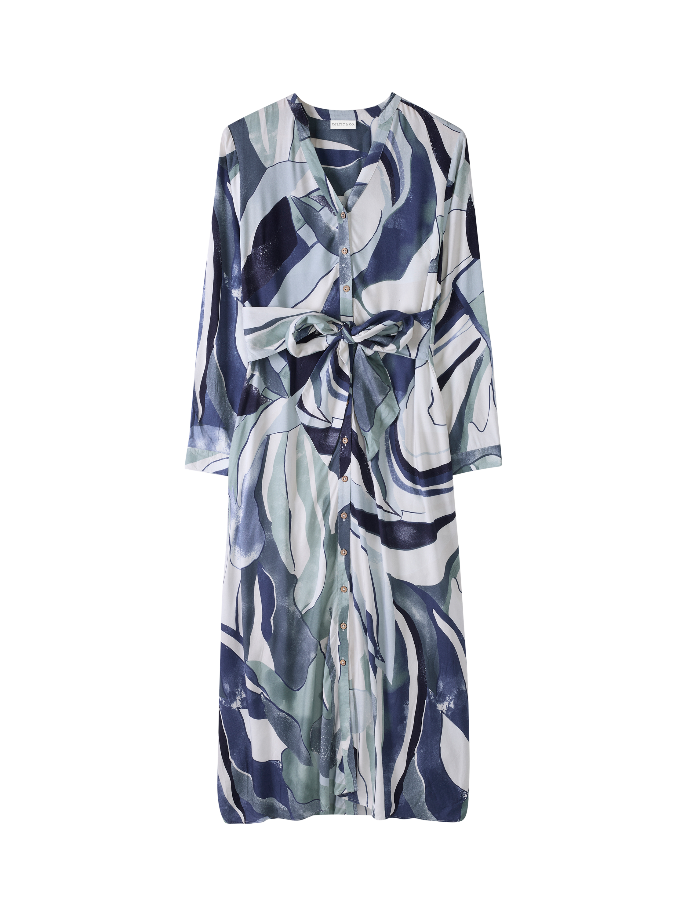 Made from a light and airy fabric that drapes beautifully, this button through midi dress has a full, flowing skirt. It can be tied at the front or back, and features a v-neckline with stand collar detailing, and long sleeves with cuff and button fastenings.