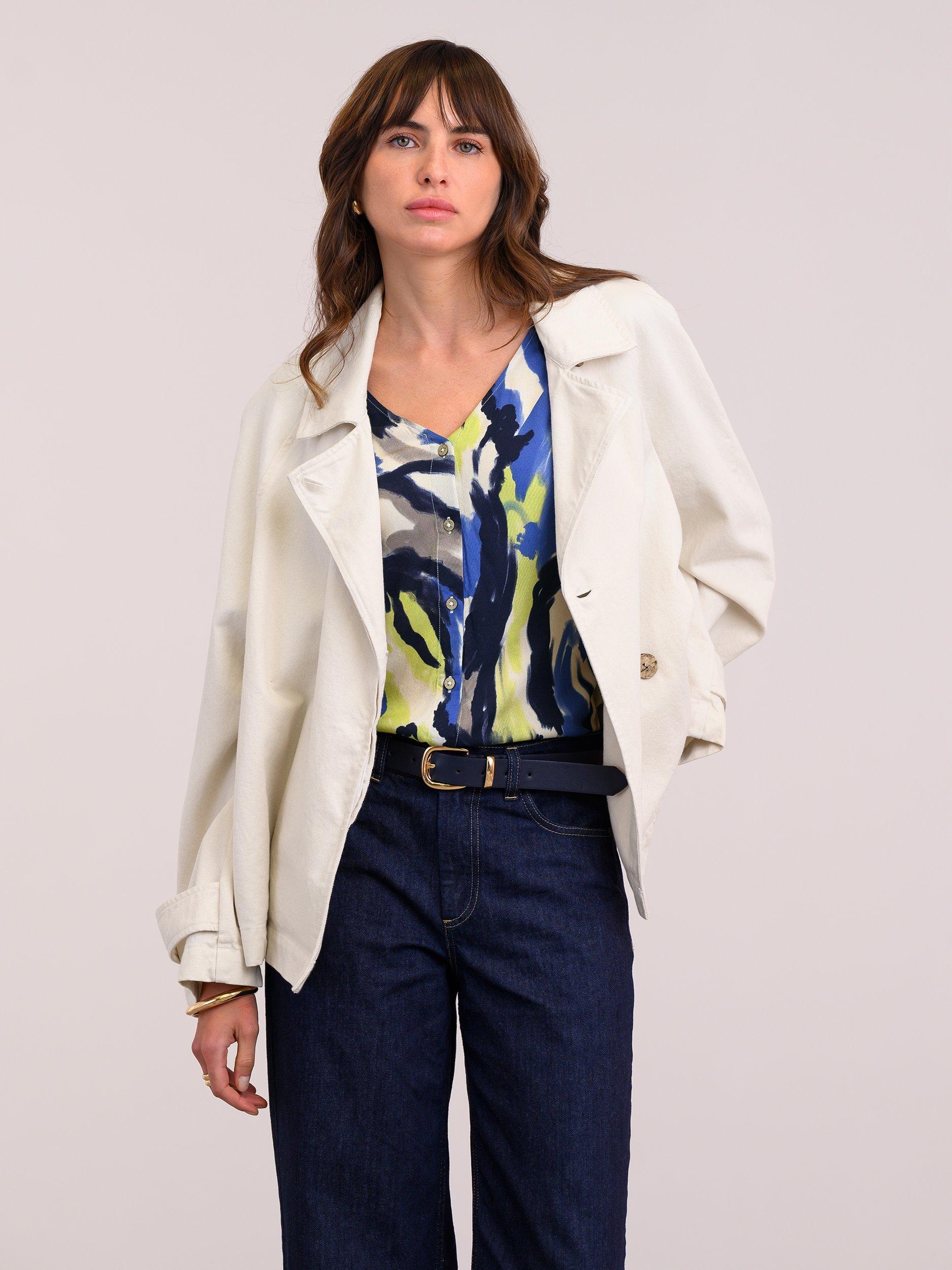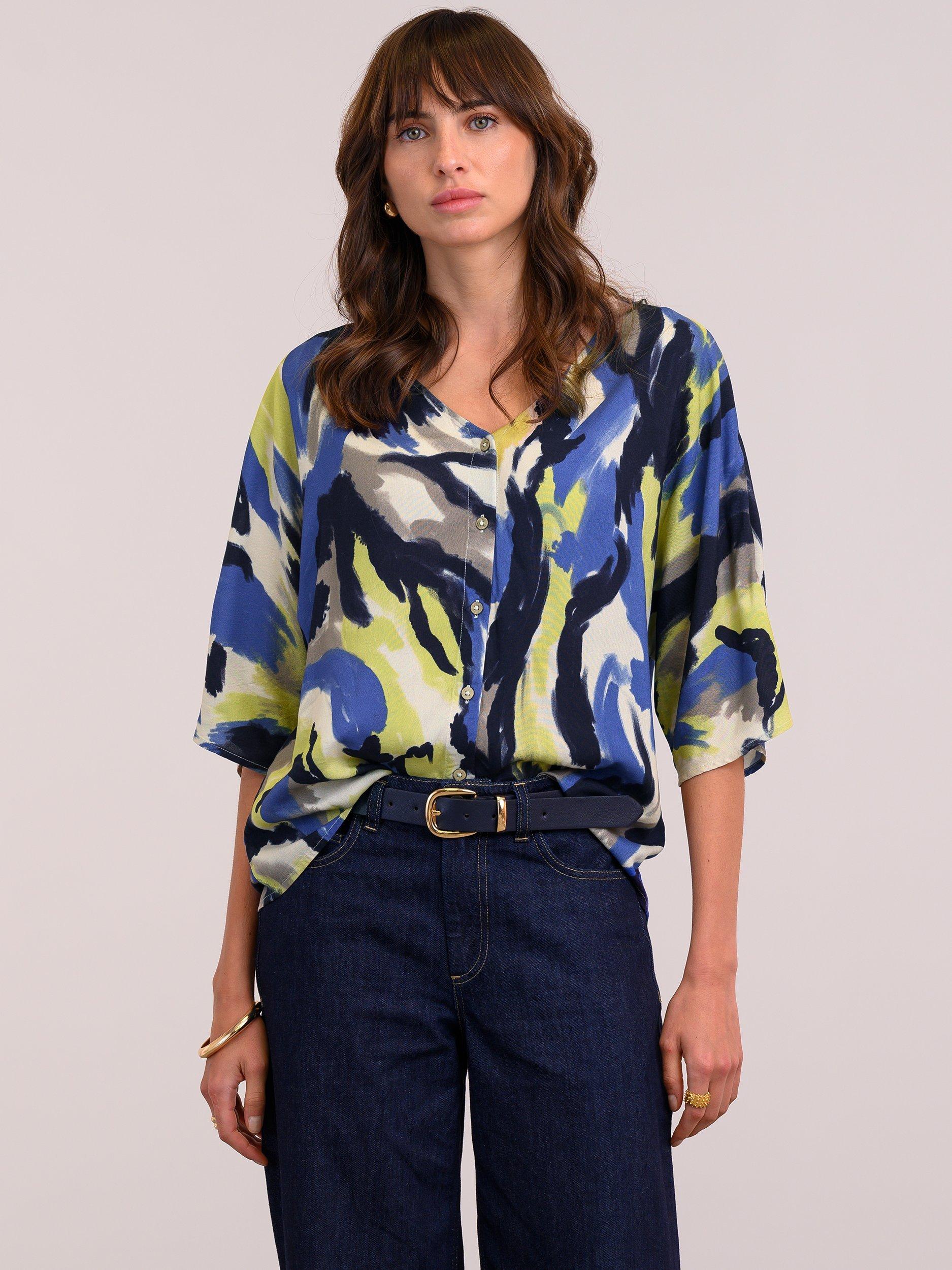 With a V neckline and drop shoulder boxy fit, this button-through top combines comfort and style. The coconut buttons add a natural touch, making it an ideal choice for both casual outings and relaxed wear.
