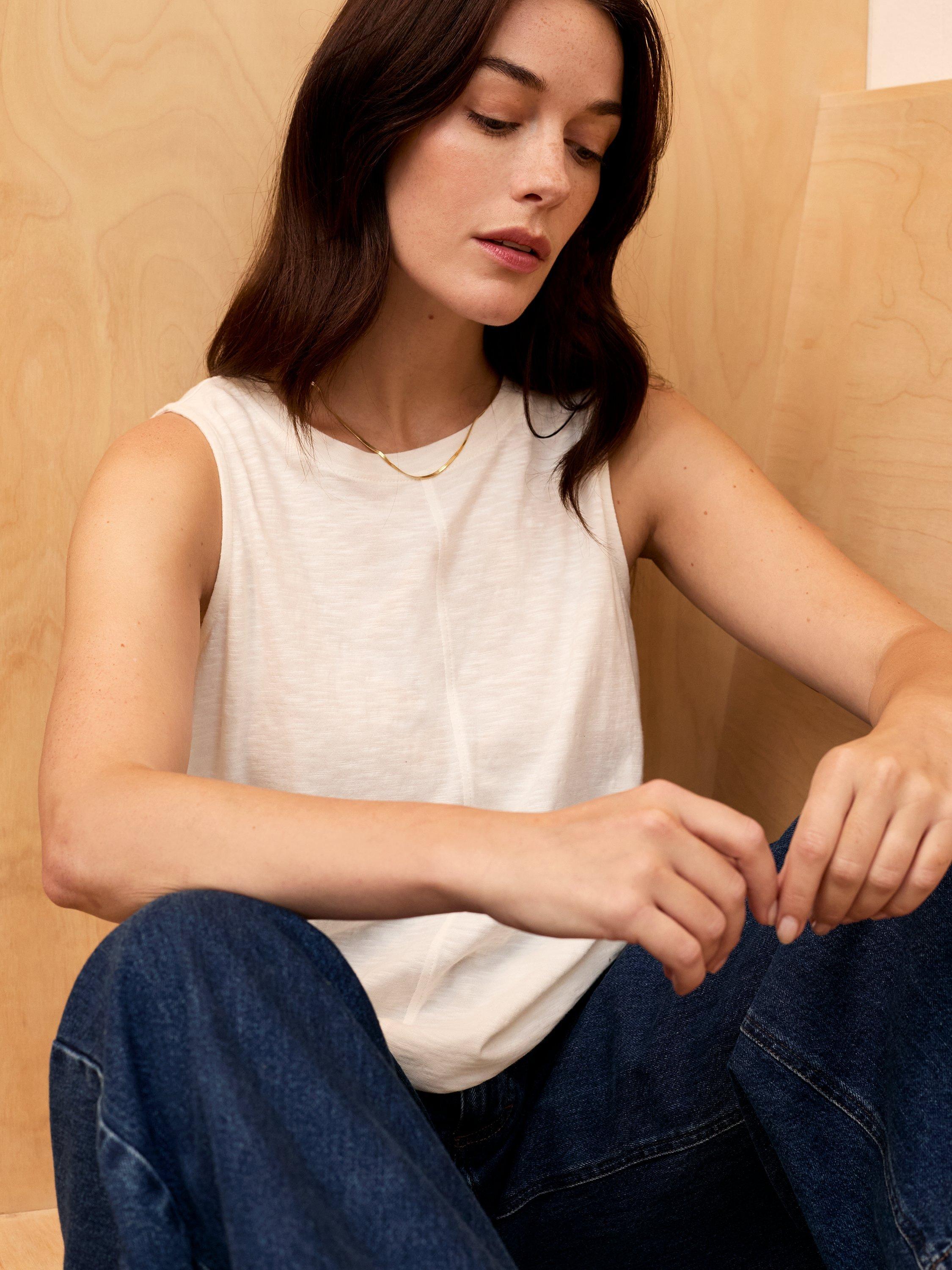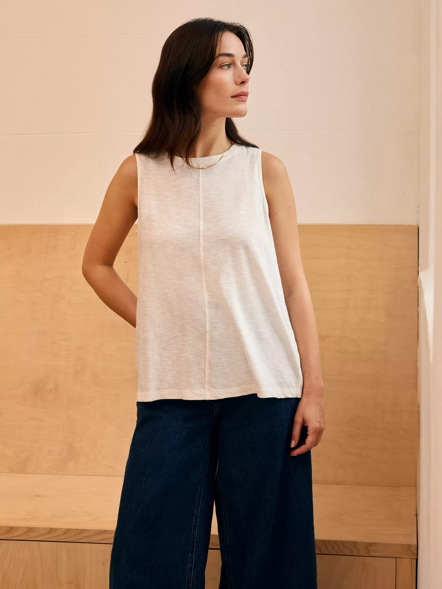 This sleeveless tank features a crew neckline and a flattering swing shape, making it a versatile piece for warm days. Crafted from cotton, it offers comfort and breathability, perfect for casual outings or layered looks.