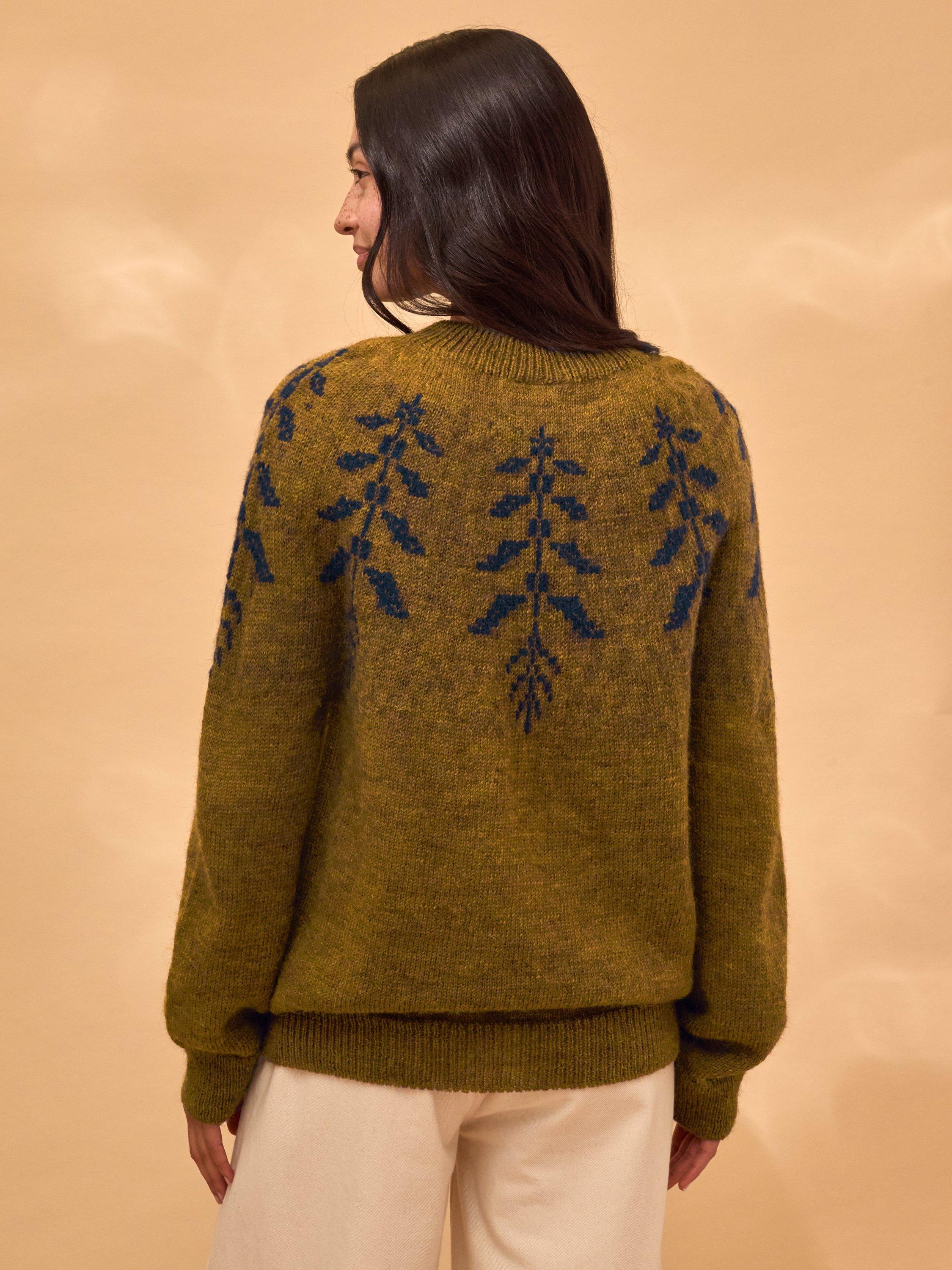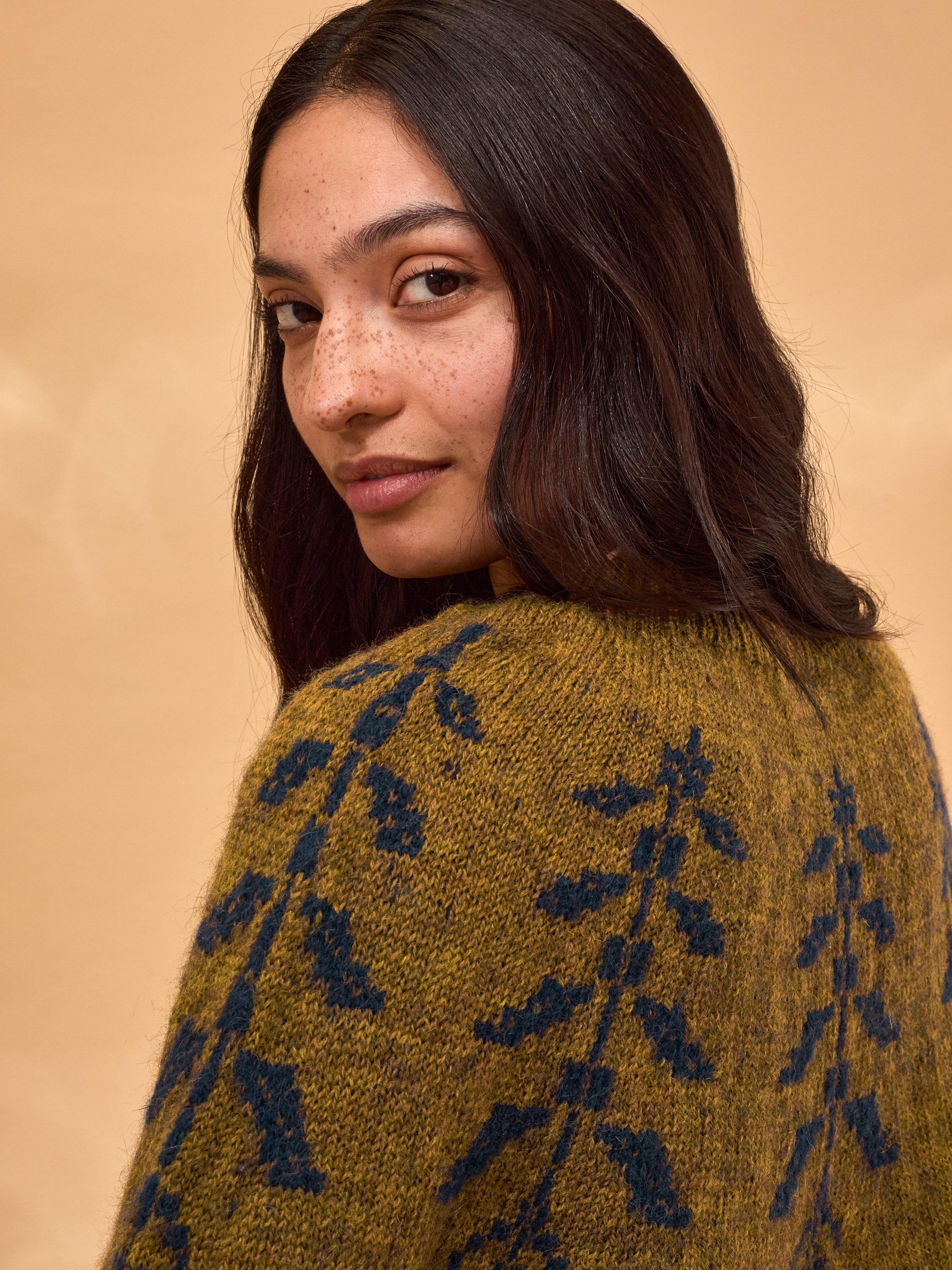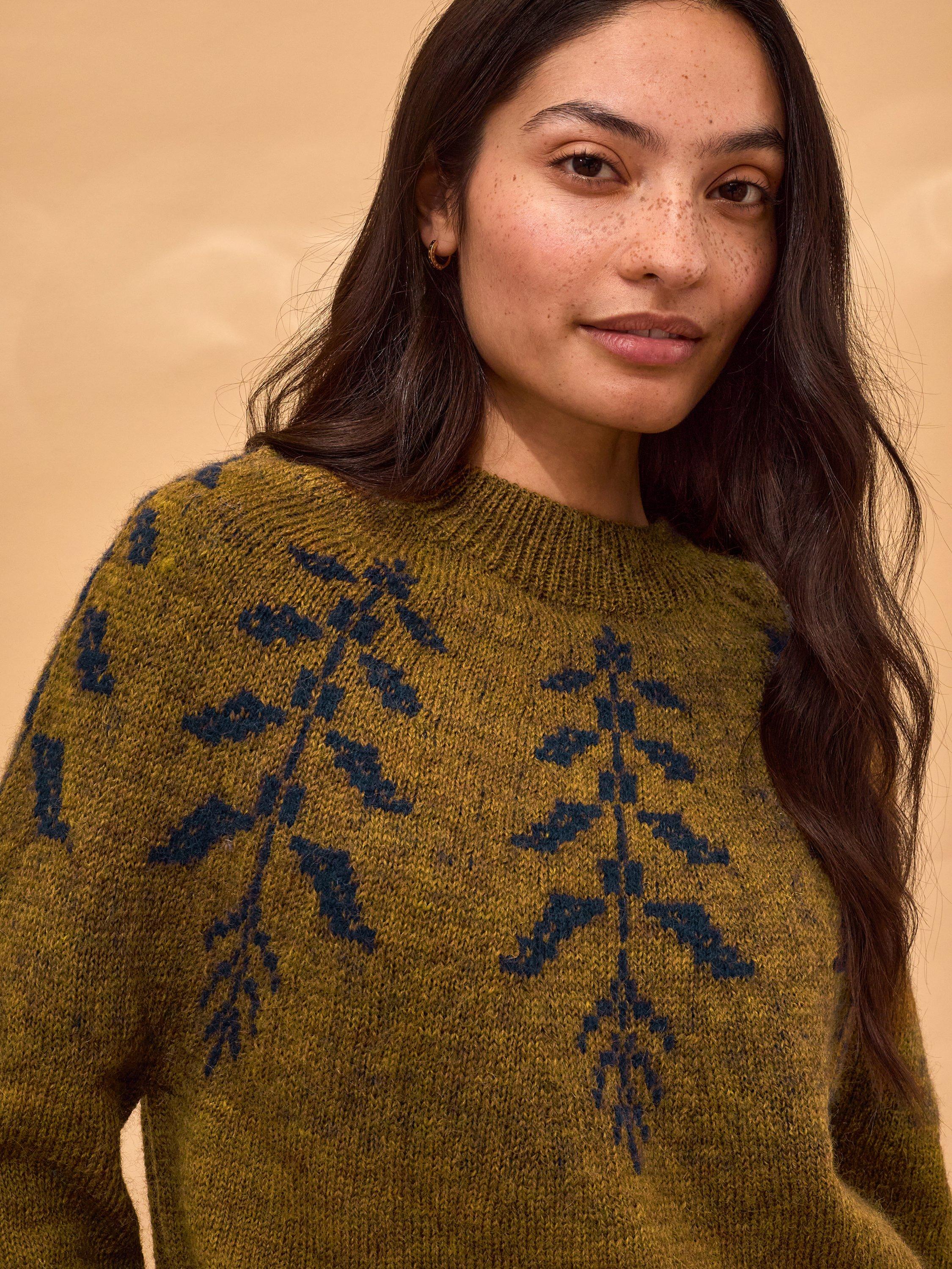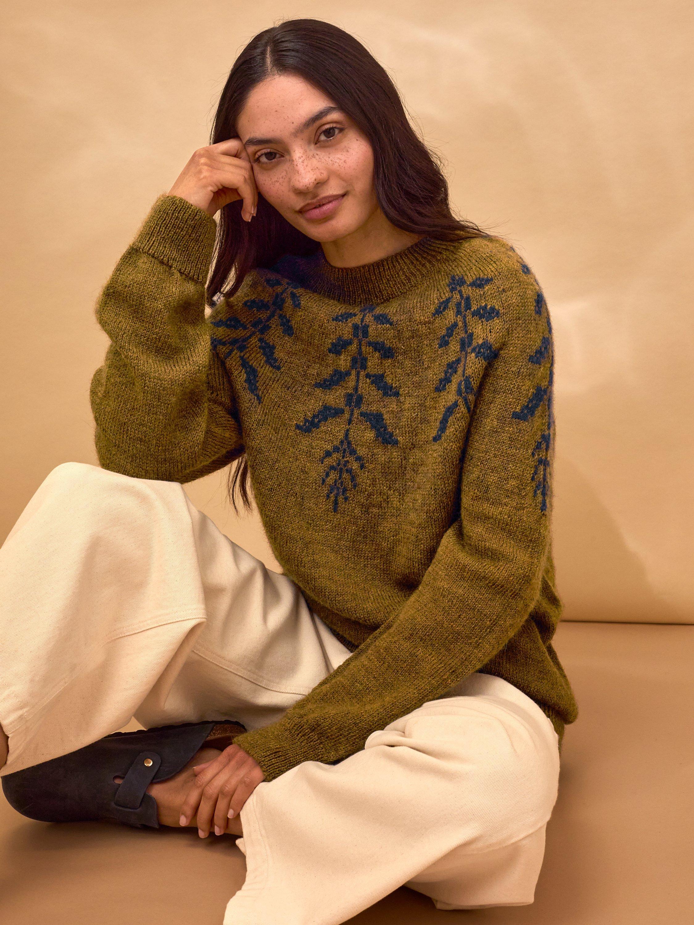 Wrap up in heritage style with this slouchy-fit jumper, crafted from 100% British wool. Featuring a botanical leaf jacquard design across the yoke, it’s finished with a classic crew neck and ribbed trims. Proudly made in Britain using a British end-to-end supply chain for quality you can feel.