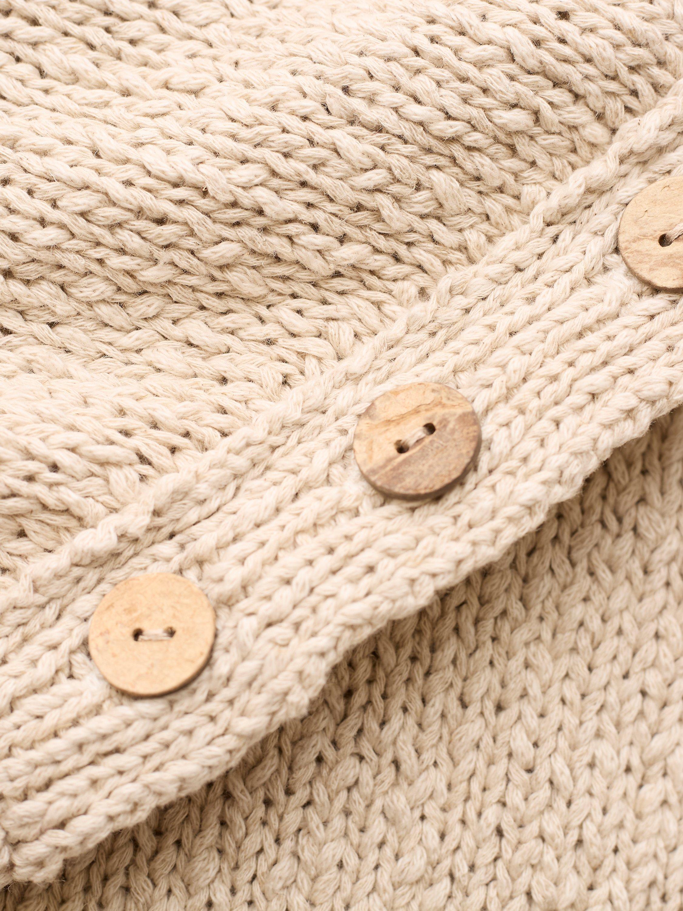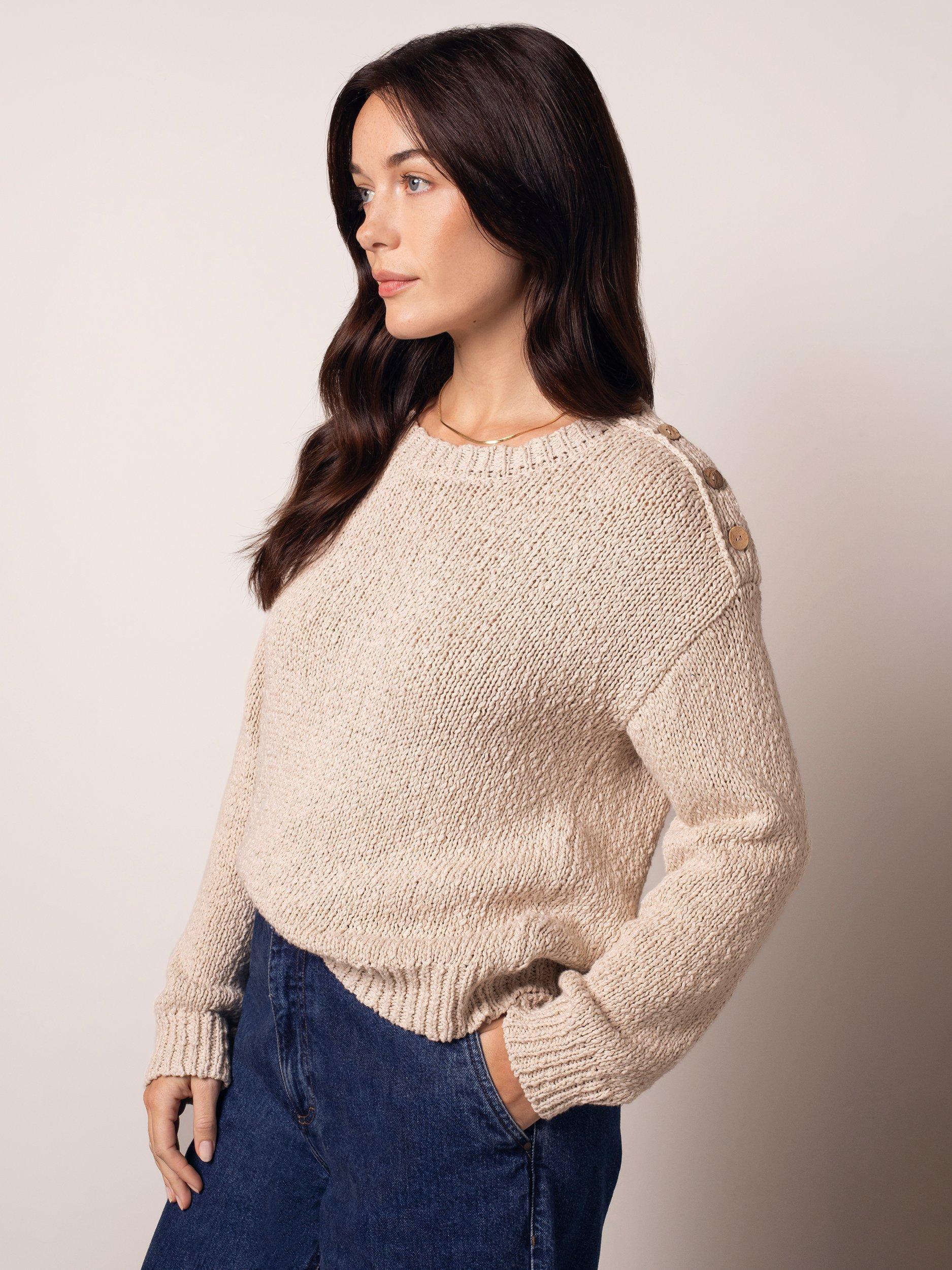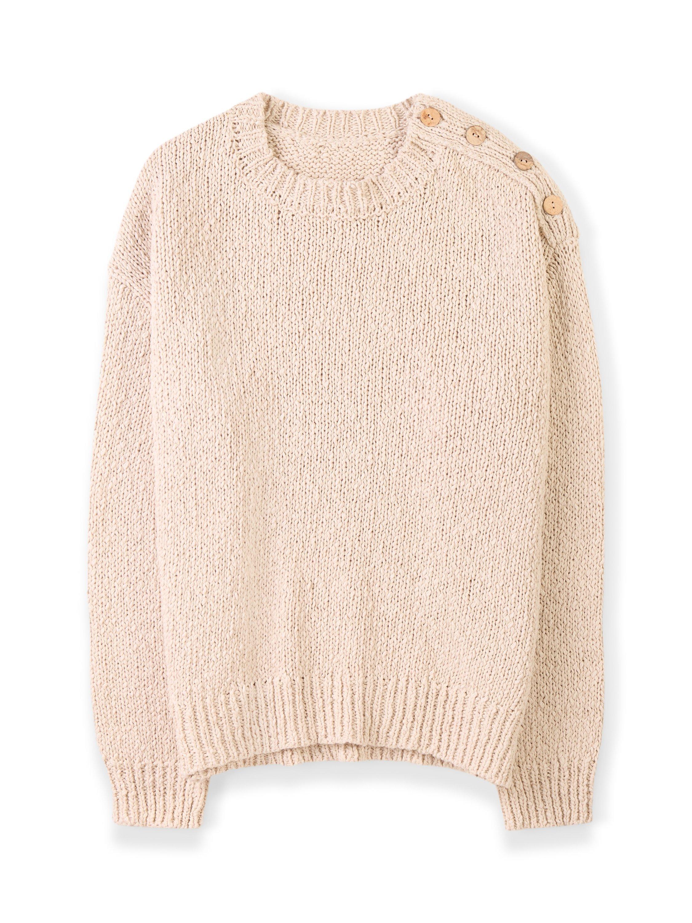 Crafted in slub yarns and trimmed with functioning buttons at the left shoulder for a little extra detail.