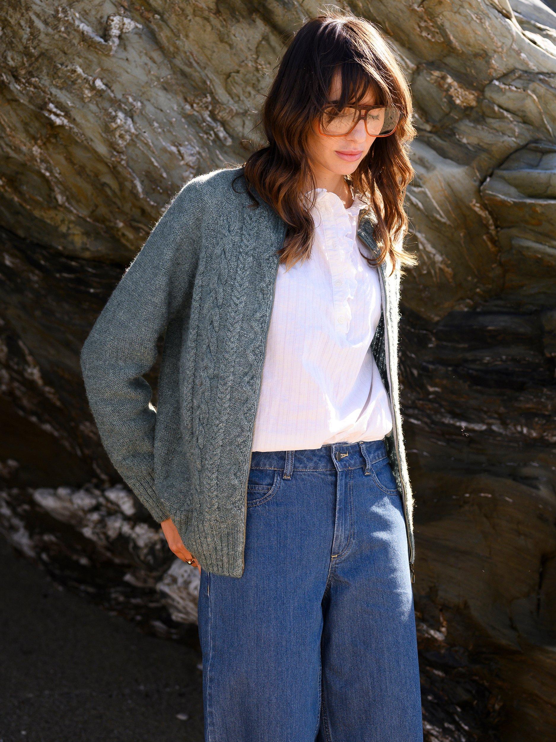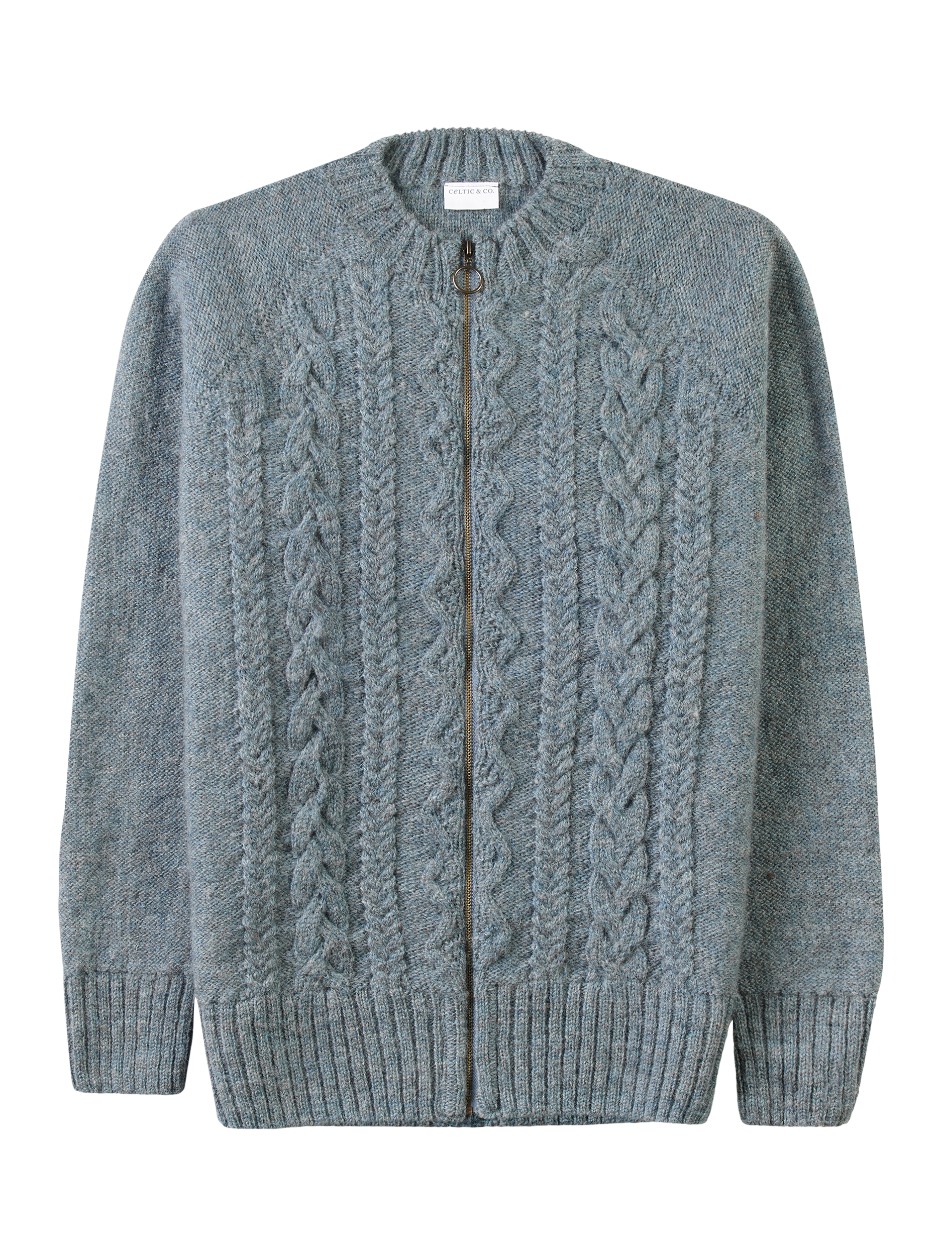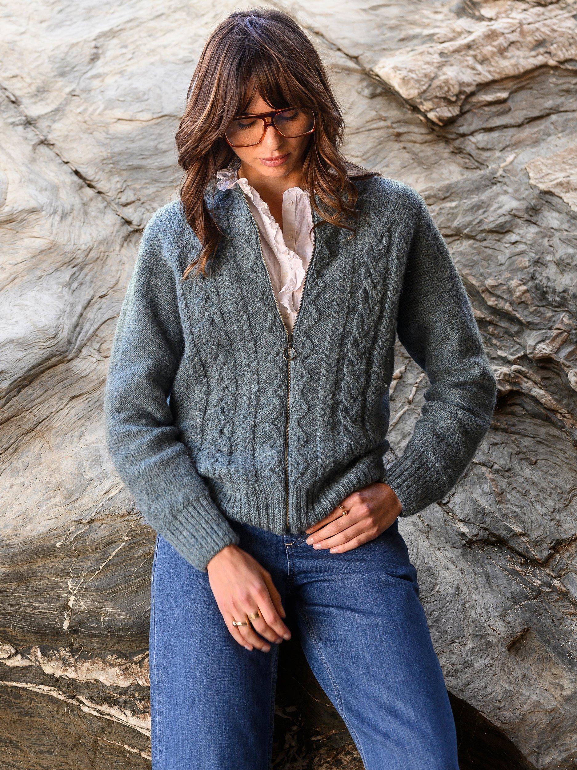 From farm to factory, this Cable Zip Cardigan is produced entirely in Britain! The colour way of this cardigan is totally natural as no dyestuffs were used in the process of creating the yarn. Natural fibres allow your skin to breathe whilst keeping you warm in winter. Details include cabling running down the body, a crew neck, ribbed cuffs, collar and hem and a metal zip down the centre.