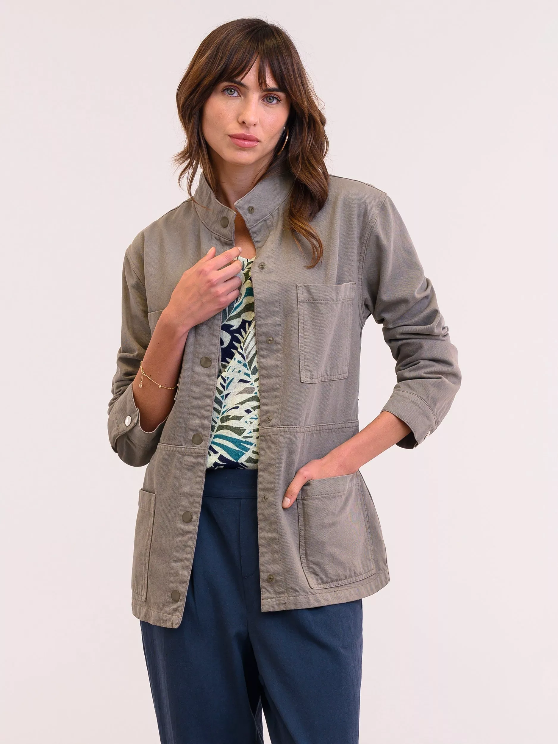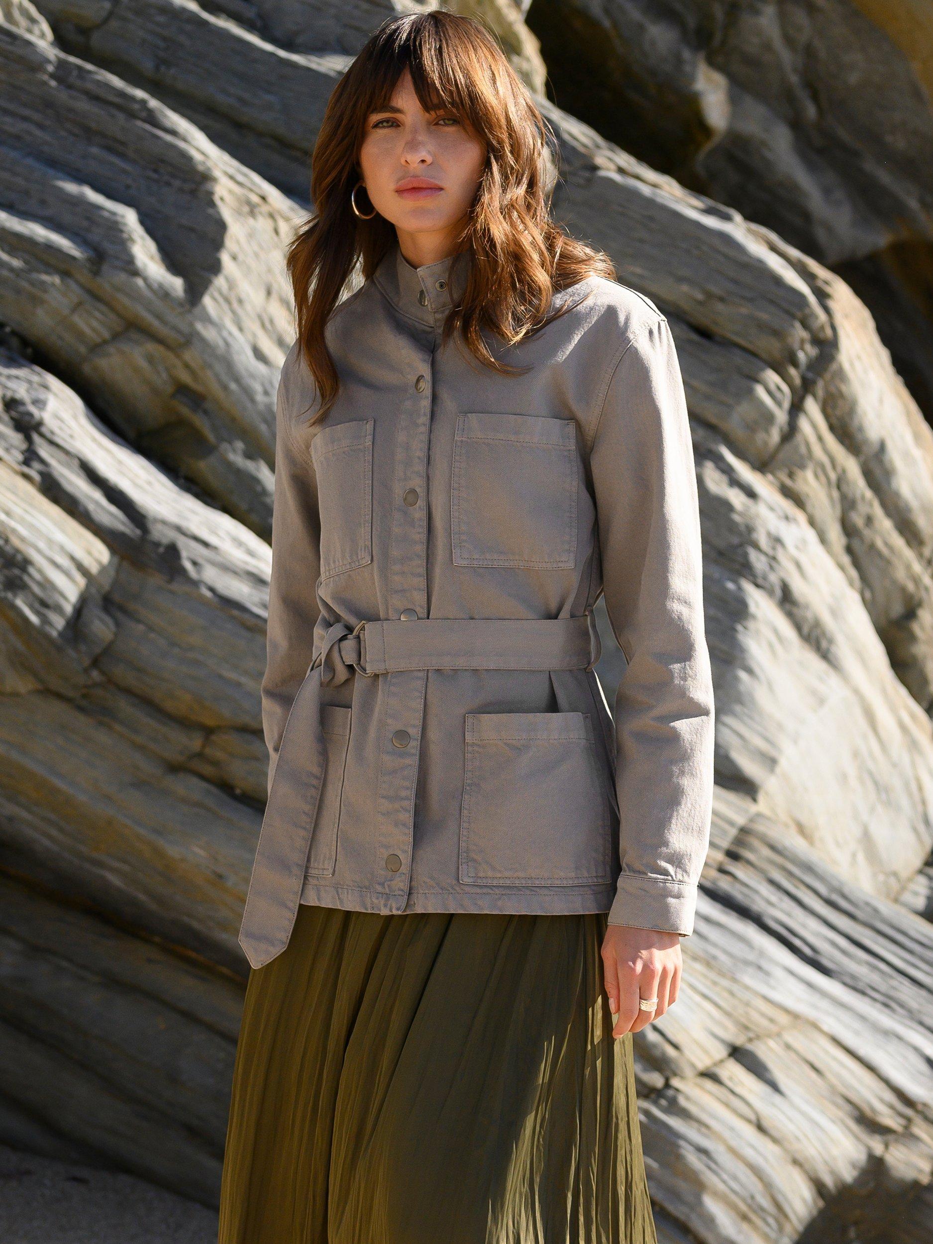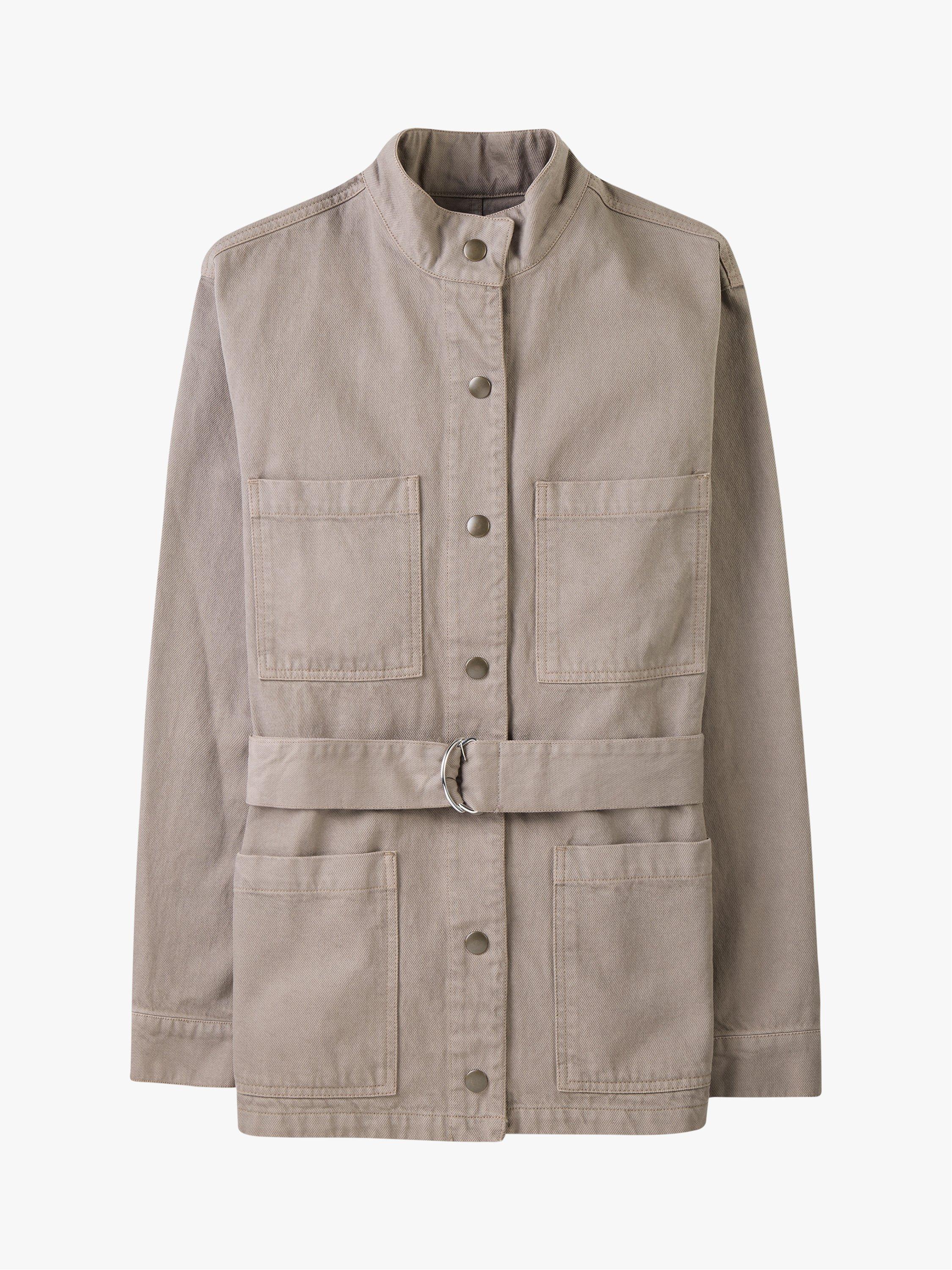 This straight-fit jacket features a stand collar neckline and metal popper fastenings, complemented by a D ring self-belt to cinch in for a more tailored look. Made from canvas, it combines practicality with a touch of sophistication, ideal for layering.