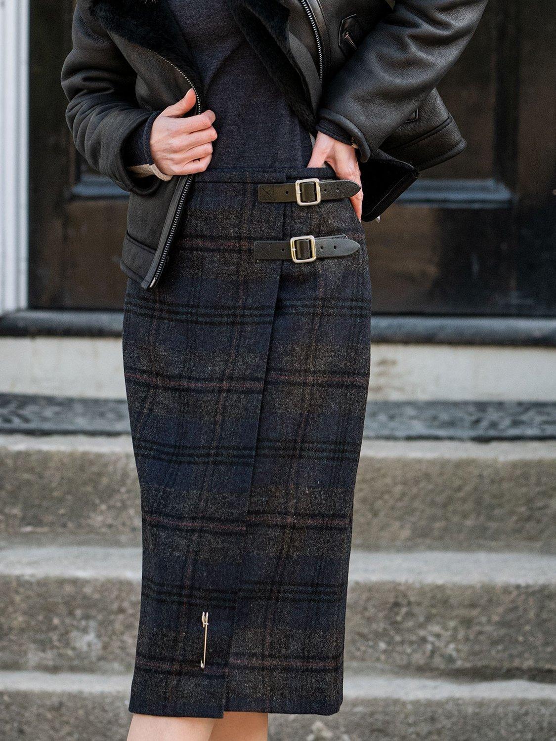 Celtic & Co.'s best-loved kilt, but in a trending midi length to fall around mid calf. The longer cut makes this the ideal foundation for building a modern winter look with hints of the traditional. Expertly crafted for Celtic & Co. by one of the last remaining kilt manufacturers in Scotland, this fully lined kilt is made in pure wool with a wrapped design and twin leather straps for an adjustable fit at the waist.
