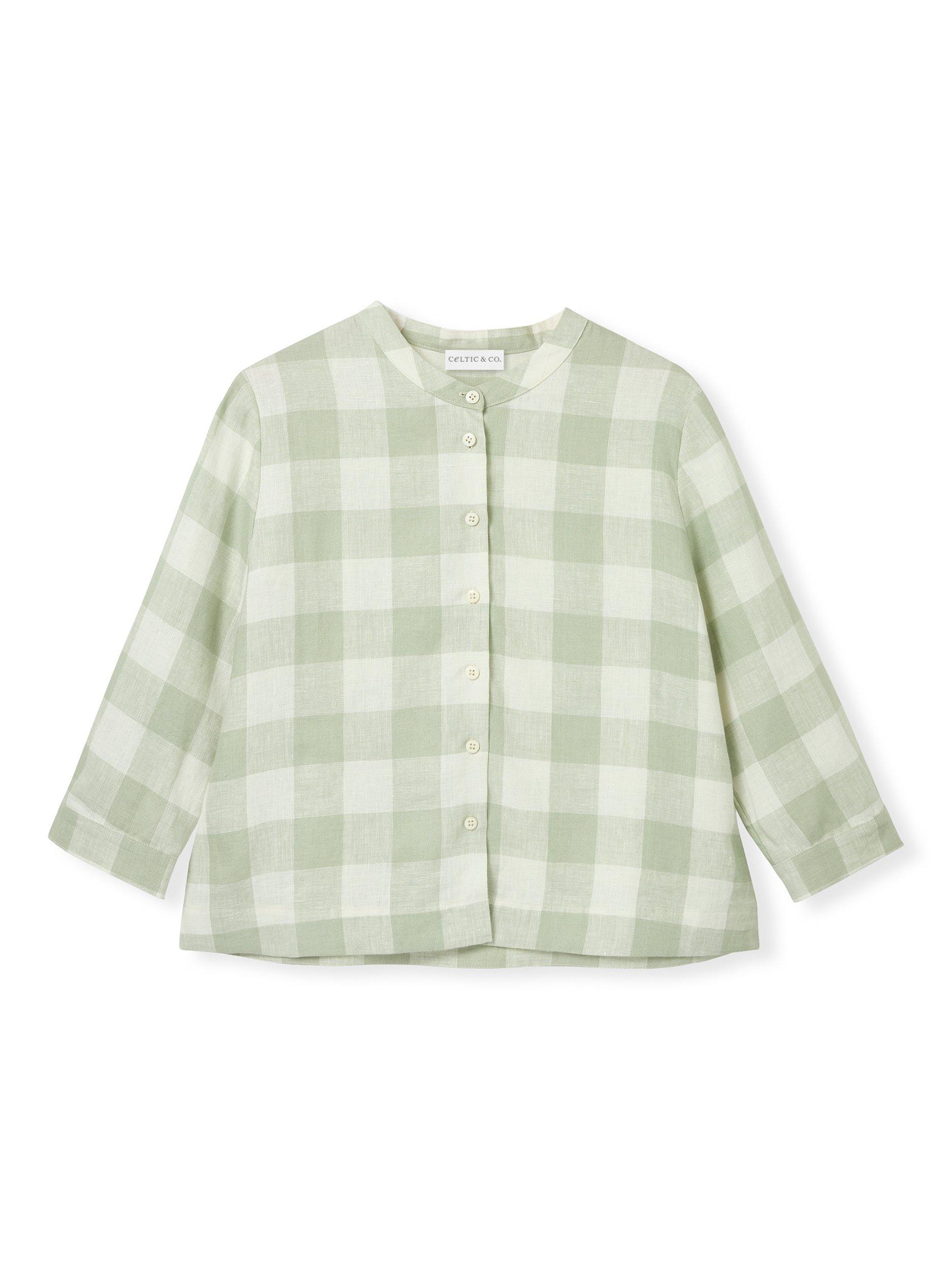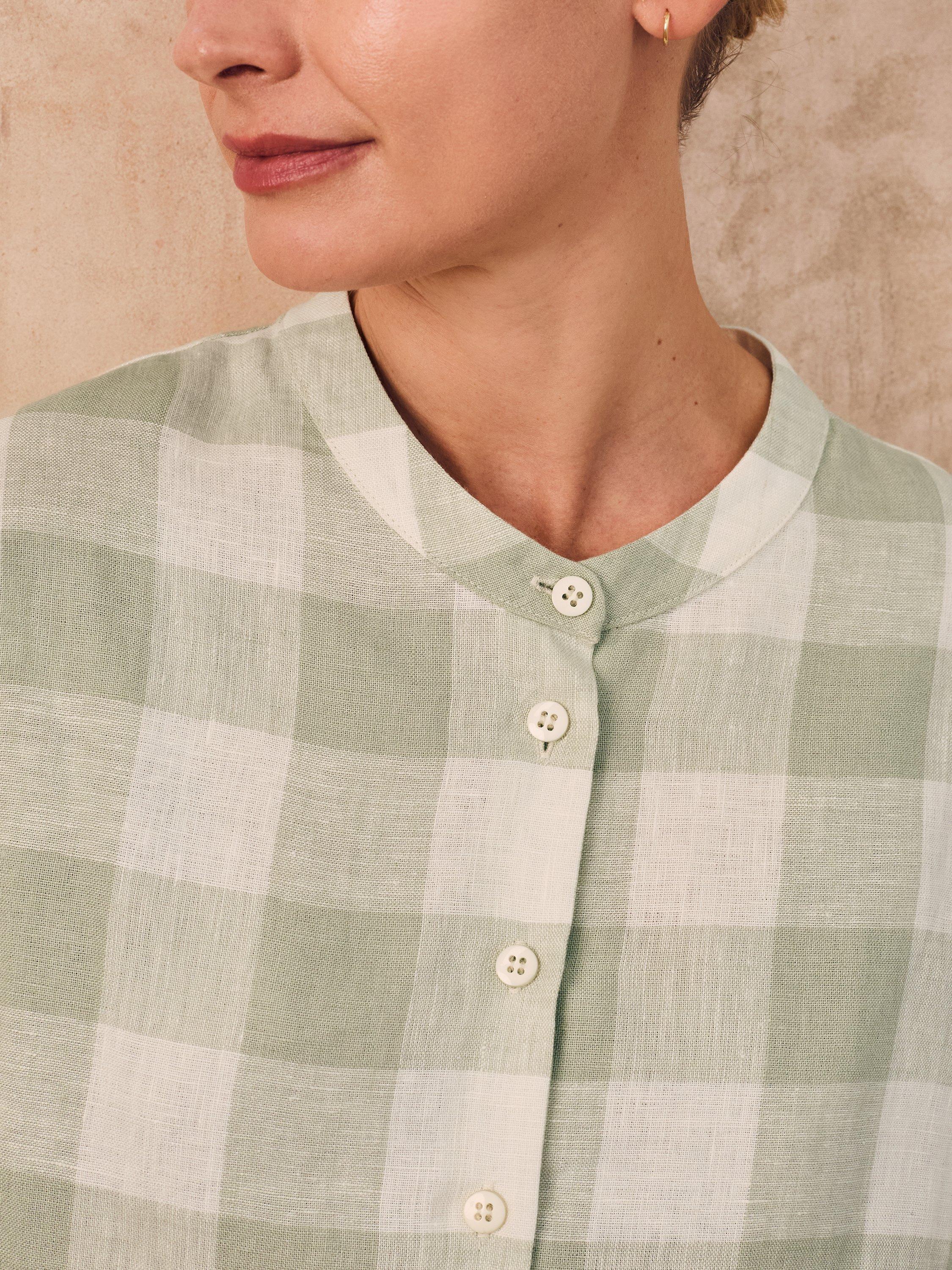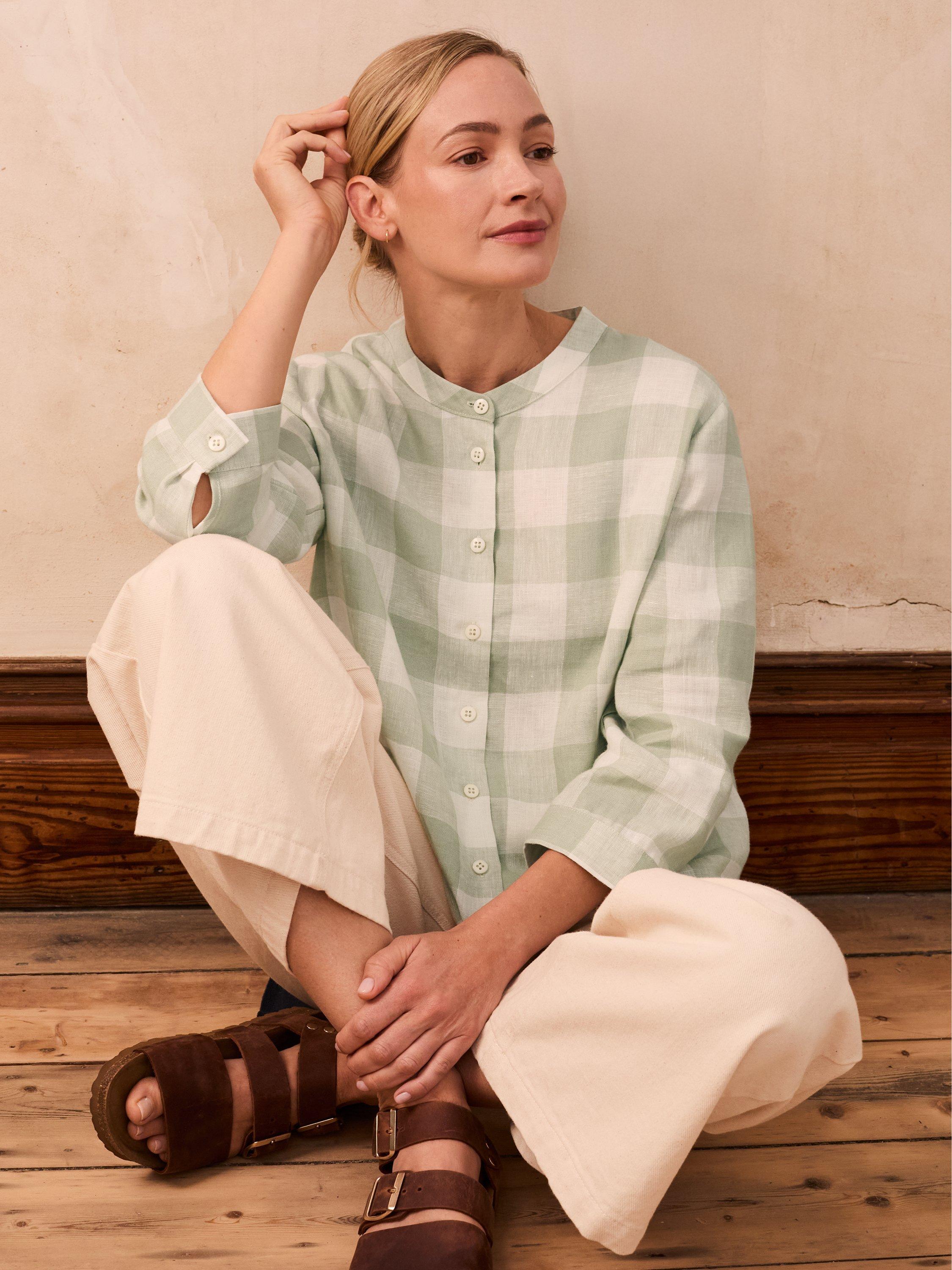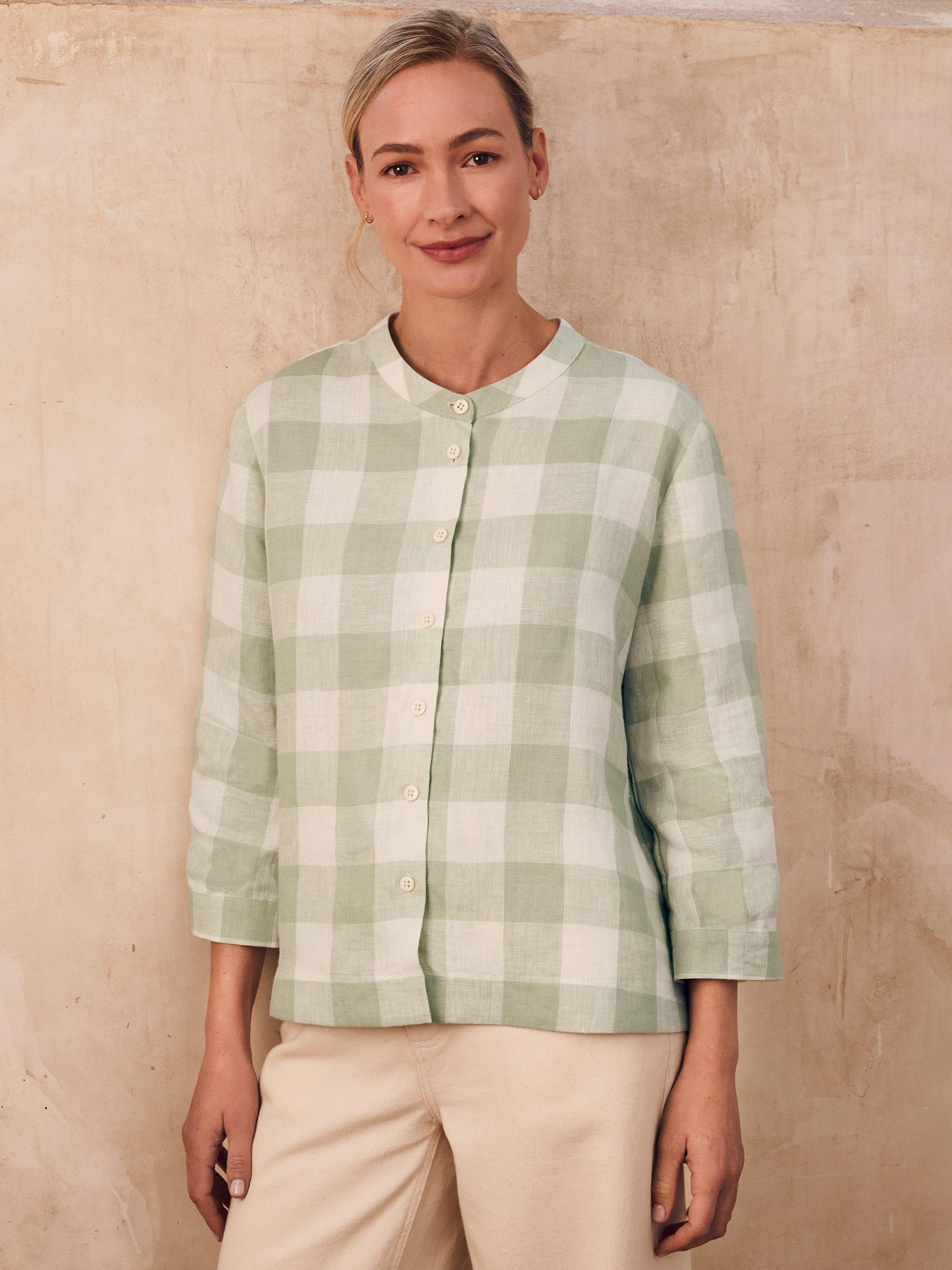 This blouse showcases a grandad collar neckline and a flattering swing shape, complemented by bracelet-length sleeves. Made from linen, it combines breathability with style, perfect for warm days or layered looks throughout the seasons.