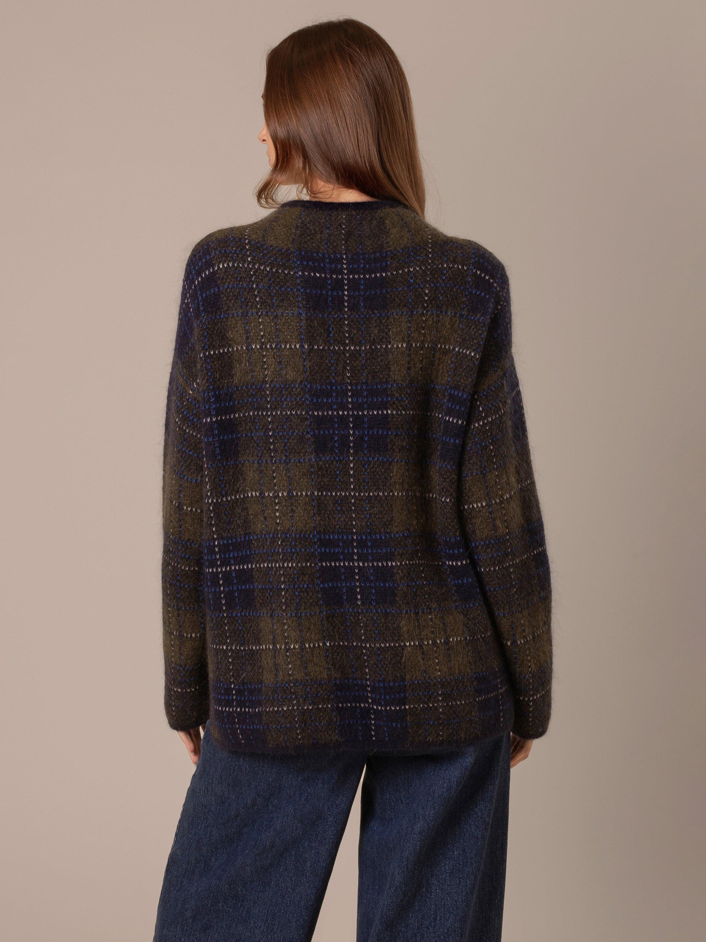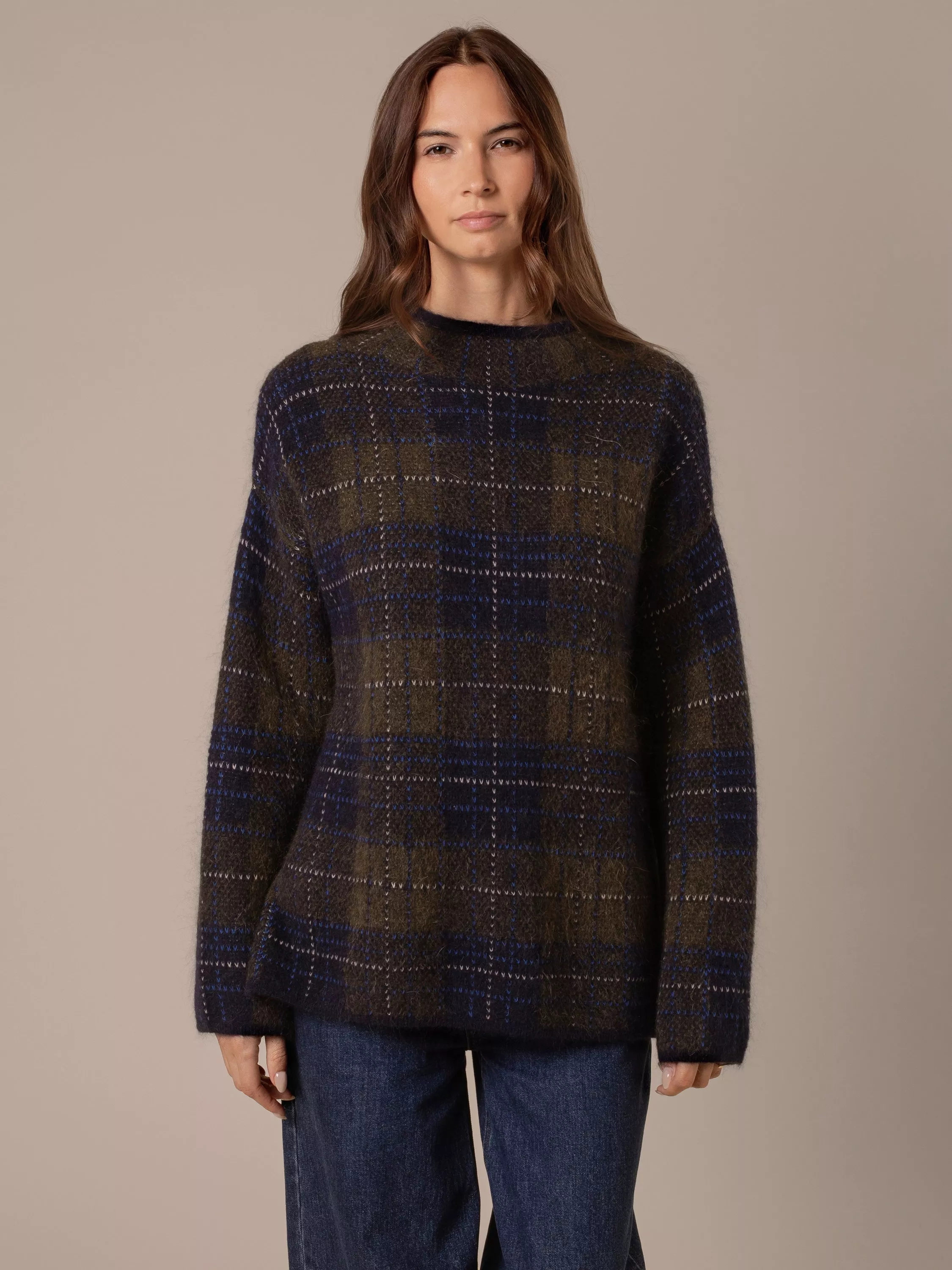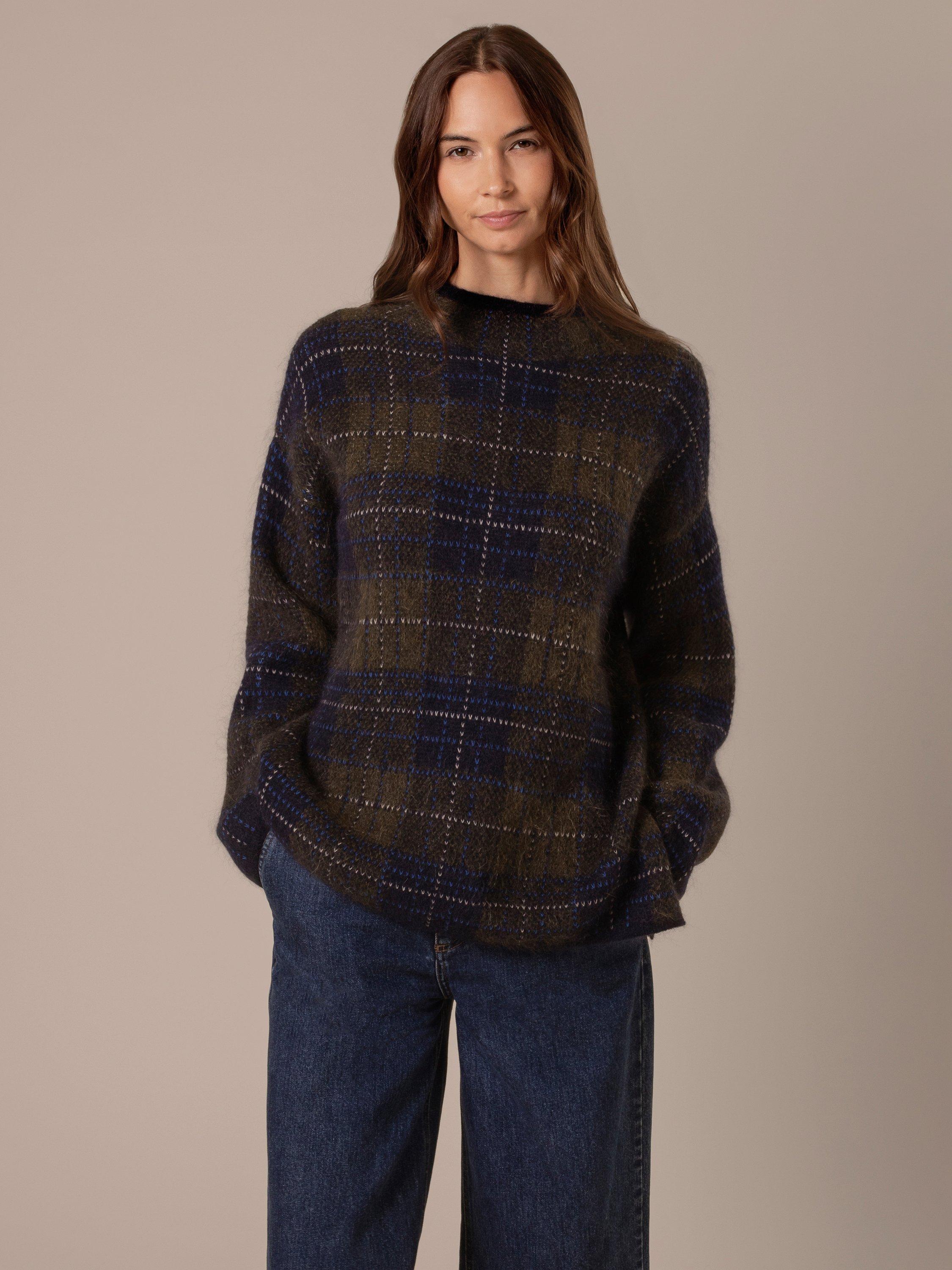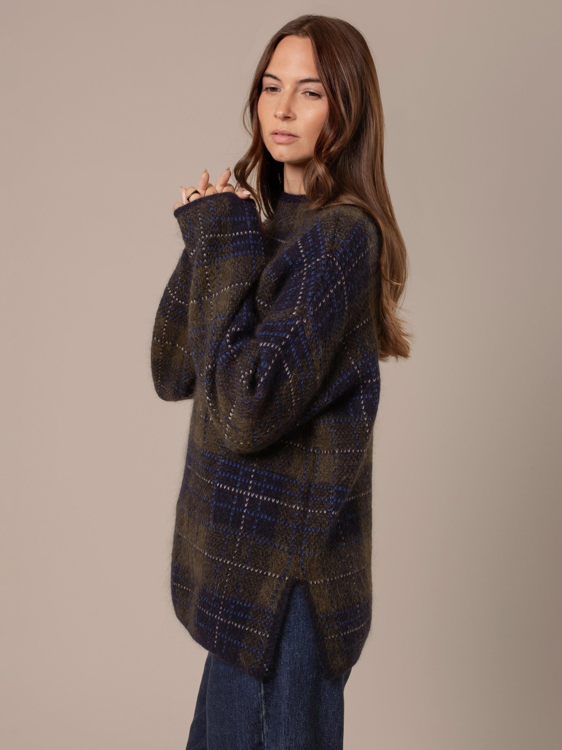 Featuring a heritage-inspired check design, this tunic is crafted with a blend that includes lofty mohair for a thick yet lightweight feel. The fluffy texture, funnel neckline, and side splits offer comfort and ease, while the tunic length and dropped shoulders create a relaxed silhouette.