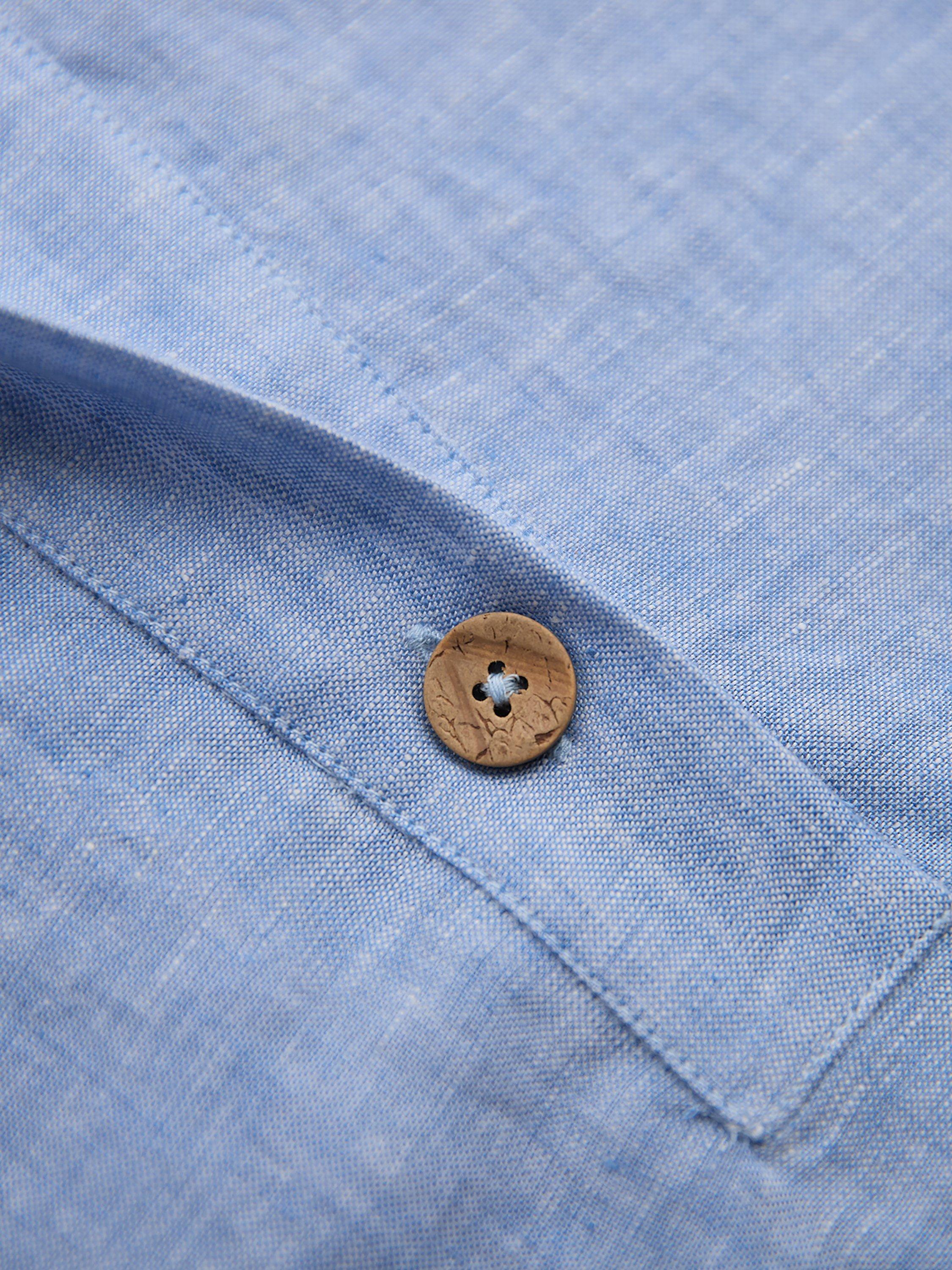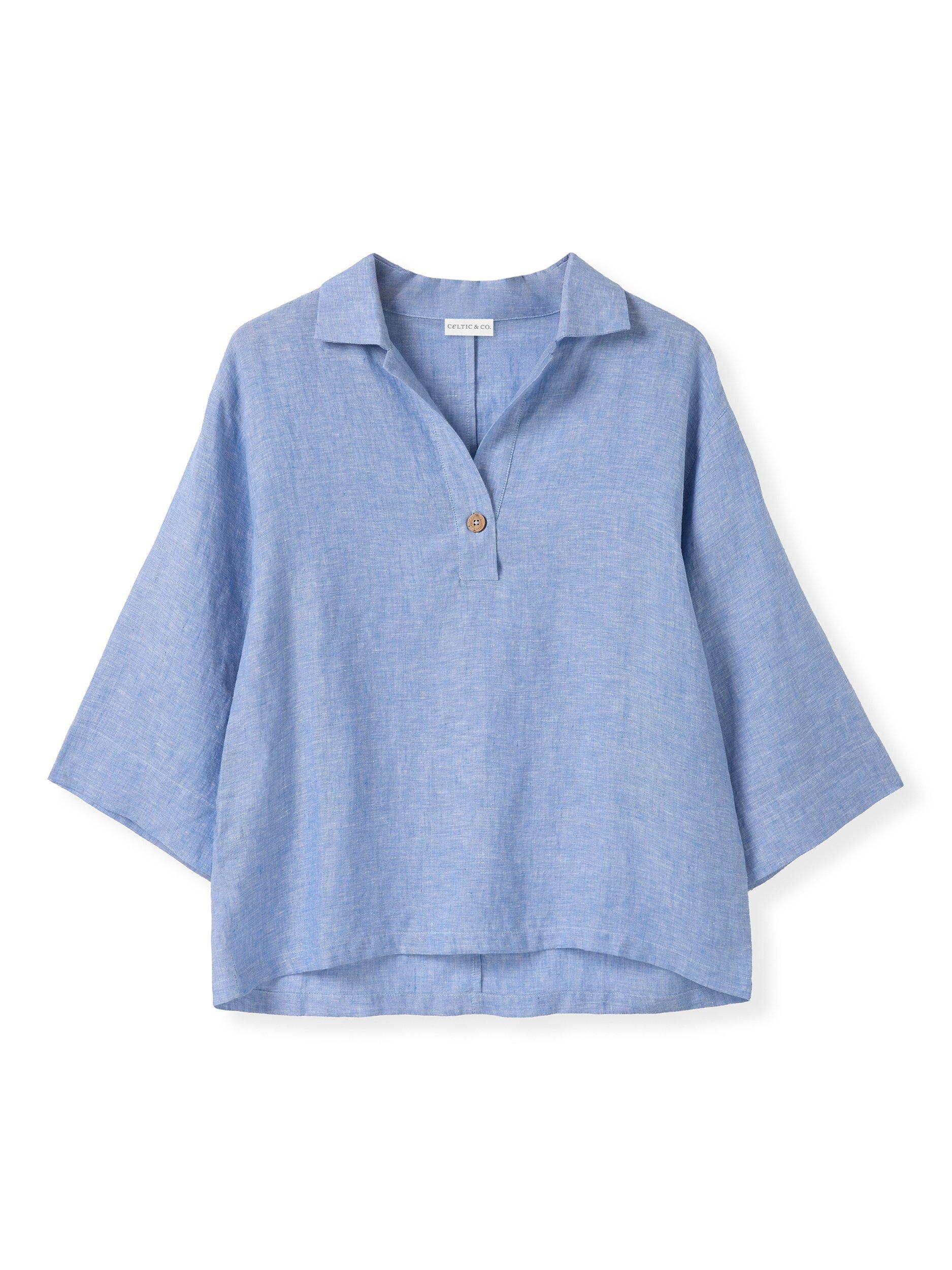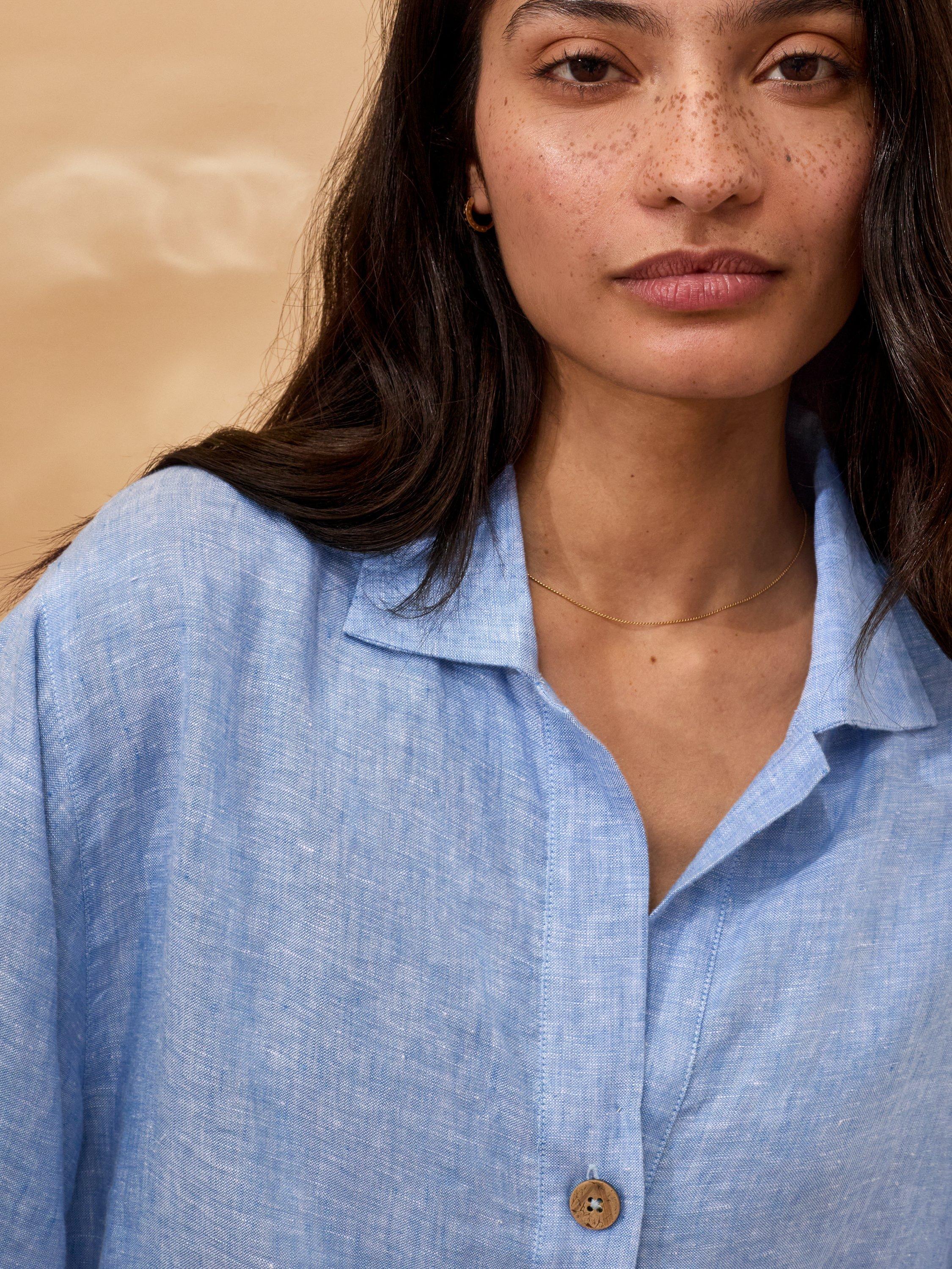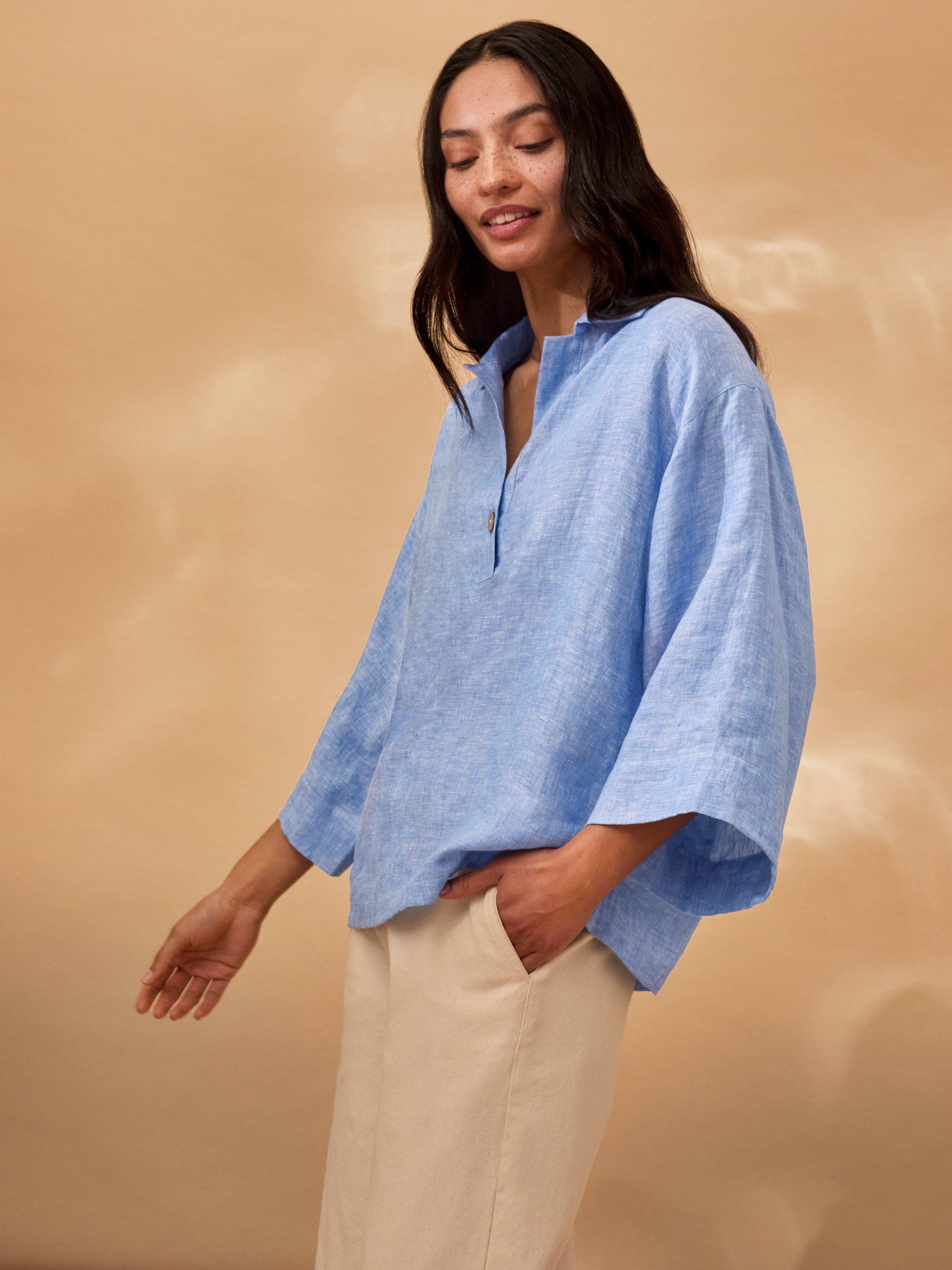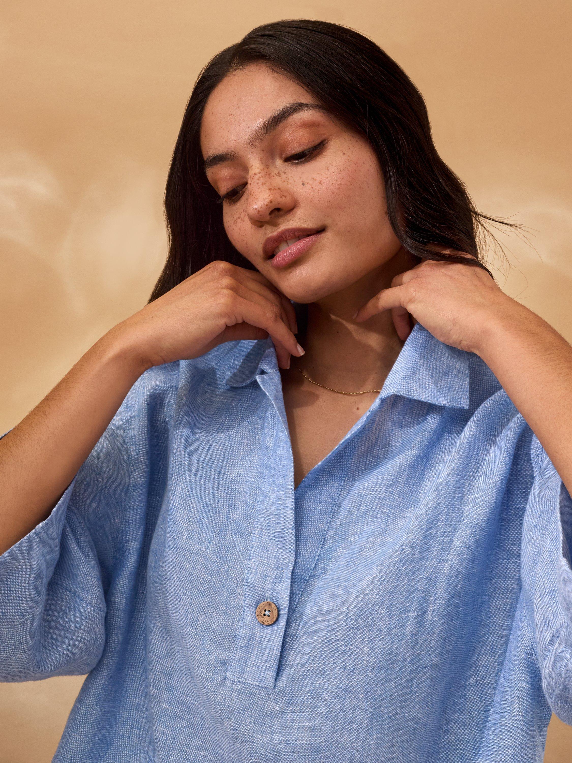 A relaxed-fit popover top with a classic collared neckline and long sleeves for timeless appeal. Finished with natural coconut buttons.