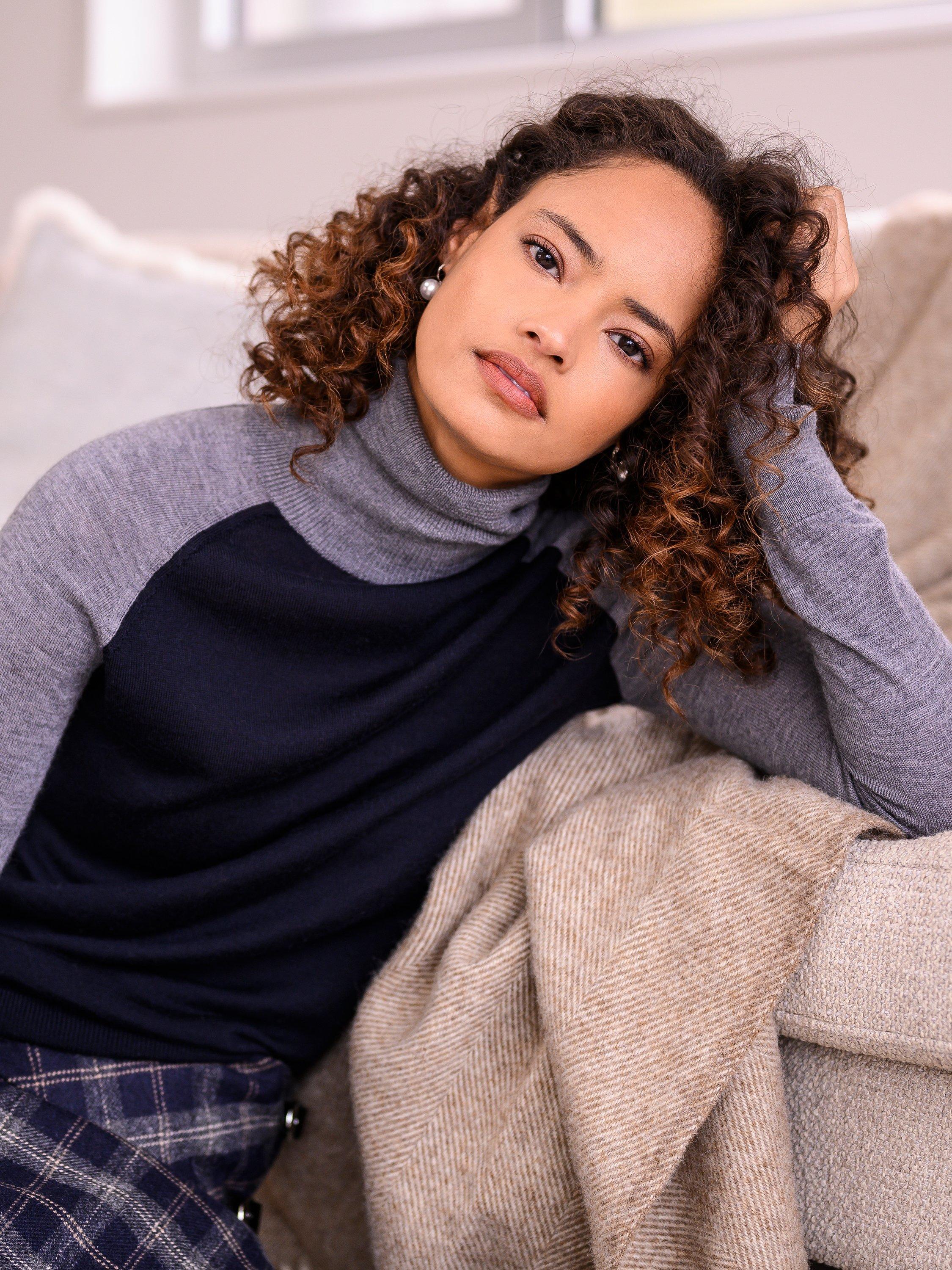Form-fitting style meets heavenly softness in the Merino roll-neck jumper. This versatile piece is designed to offer a slim fit with a deep-ribbed waistband that falls at the hips, making it a great option for layering. But, in our opinion, it's just perfect on its own.
