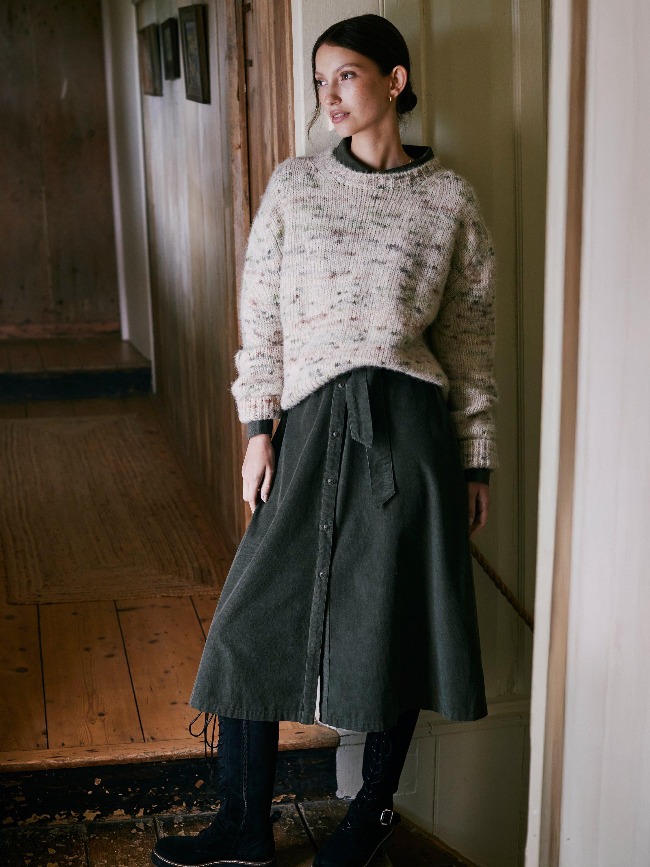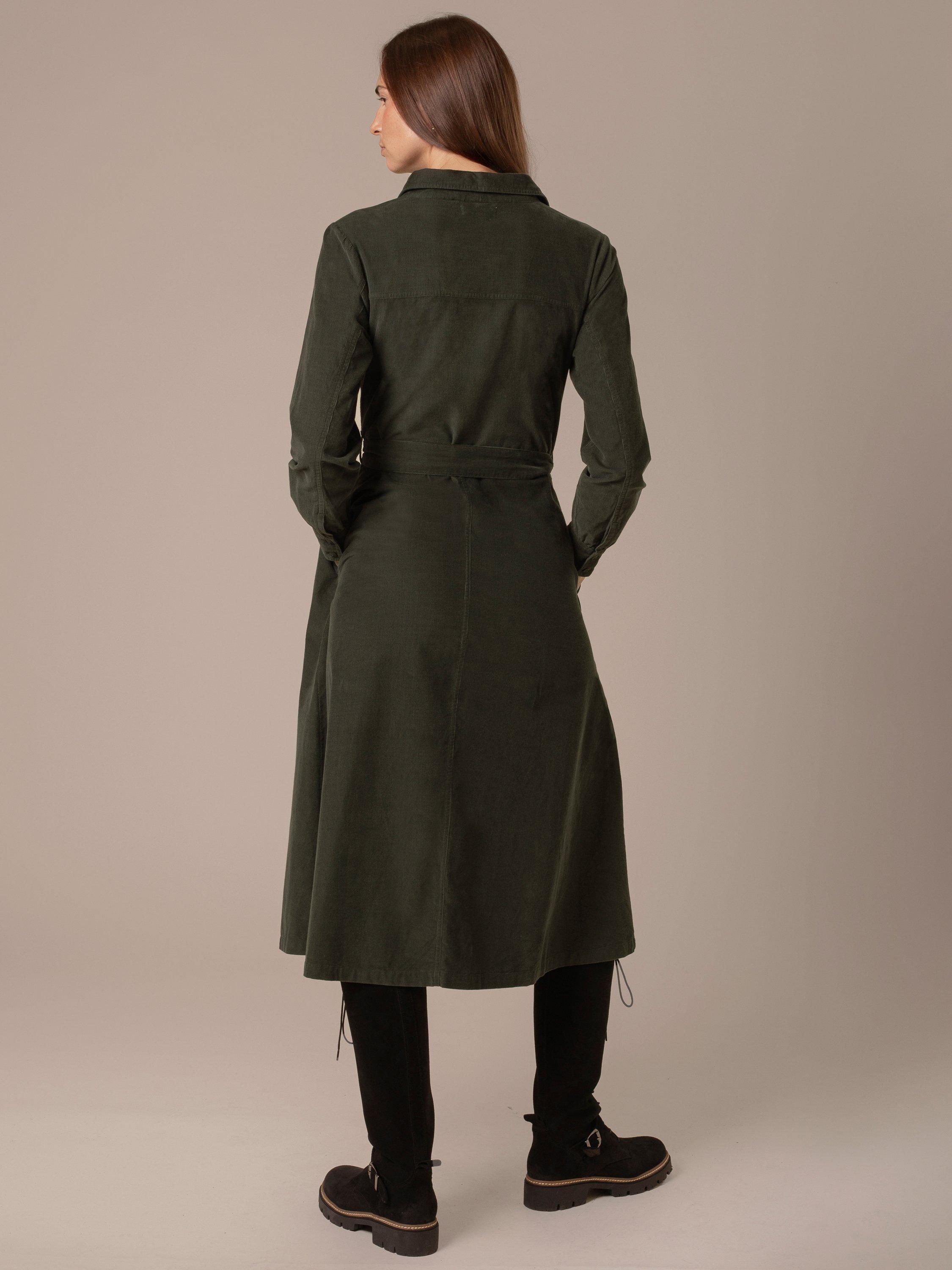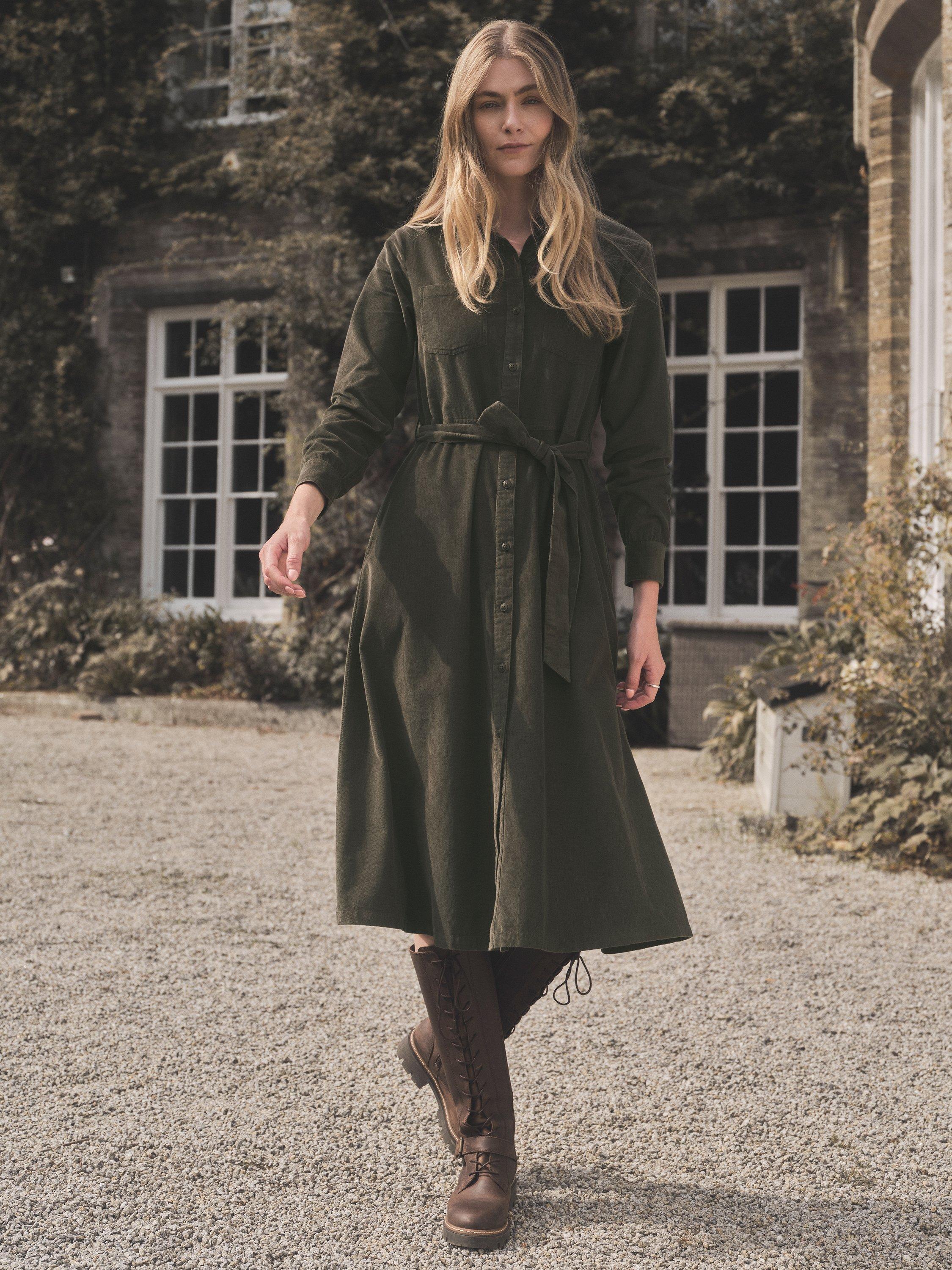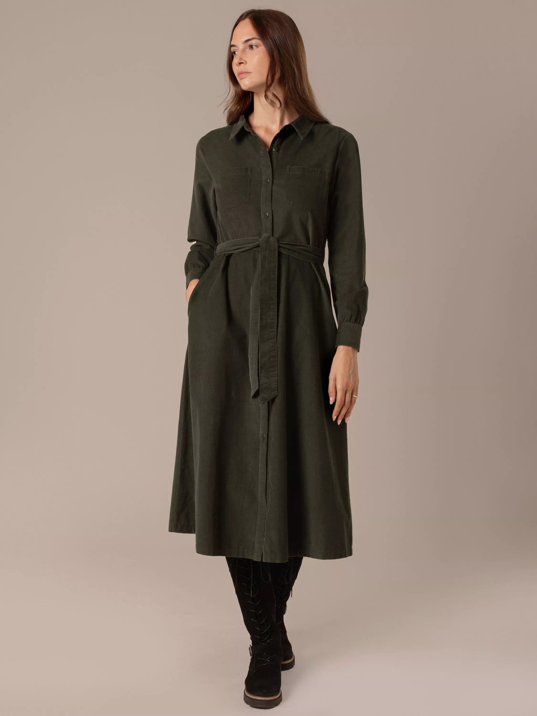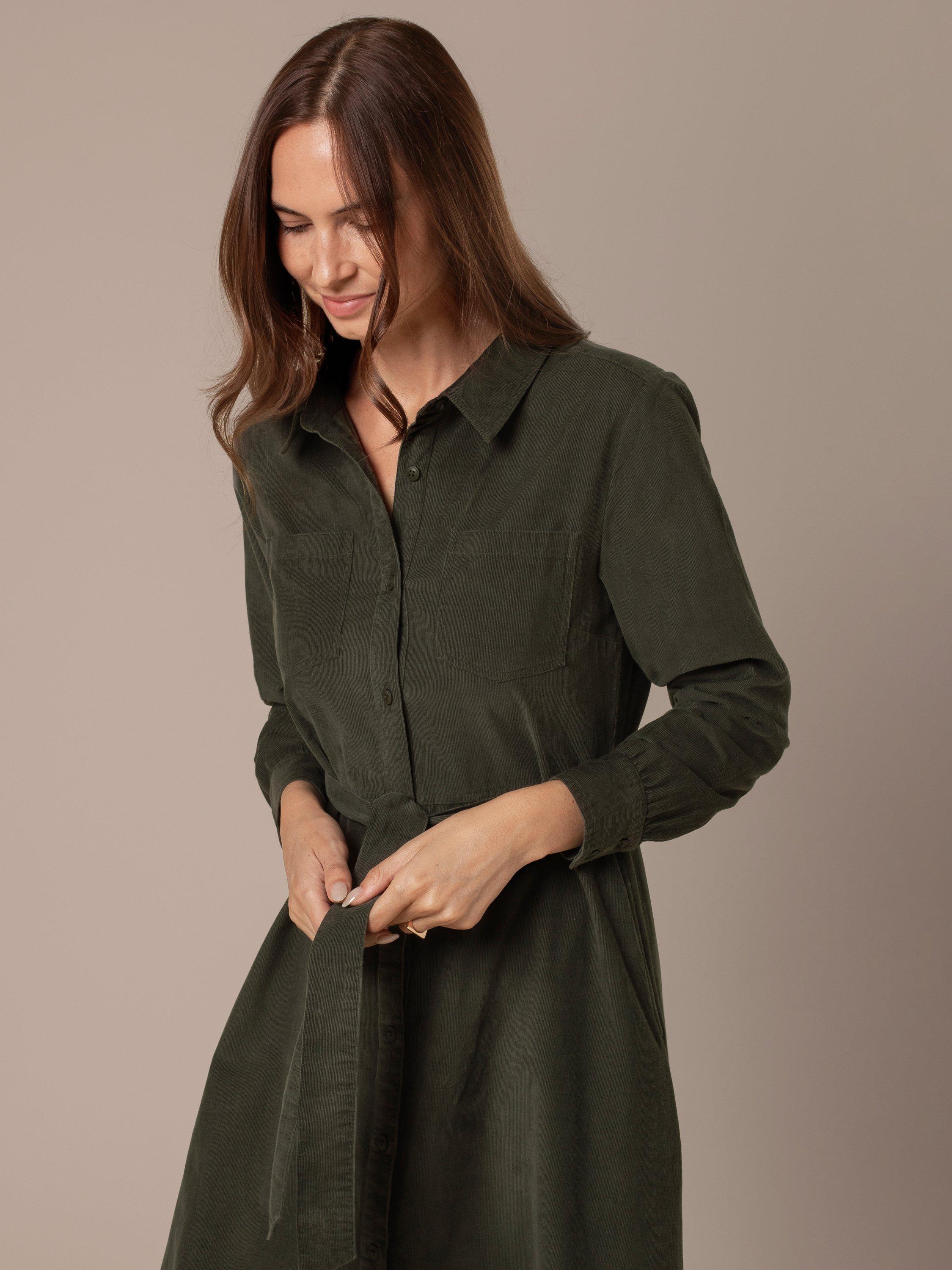 This midi-length shirt dress is crafted from breathable cotton and features a classic shirt collar. Details include a patch pocket and a self-tie belt at the waist to define the silhouette with subtle tailoring.