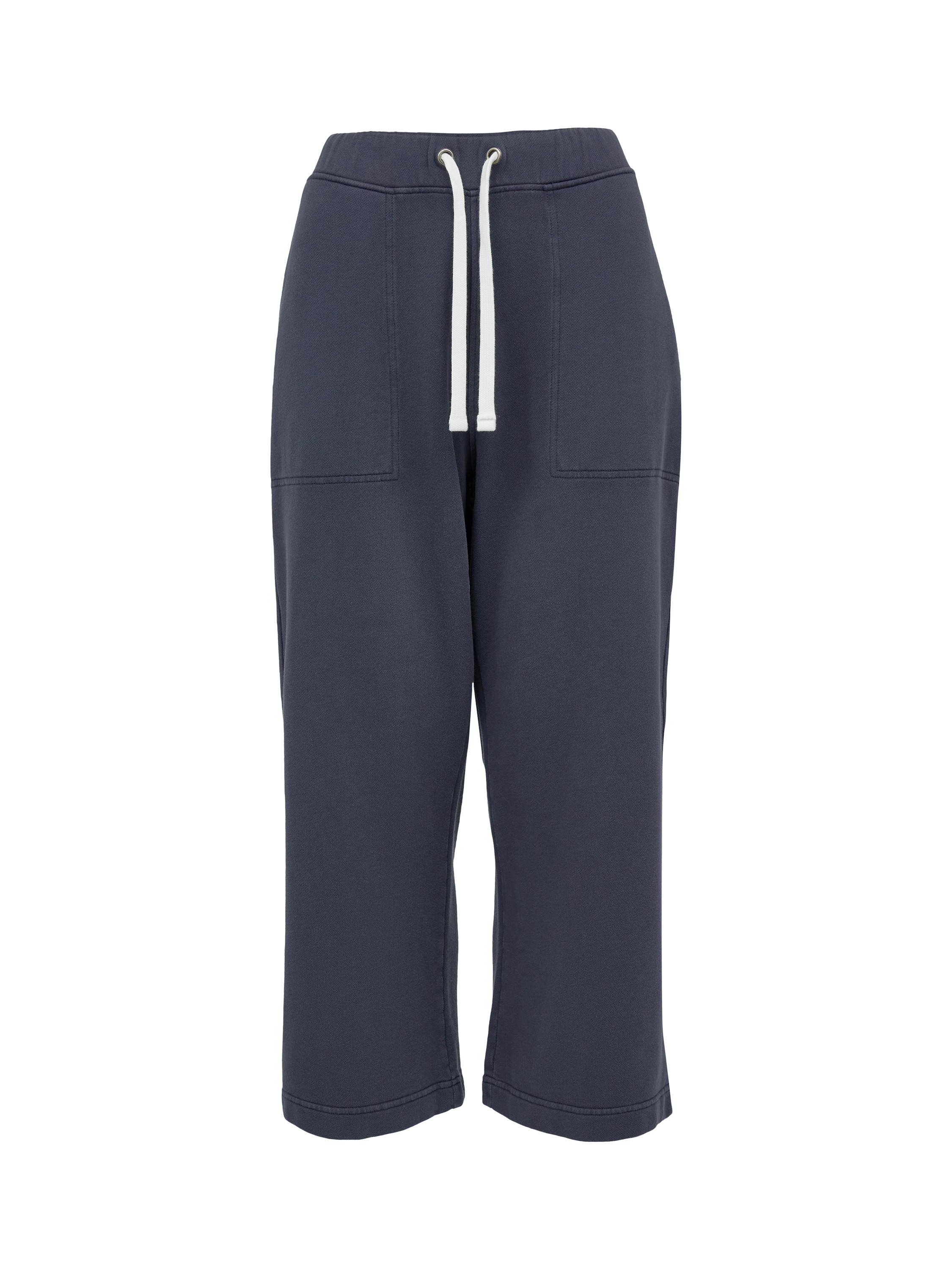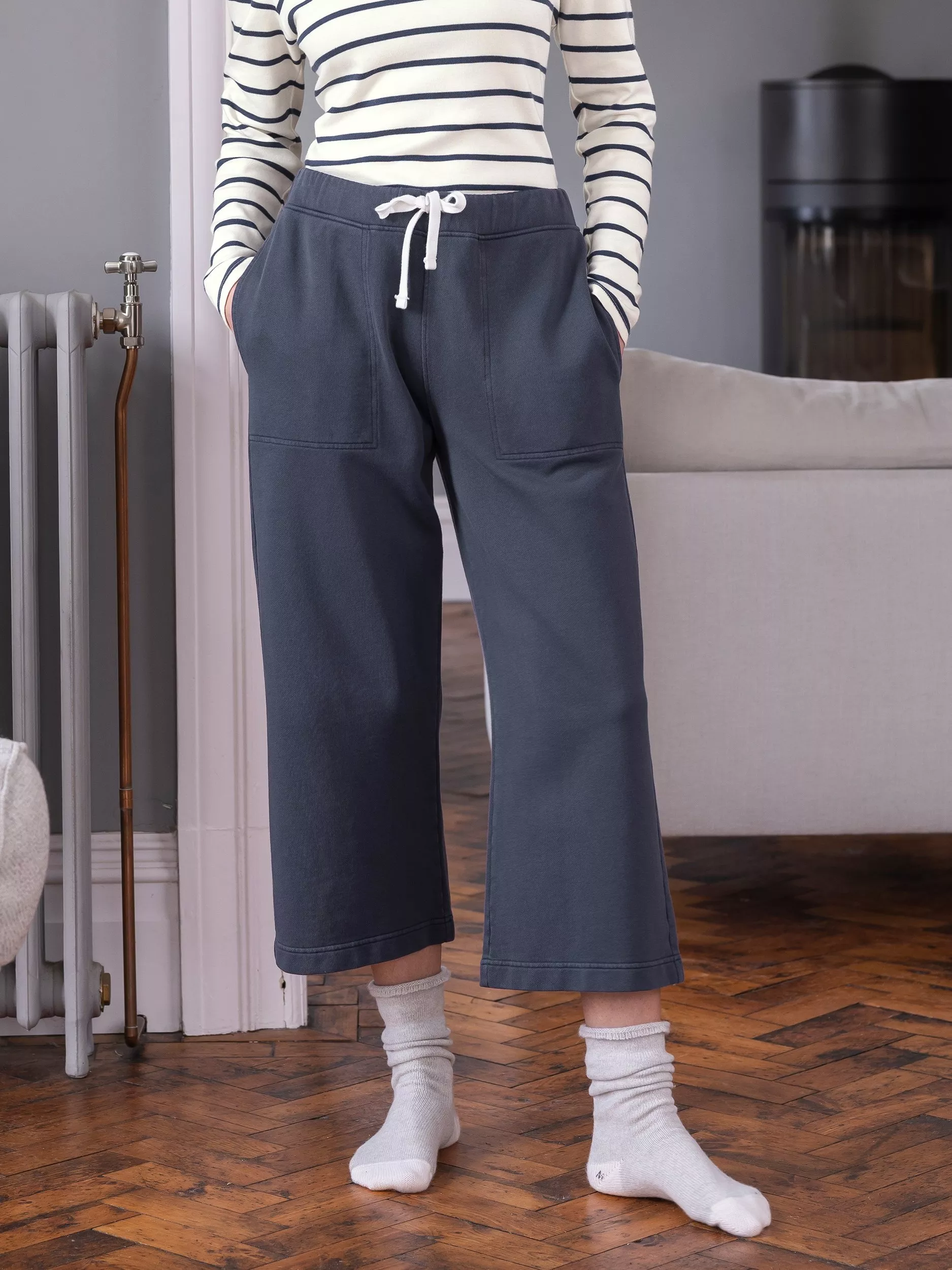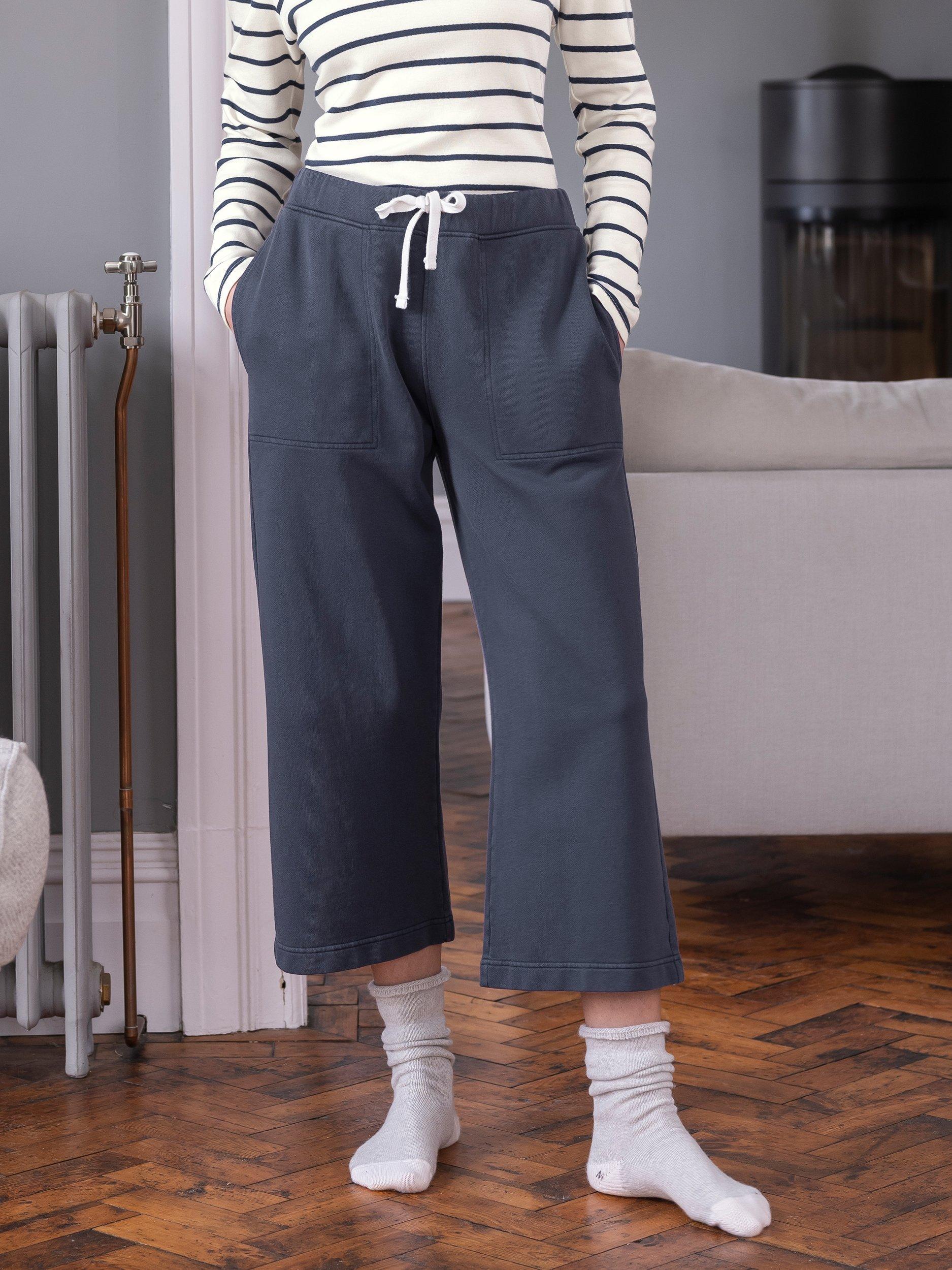 Made in loop back jersey sweatshirting, they have a trendy wide leg that sits at a cropped length. The drawstring waist features contrast ecru cotton tape ties. Pockets in the side seam add comfort and practicality.