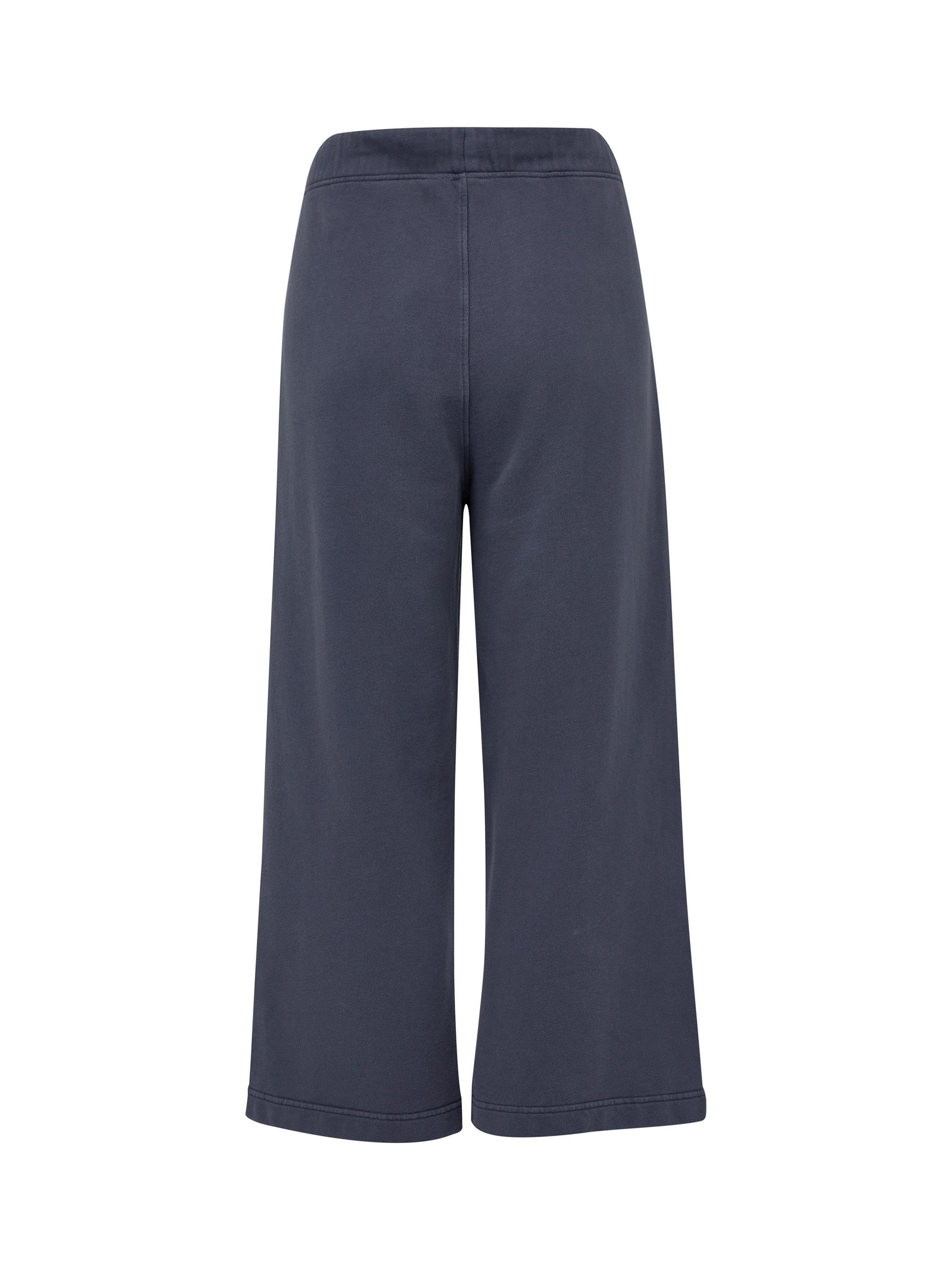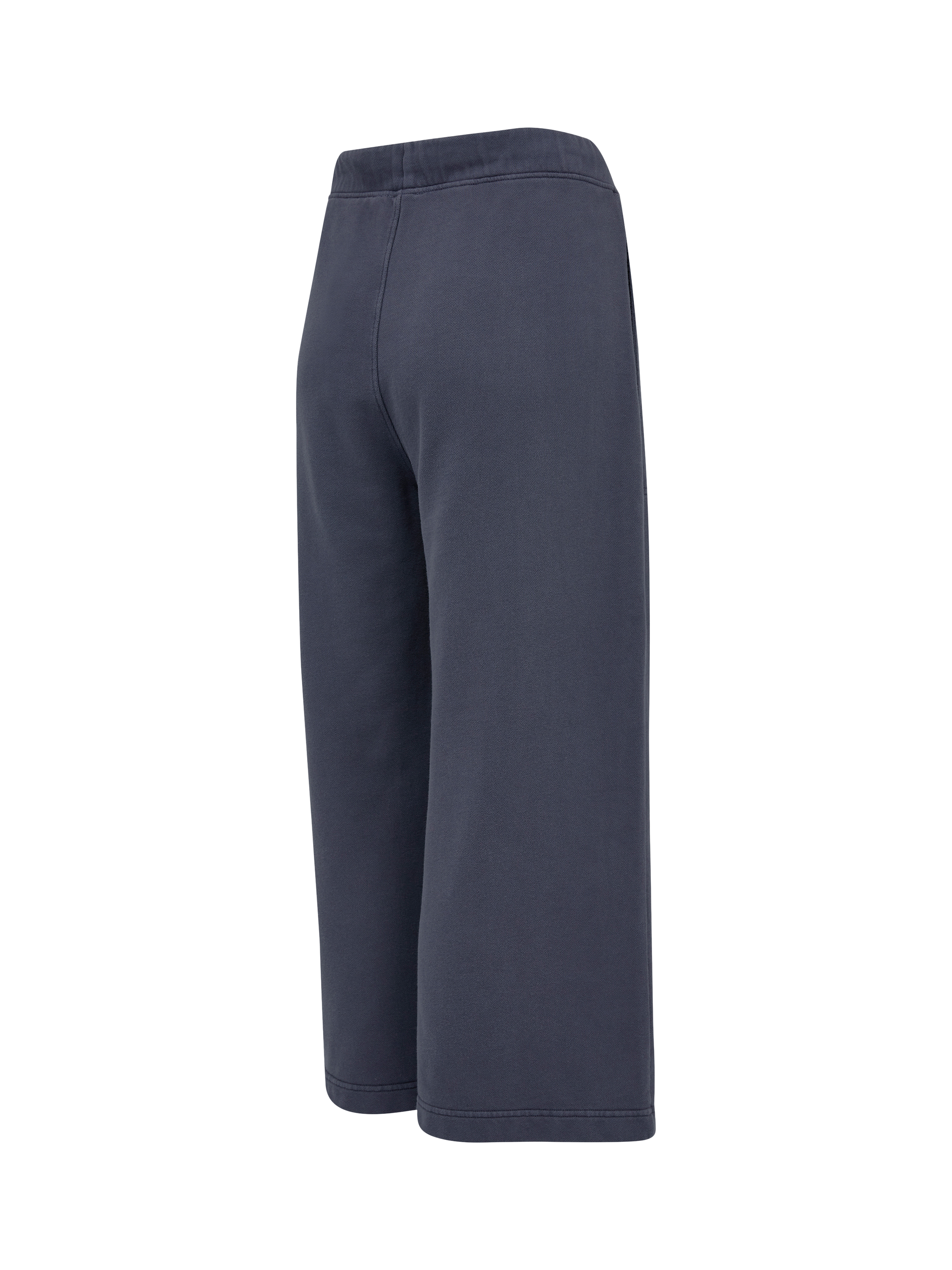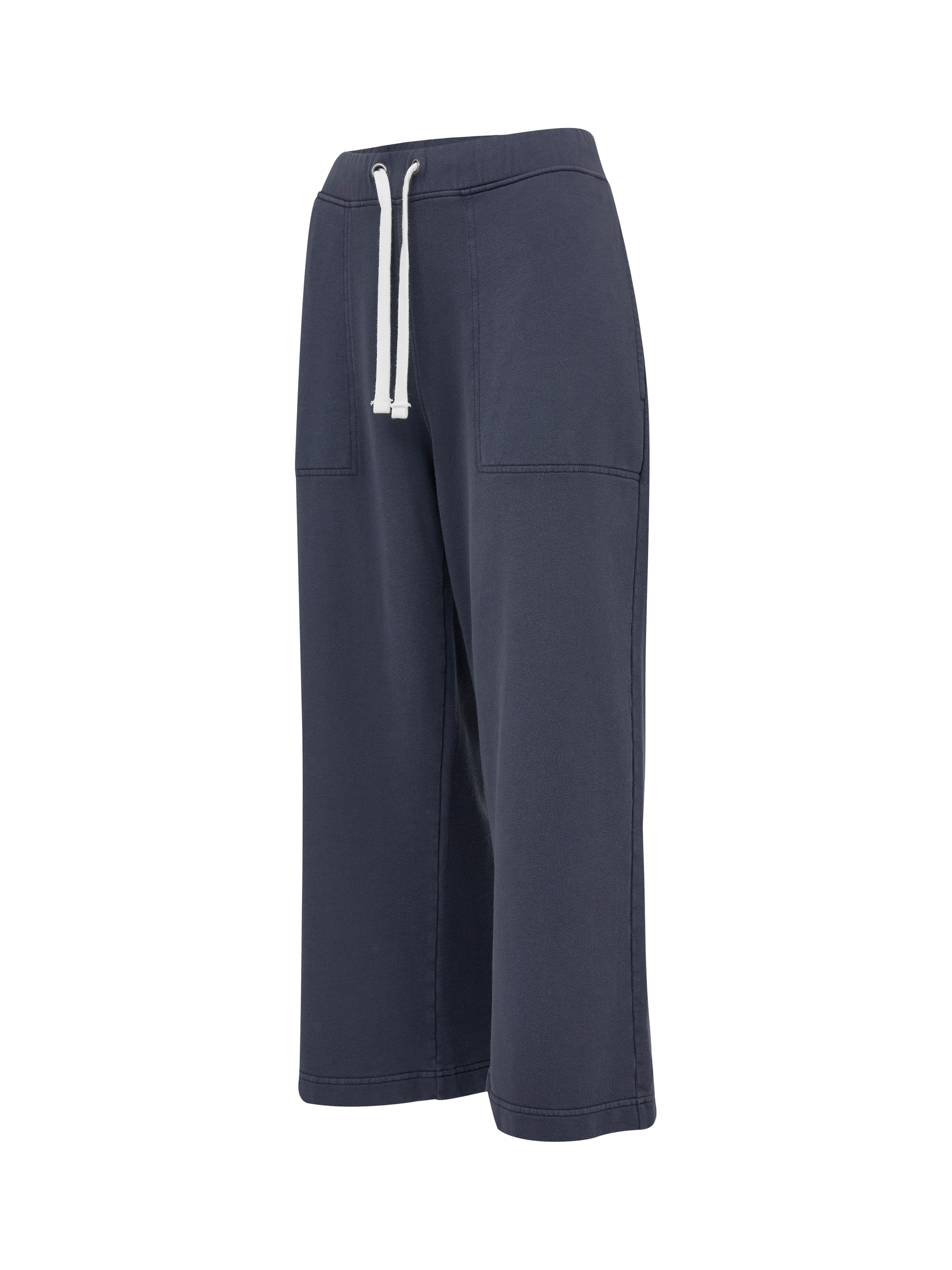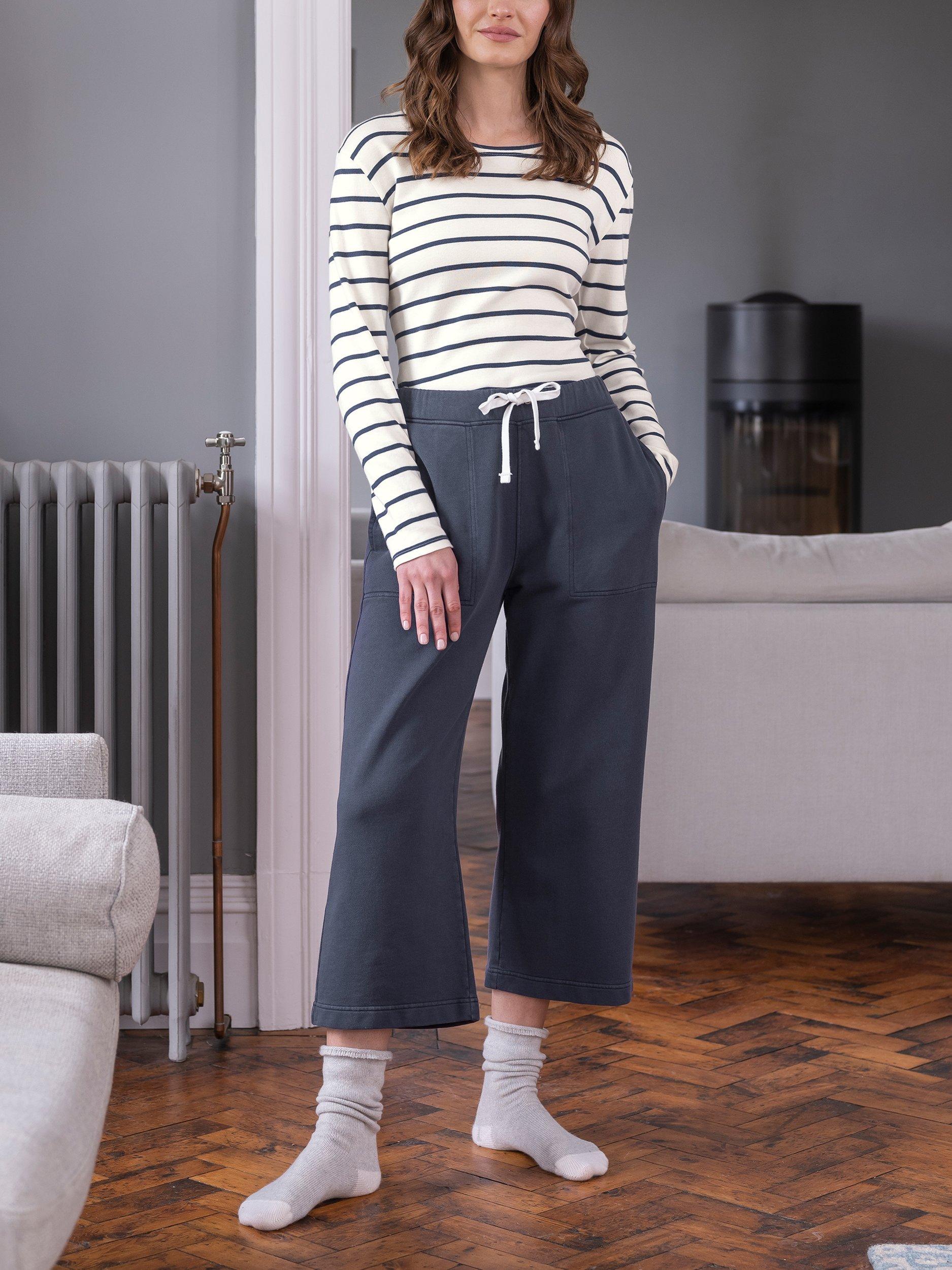 Made in loop back jersey sweatshirting, they have a trendy wide leg that sits at a cropped length. The drawstring waist features contrast ecru cotton tape ties. Pockets in the side seam add comfort and practicality.