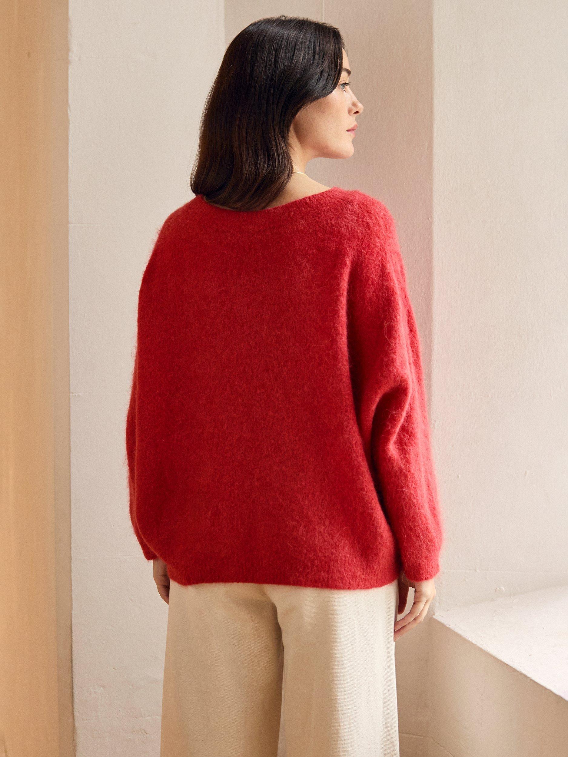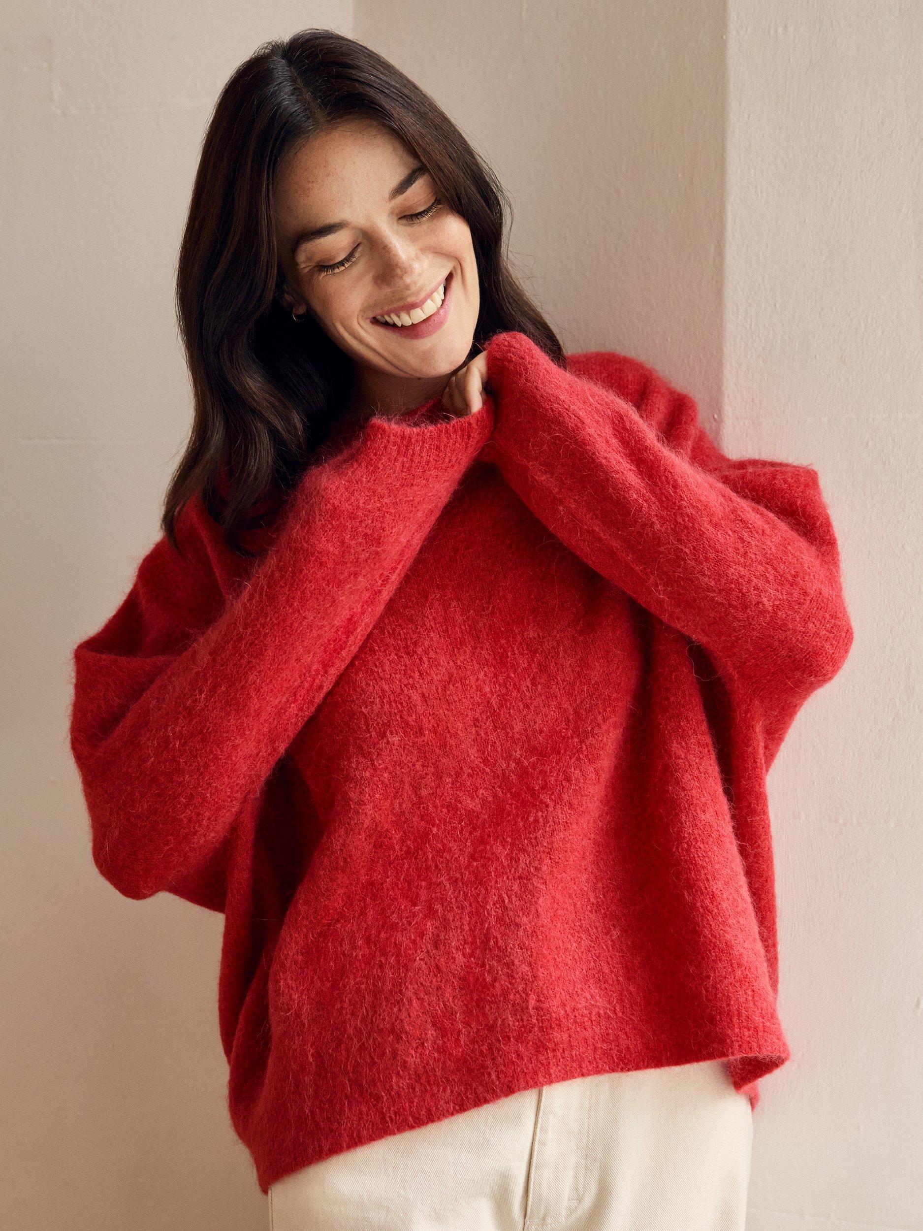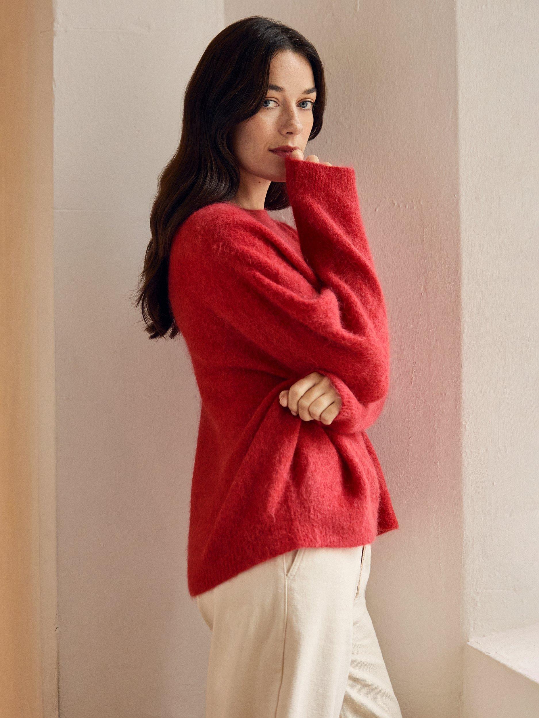 This boxy jumper features a crew neck and wide, ¾-length sleeves with a dropped shoulder for relaxed comfort. Finished with a ribbed hem and cuffs, its slightly cropped length adds a contemporary edge while maintaining a timeless appeal, crafted to offer effortless style.