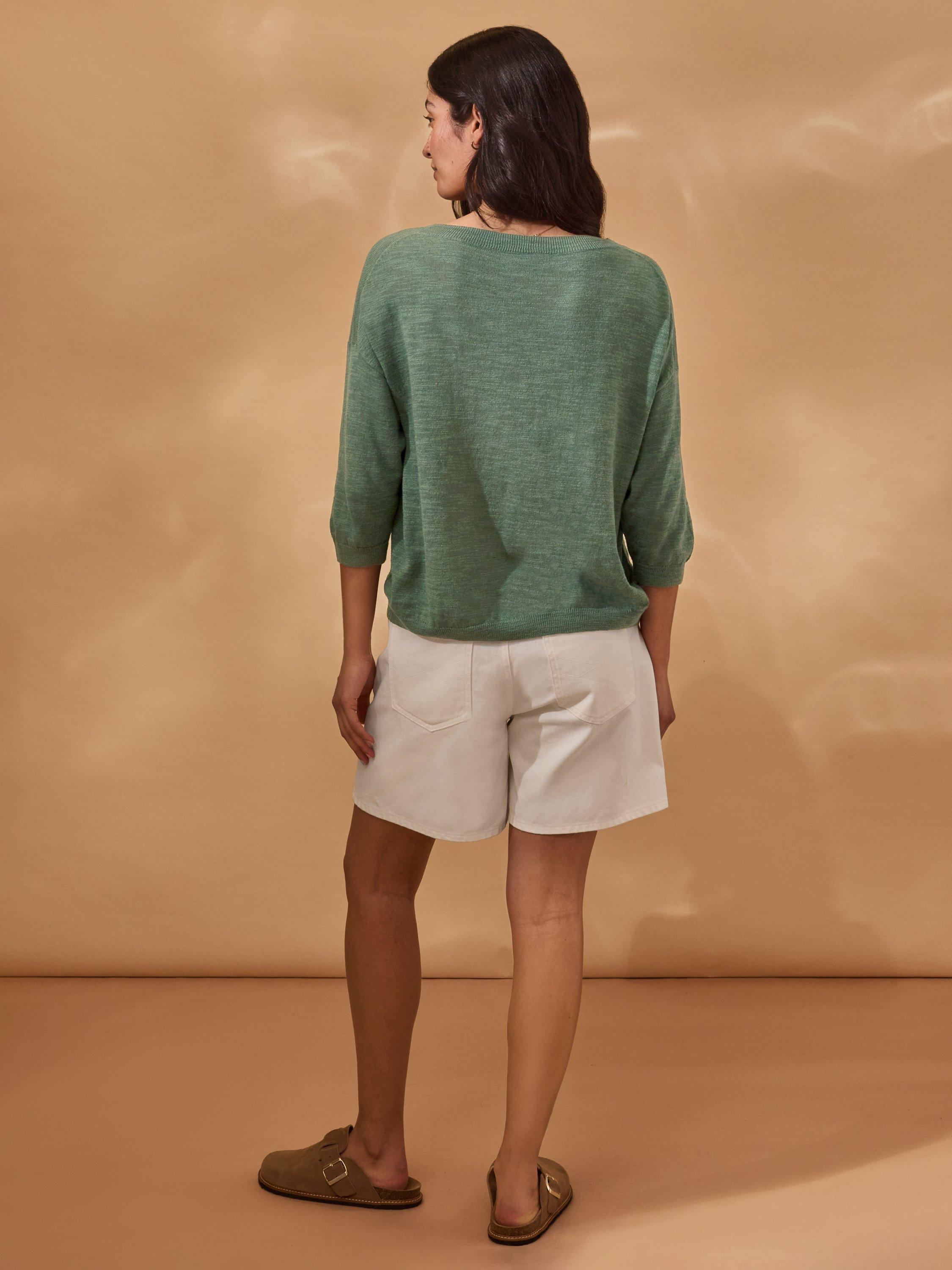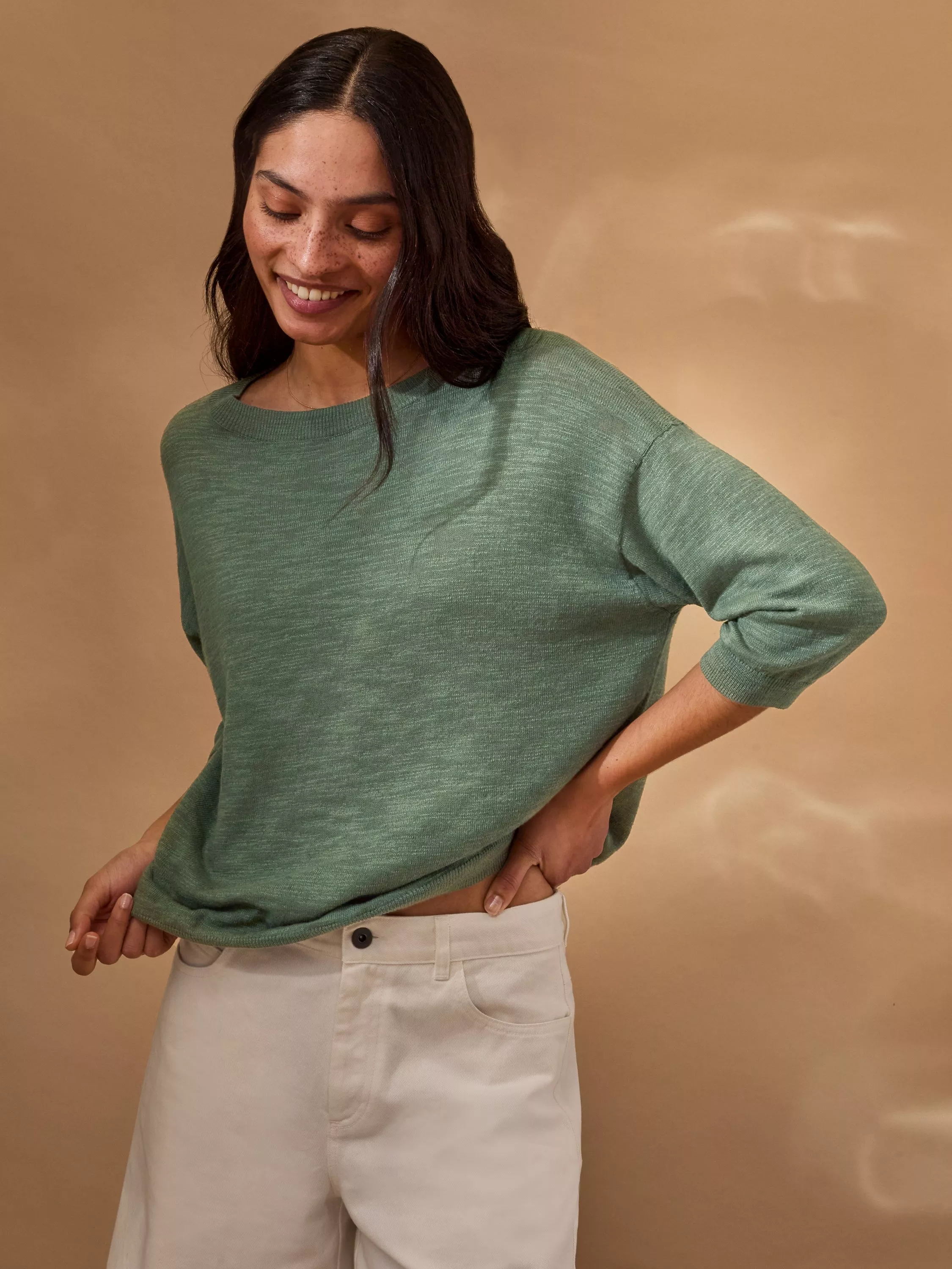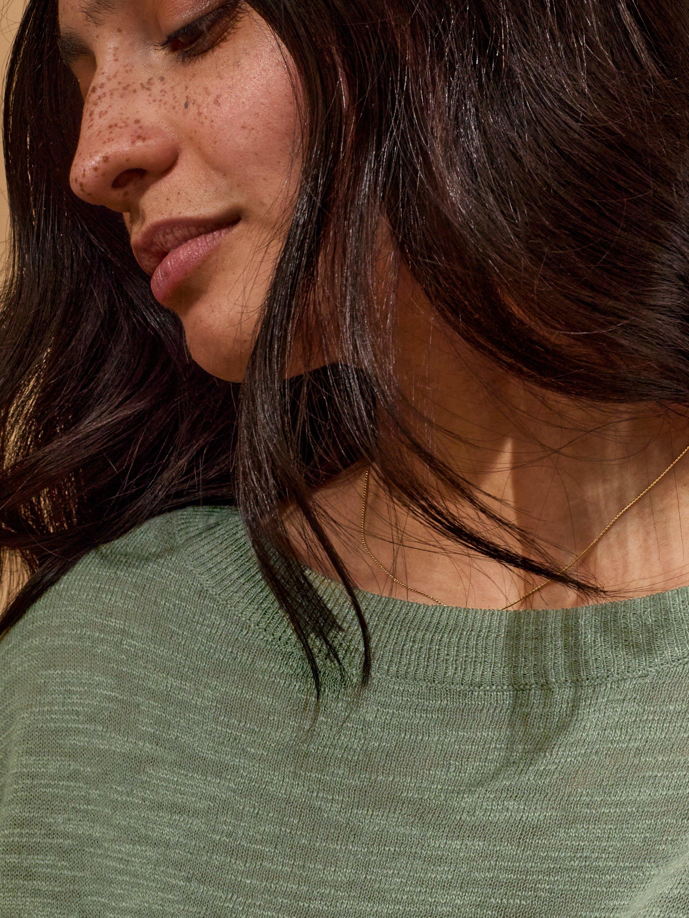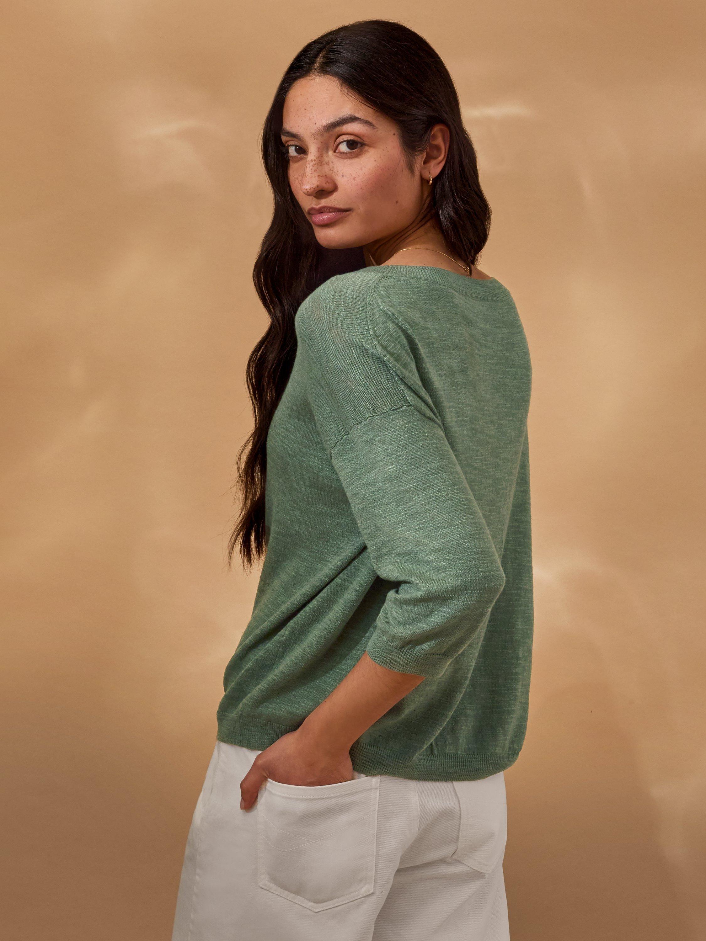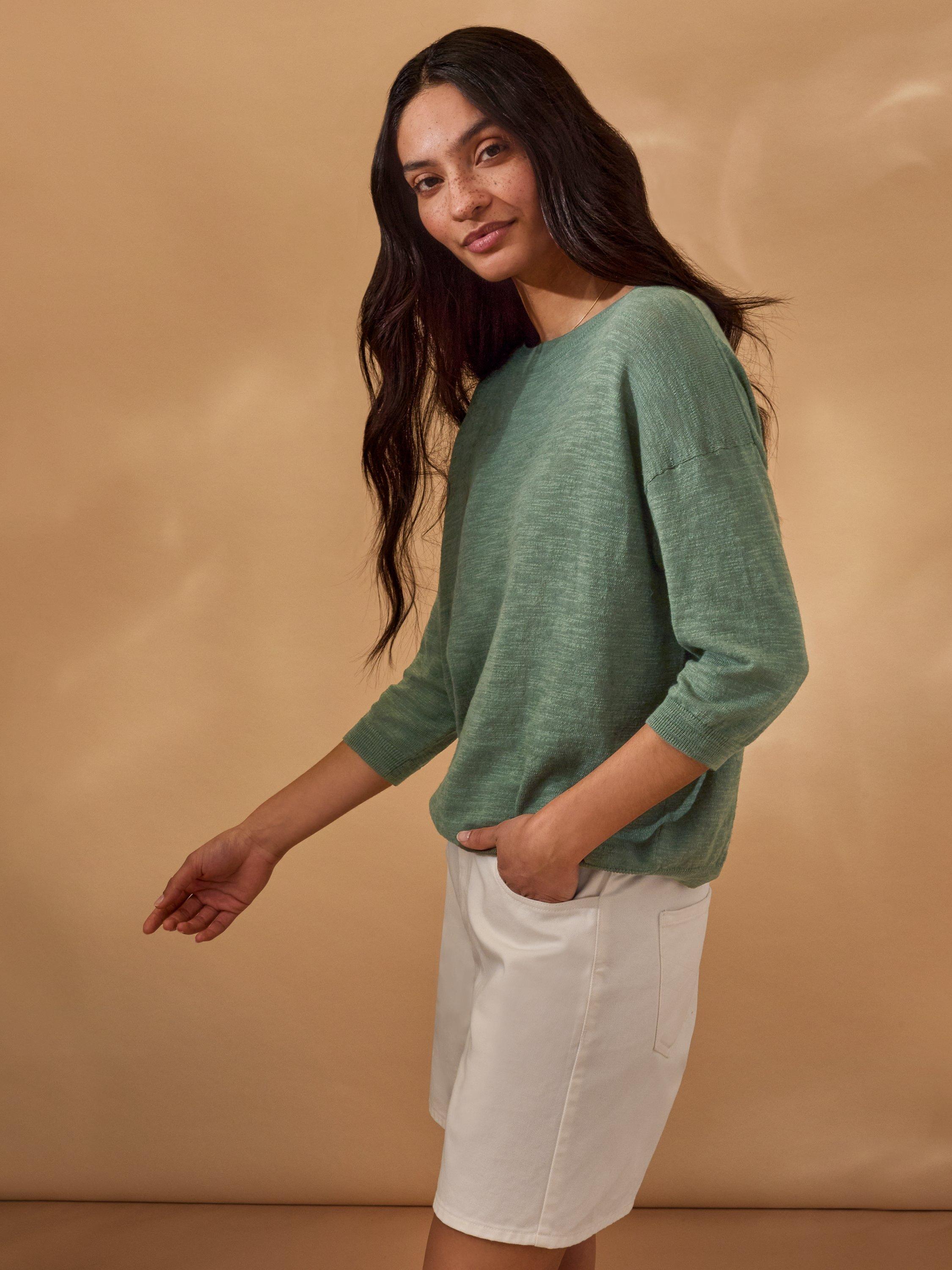 This lightweight crew neck top features a subtle slub yarn and a fine knit texture, offering an elevated basic with a relaxed drop shoulder and cropped sleeves. Crafted from a linen and cotton blend, it provides breathable comfort and a natural feel, ideal for layering or wearing alone in warmer weather.