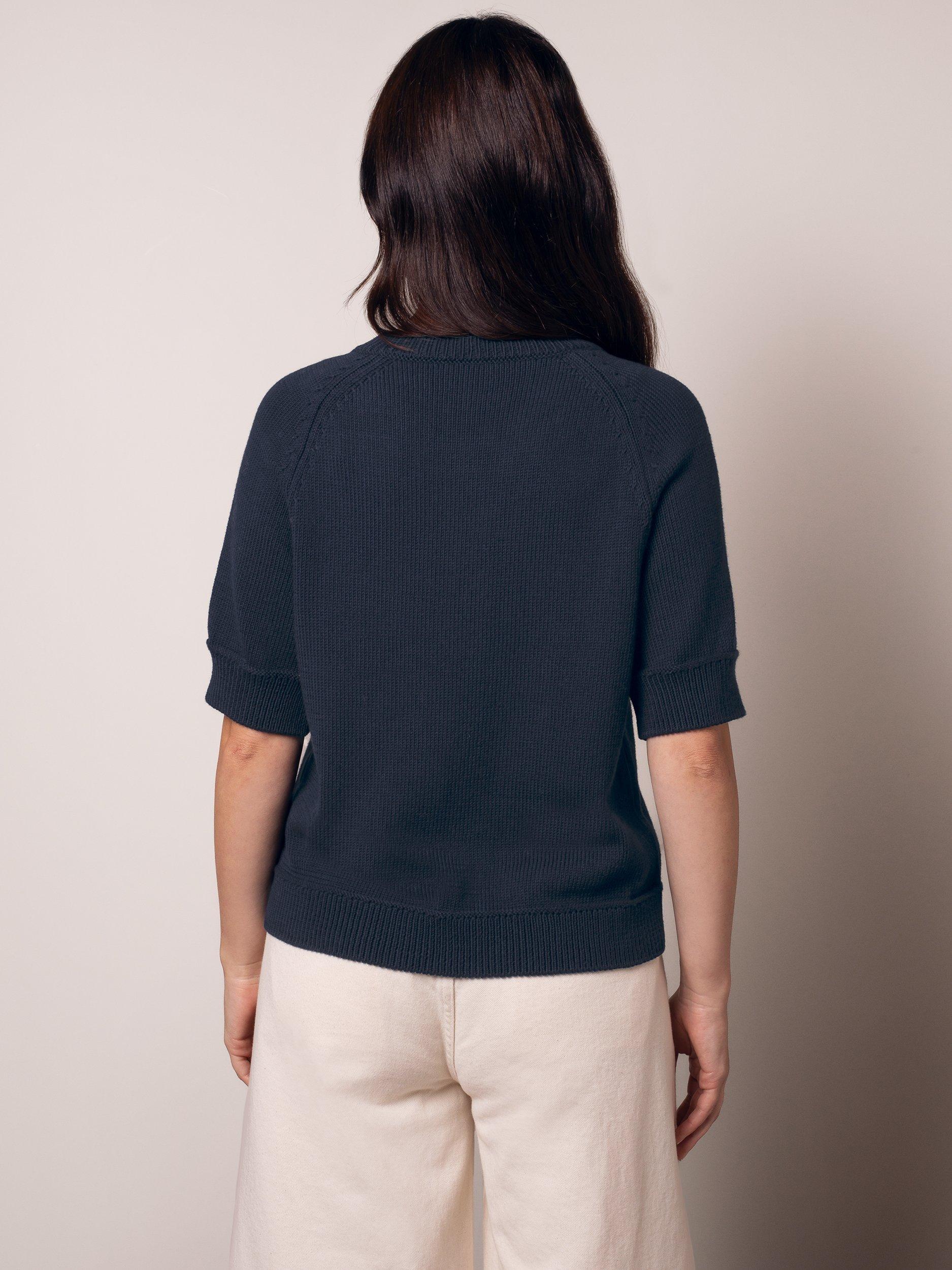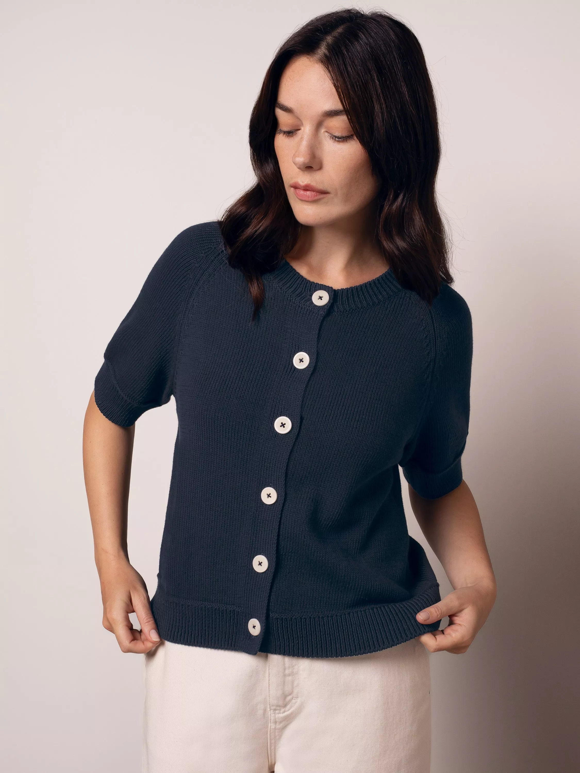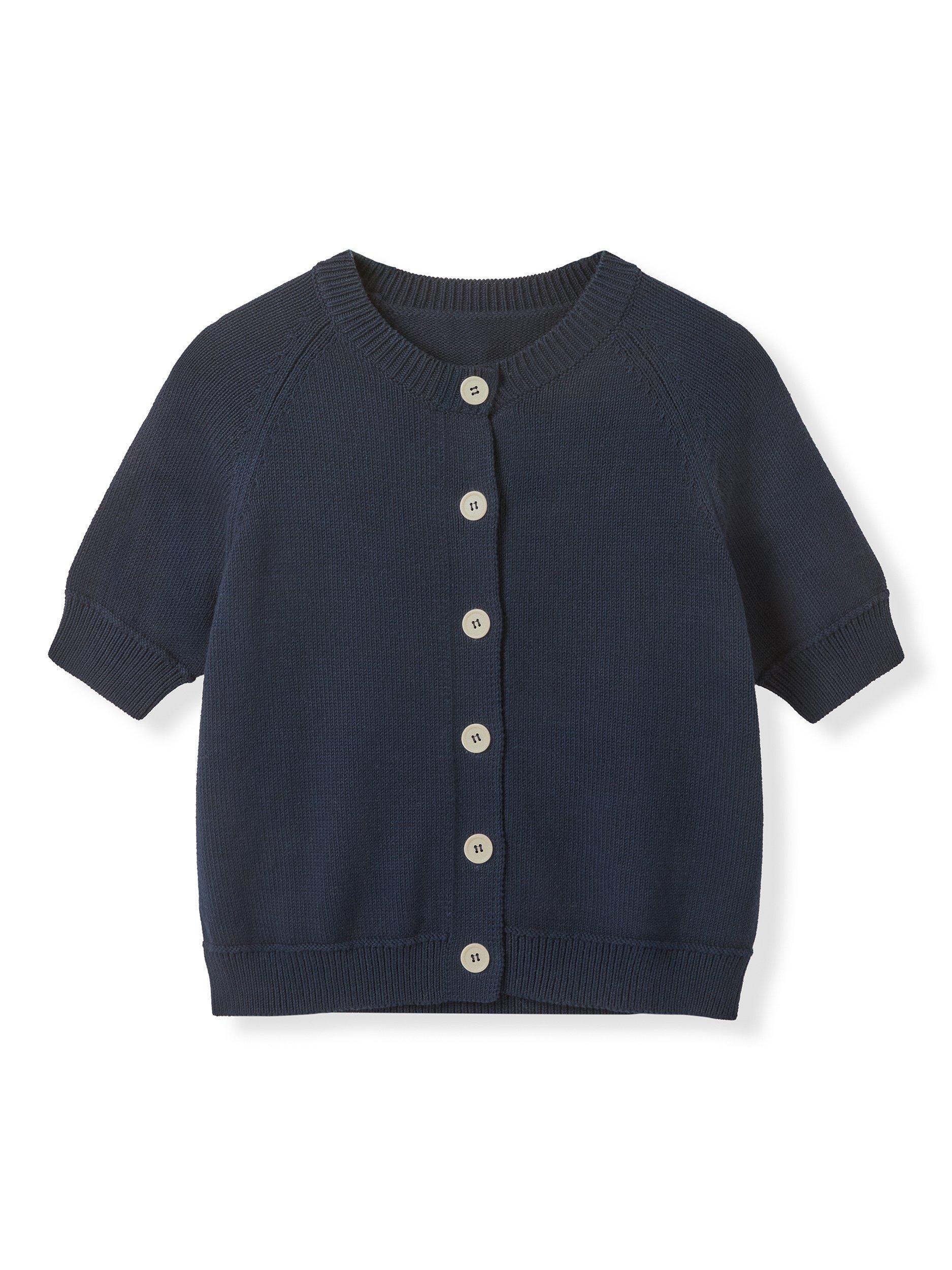 Introducing a fun but also feminine addition to your knitwear options, this short sleeve cardigan features a classic crew neck with contrast buttons for a playful injection as well as reliable softness and versatility. Pair with Jeans and loafers for the new season. Store flat to keep it looking beautiful.