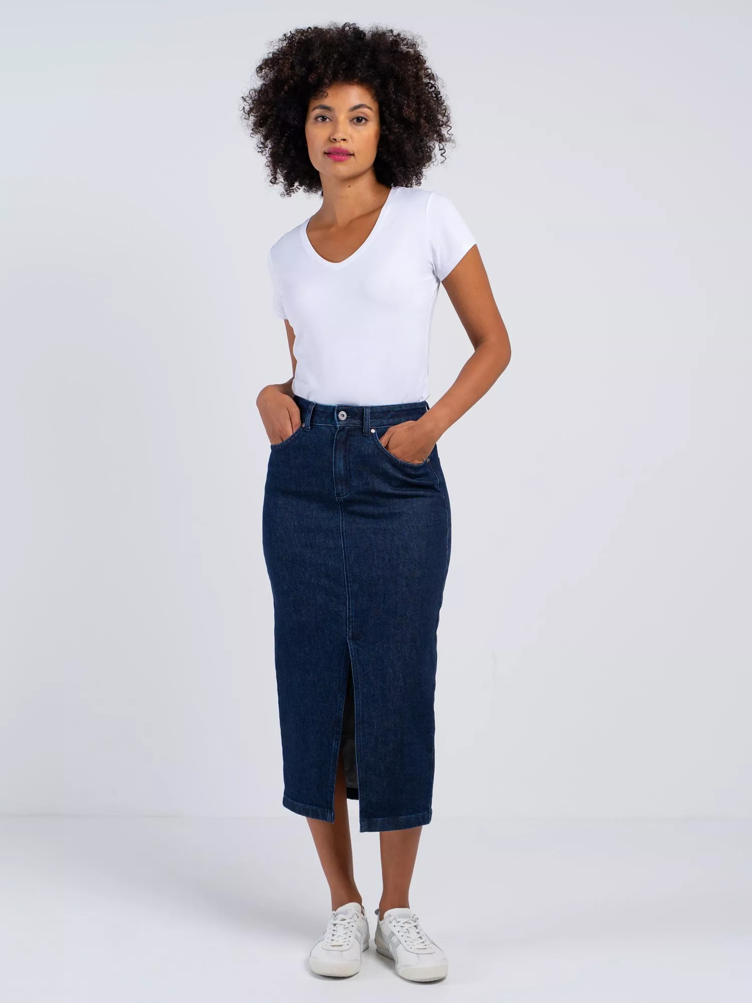 Elevate your everyday style with this versatile denim skirt. Crafted from premium cotton with a touch of stretch, it offers both comfort and contemporary flair.
