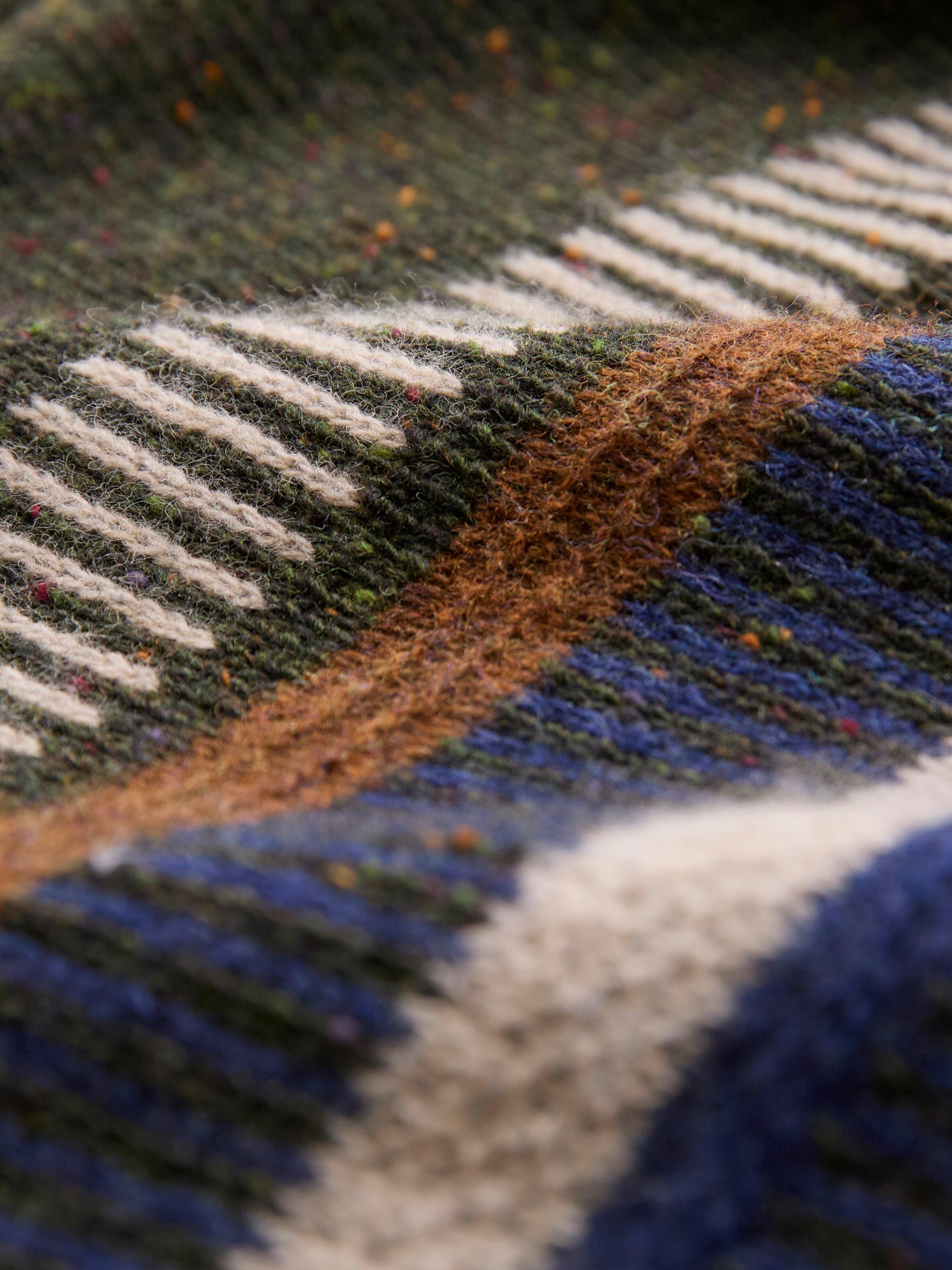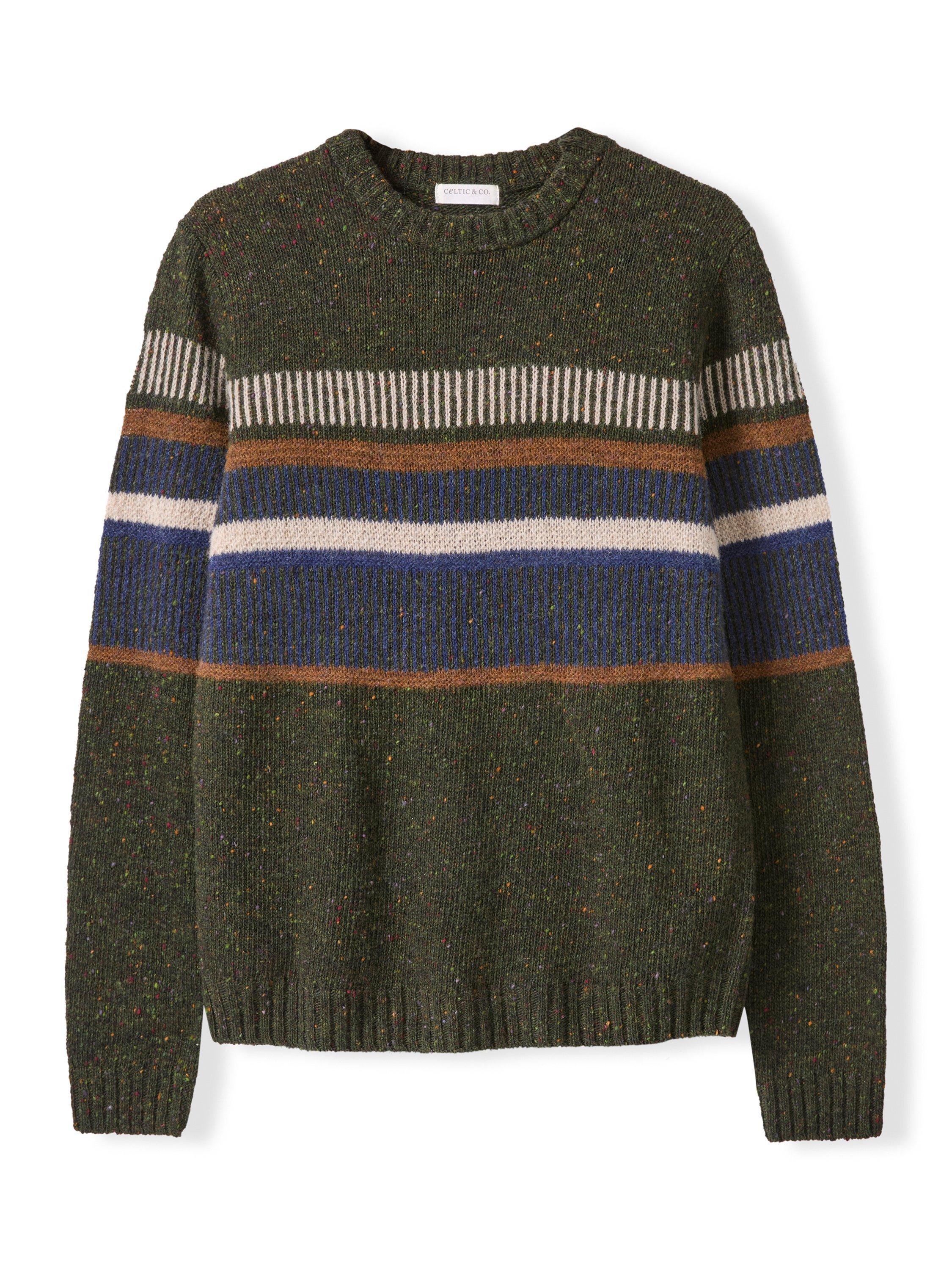 Made from real Donegal yarn, this wool jumper features a textured stitch pattern in contrasting colours running across the chest and sleeves.