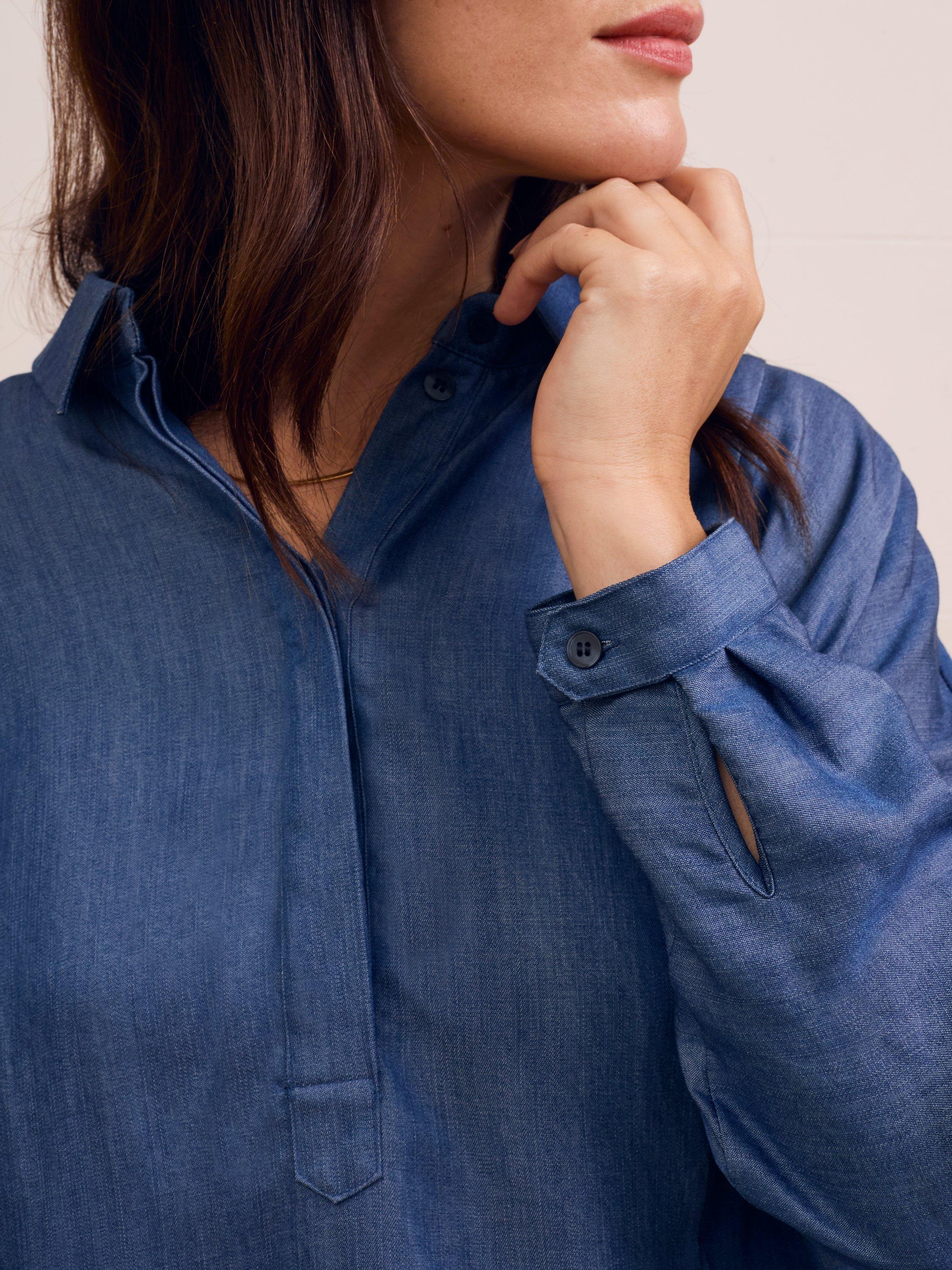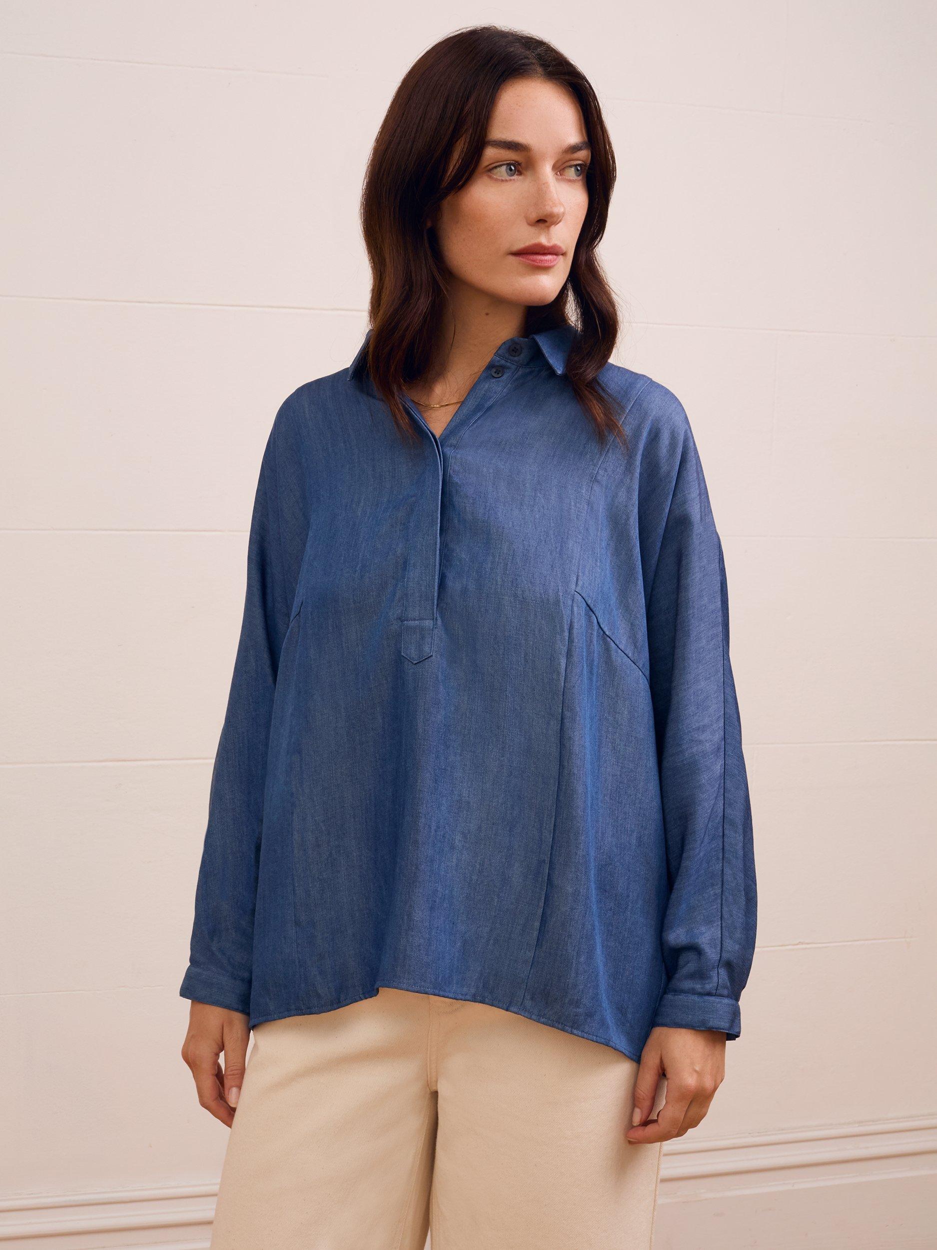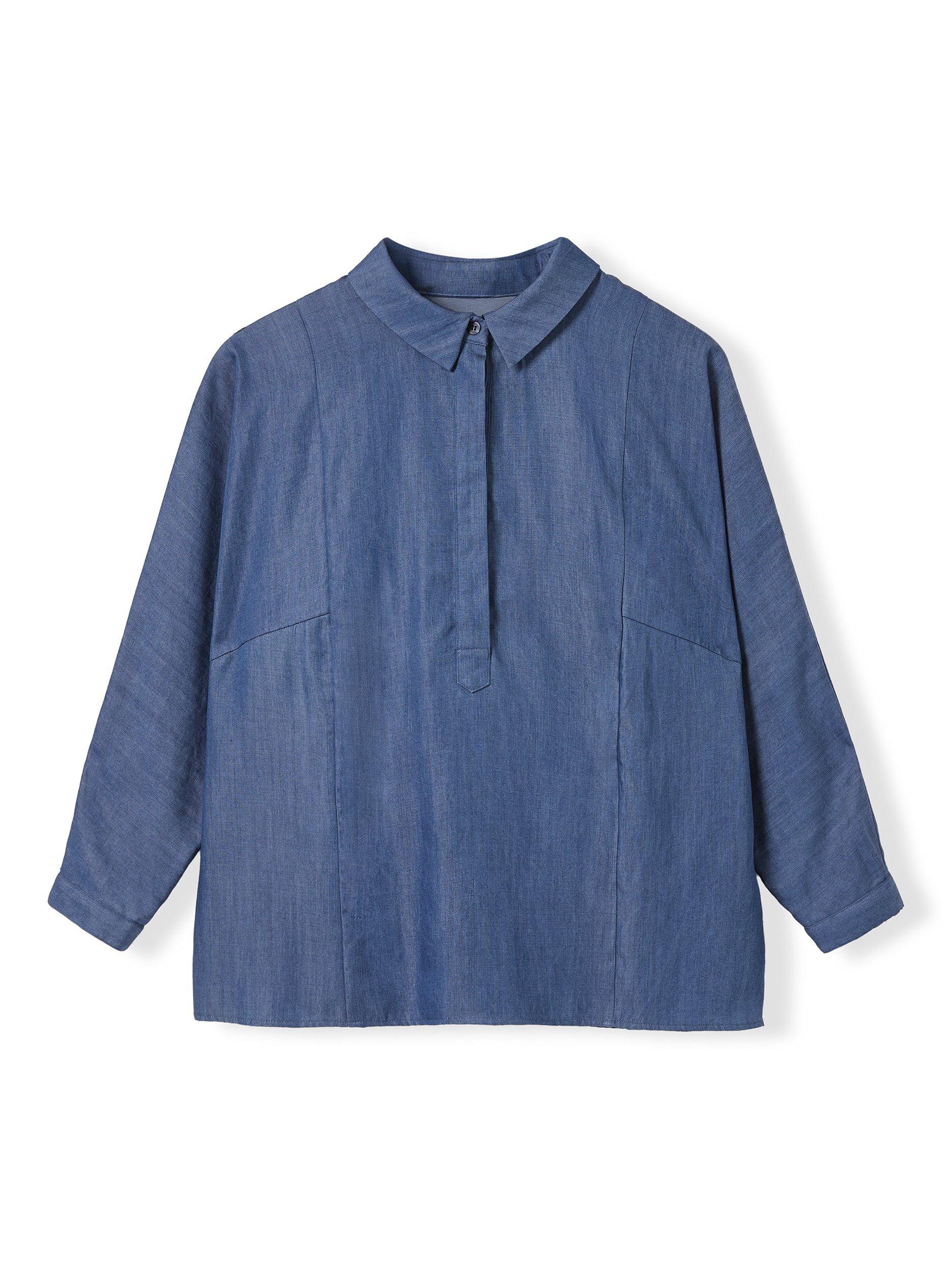 This relaxed-fit blouse features a collared neckline and distinctive balloon sleeves, offering a flattering silhouette. Designed with a concealed placket and pop-over styling, its drapey fabric moves effortlessly, making it a refined choice for everyday wear.