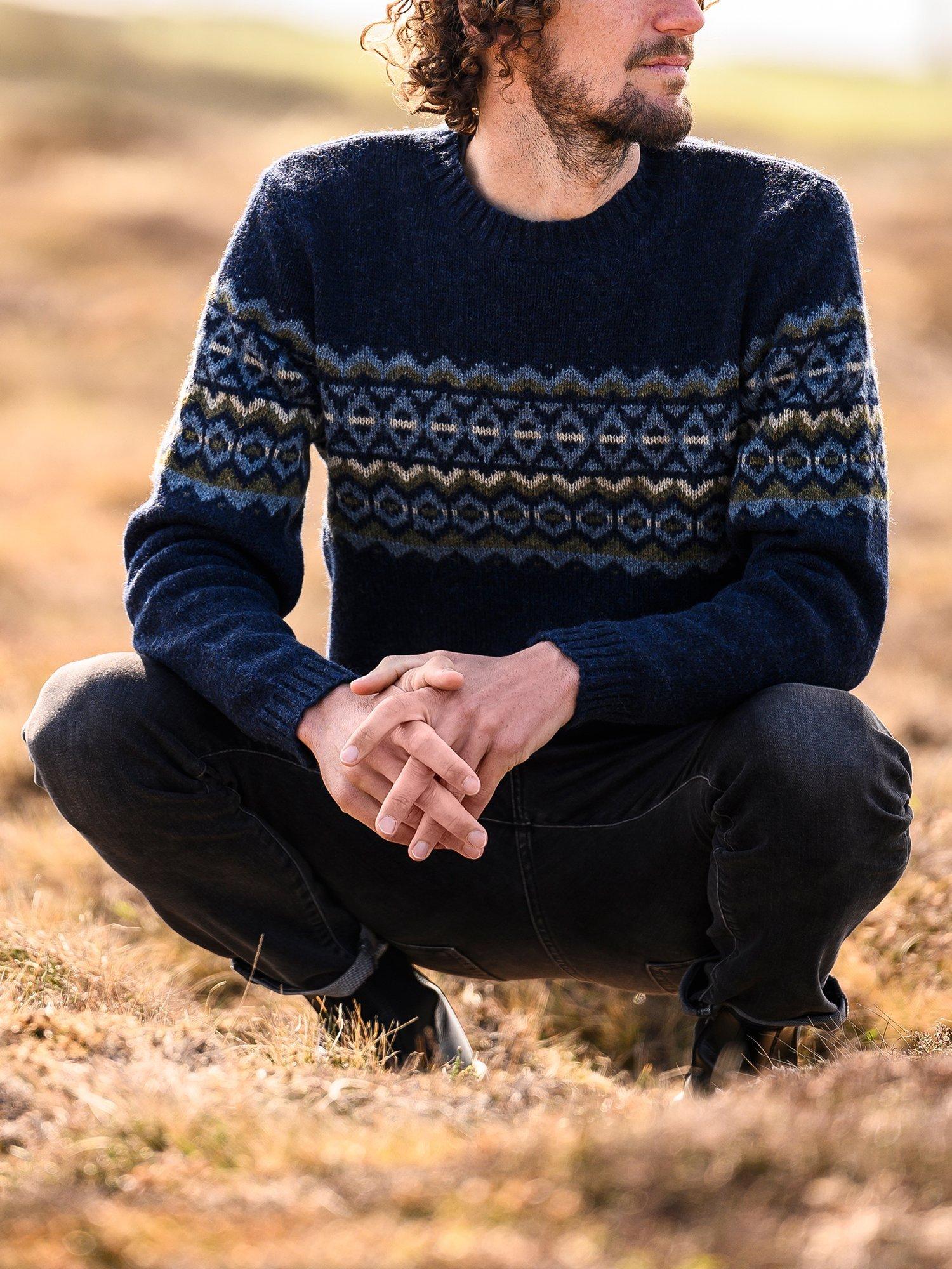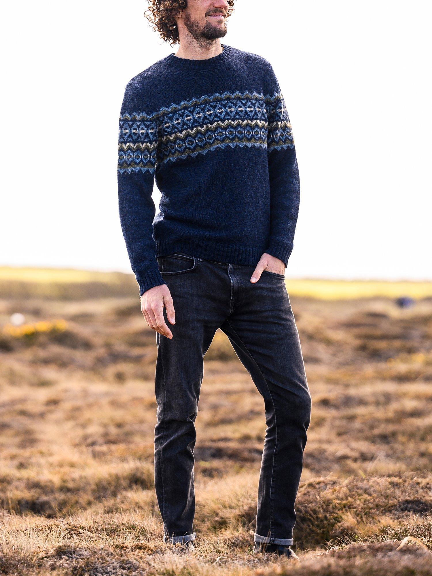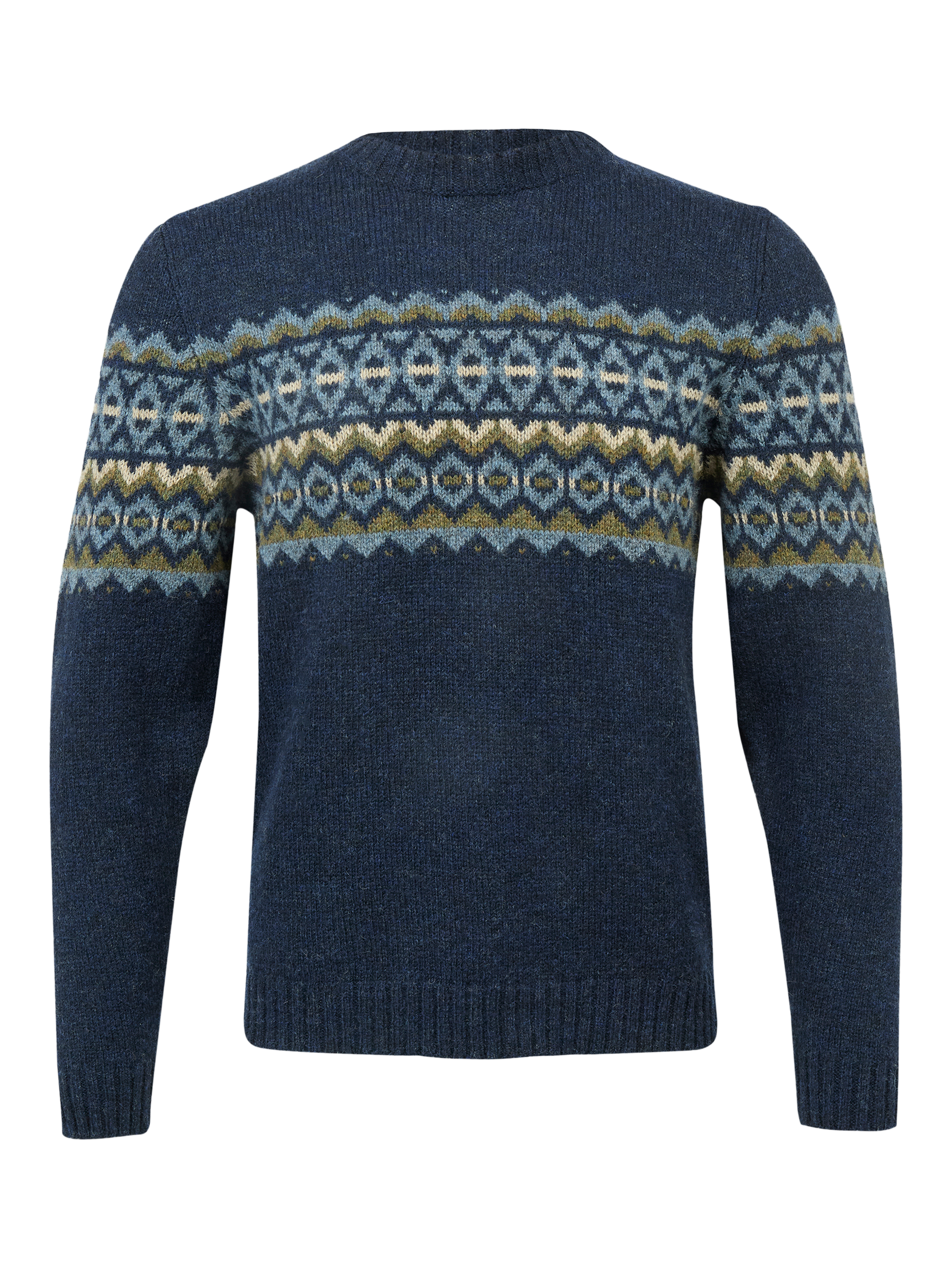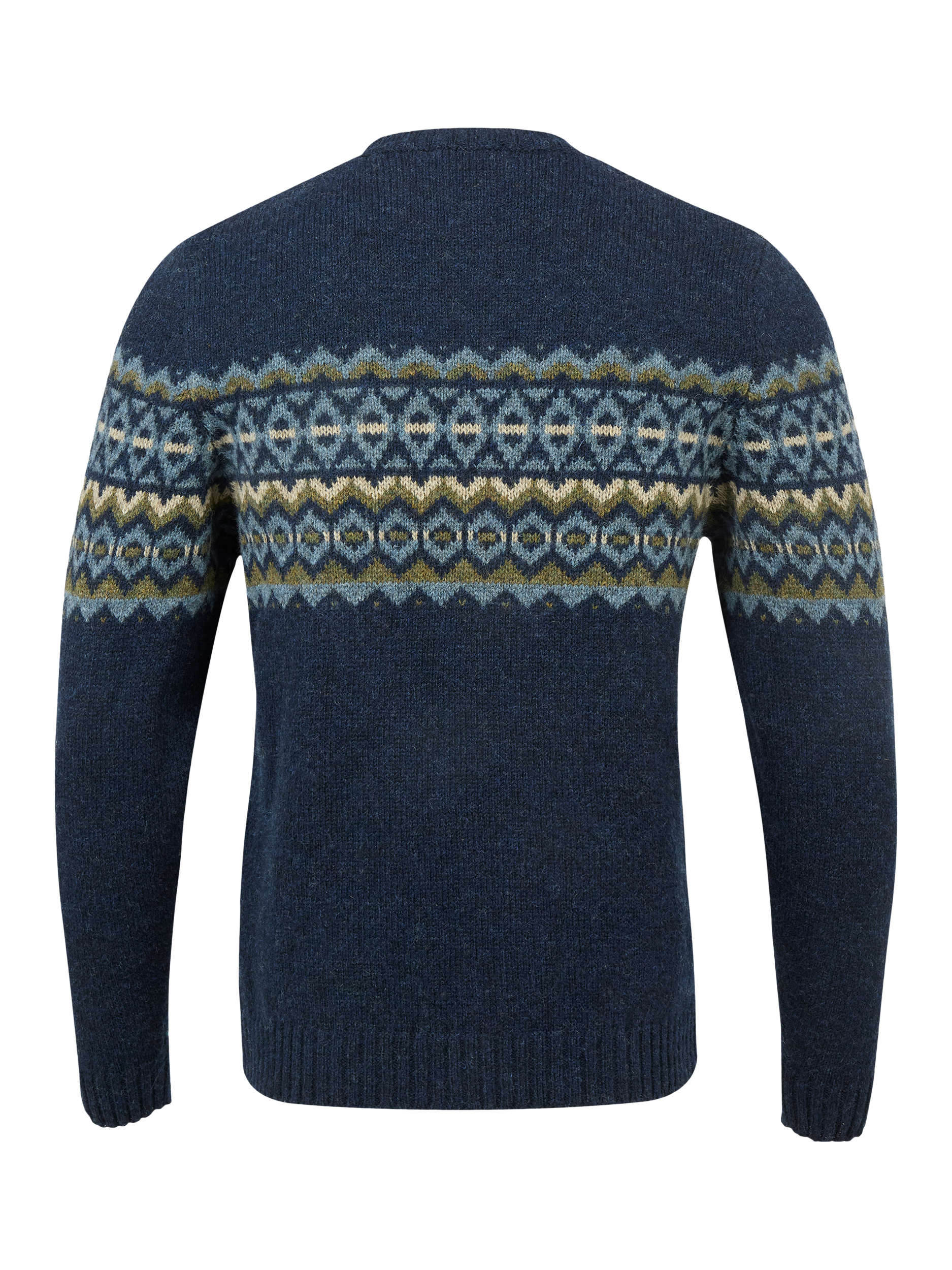 Featuring a Fair Isle pattern made up of diamonds, chevrons and zigzags, this crew-neck jumper is the perfect combination of authentic and contemporary style. It's knitted in a classic Shetland-style yarn, which delivers a rustic handle and second-to-none warmth, and finished with ribbing at the collar, cuffs and hem. The oatmeal-fleck yarn is the perfect base for the coastal-inspired colour palette of the Fair Isle design.