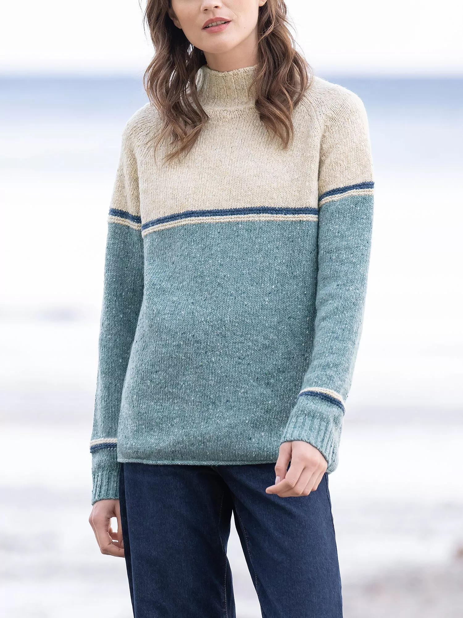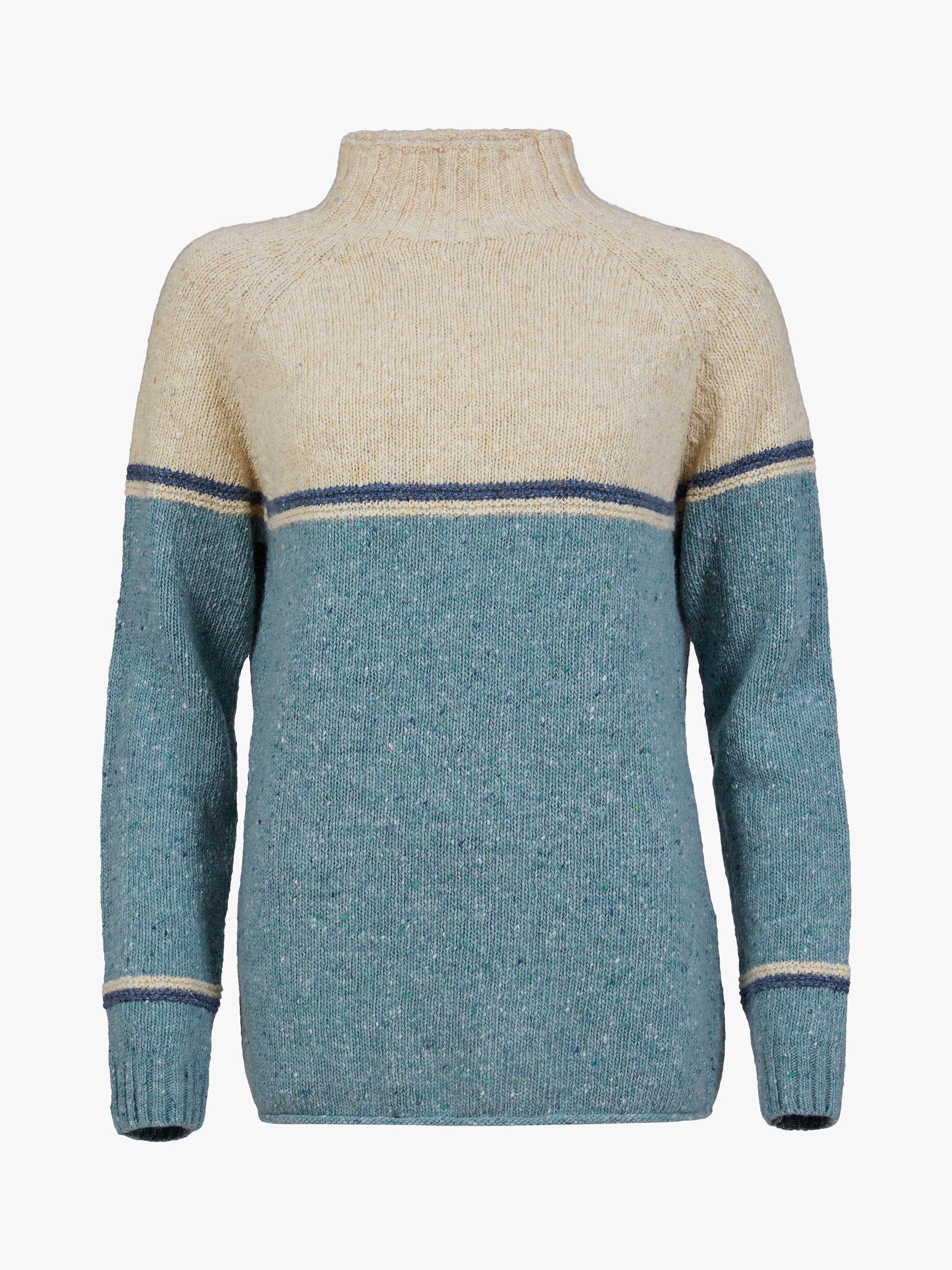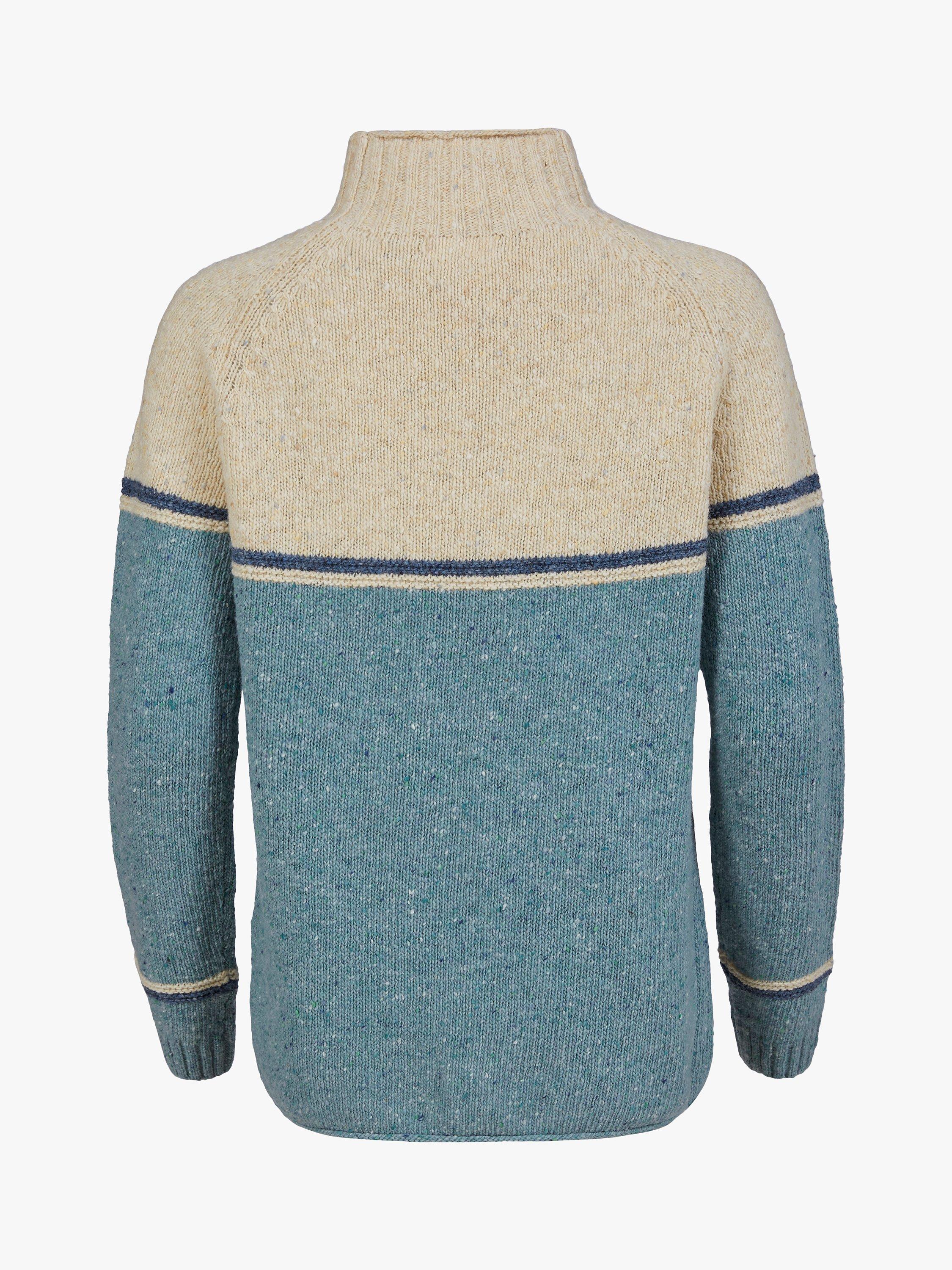 This Celtic & Co. funnel-neck jumper is cut to a generous shape for a cosy feel and easy layering, in genuine Donegal wool that's been spun and dyed in Ireland for that authentic look. The yarns have been twisted to give a traditional nepped effect to the modern colour-blocking. We'd suggest sizing down if you'd like a closer fit.