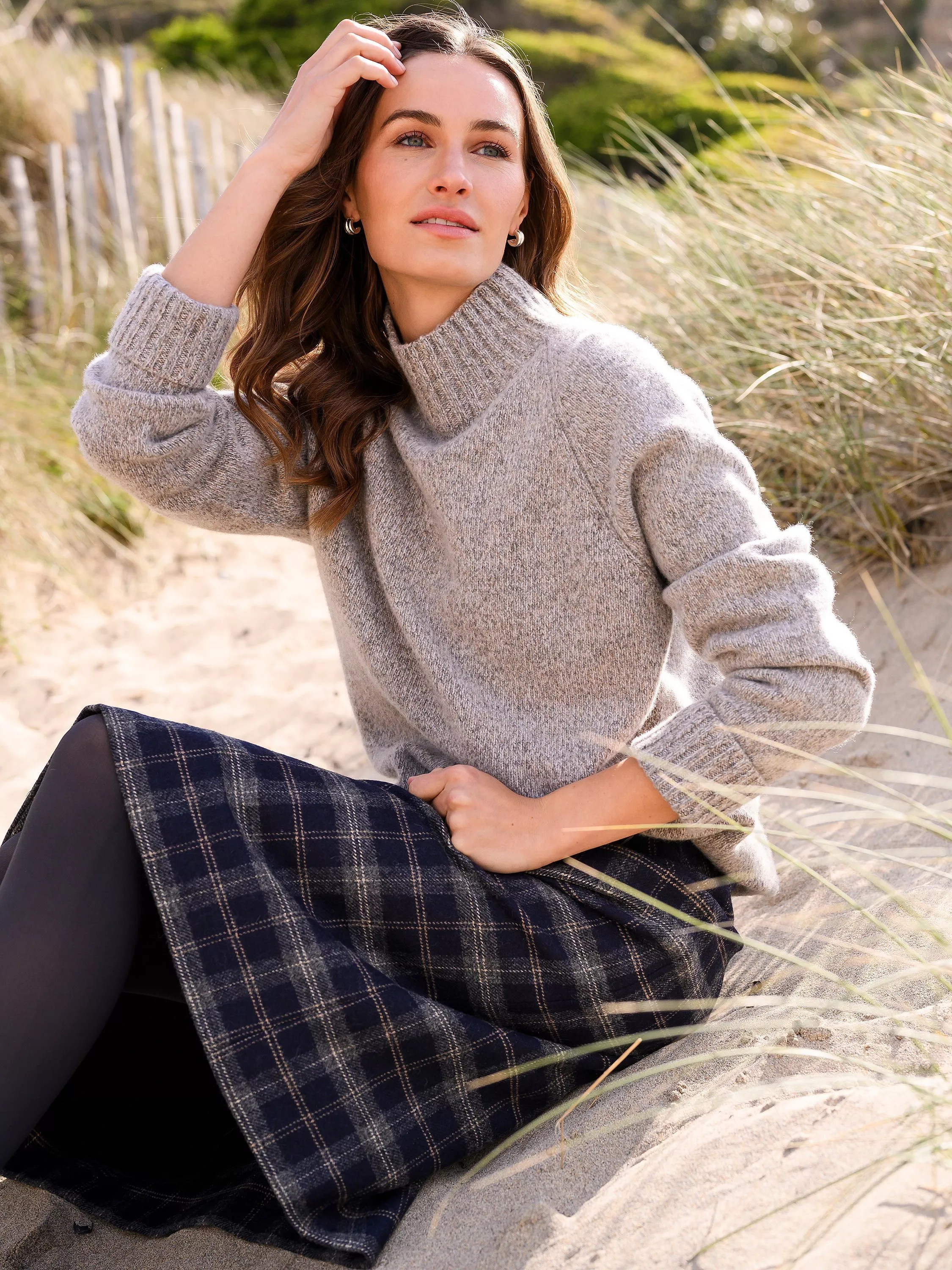 Topped with a funnel neck for a modern silhouette, this midweight jumper features ribbed accents at the collar, hem and cuffs. The yarn is a twisted combination of different shades, giving a richly coloured, textured effect.