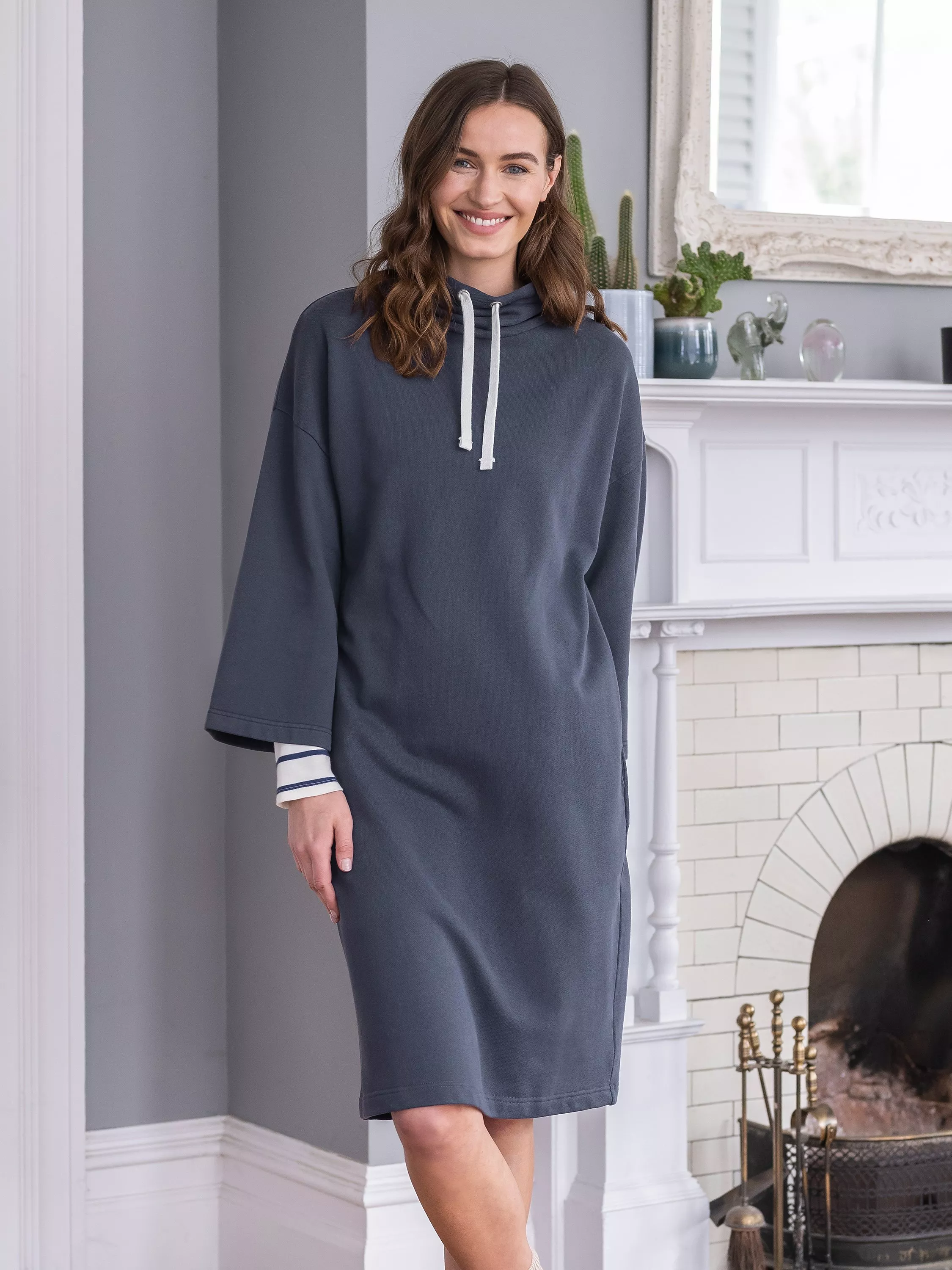 The ultimate in comfort, our knee length funnel neck sweatshirt dress is designed to be luxuriously comfy for lounging in. Made from loop back jersey sweatshirting, this dress features a drawstring at the funnel neckline in contrast cotton tape ties. Slouchy with cropped, wide sleeves, we've achieved an easy, straight body fit with a dropped shoulder. Details include pockets in the side seam.