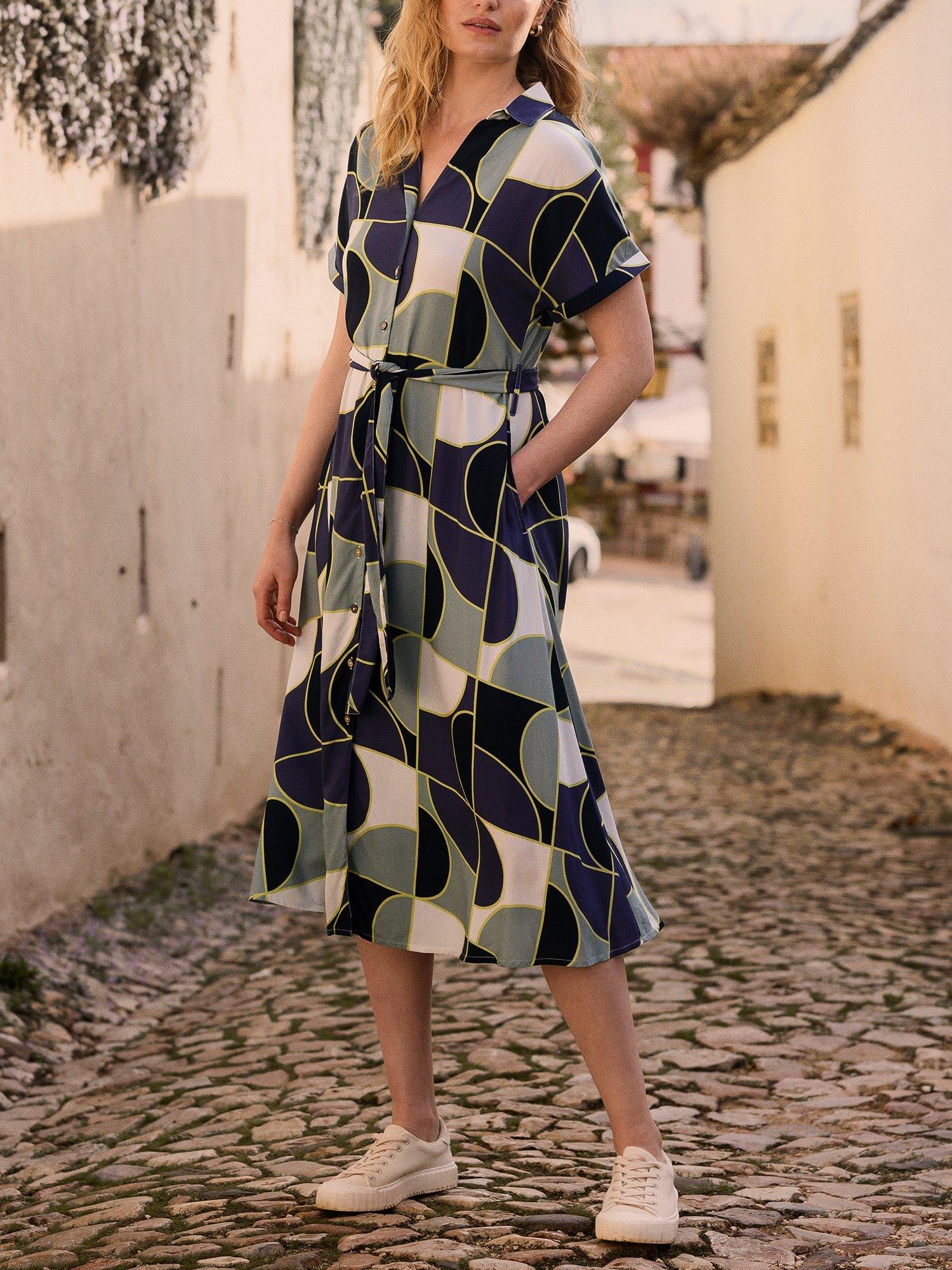 This versatile midi shirt dress features a collared V-neckline and grown-on sleeves with turnback cuffs, along with an easy-to-wear self-tie belt for adjustable styling. A wardrobe staple with a relaxed fit for every occasion.