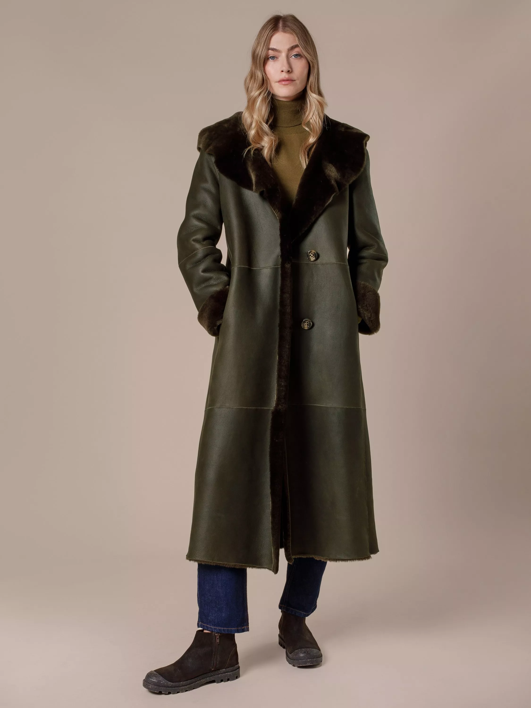 Celtic & Co.Hooded Wrap Pure Sheepskin Coat, Black Olive