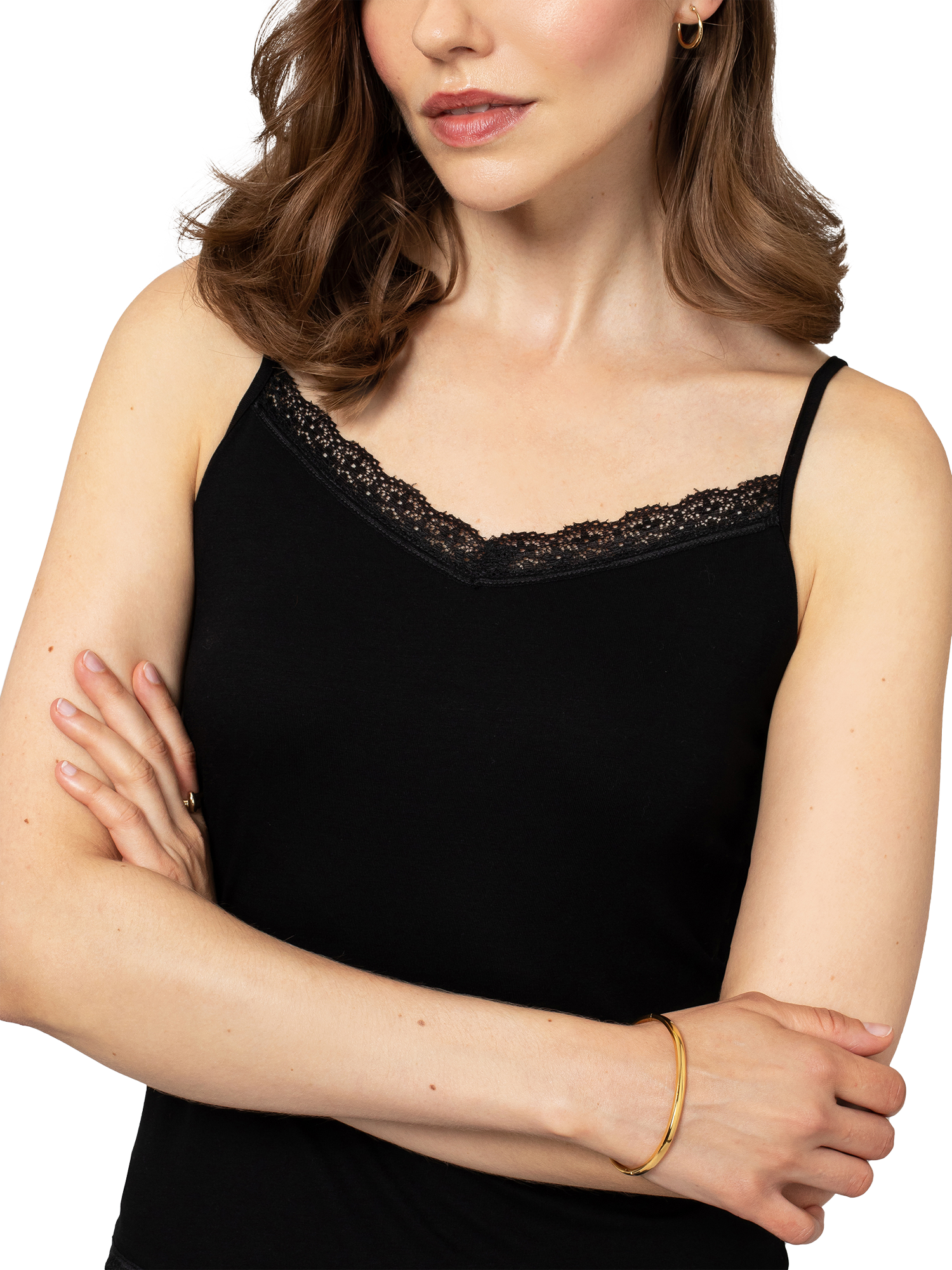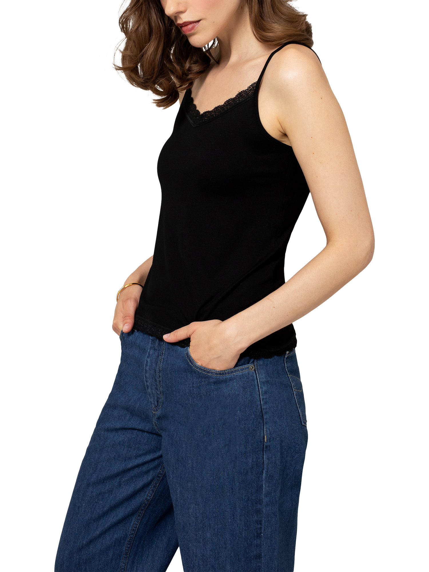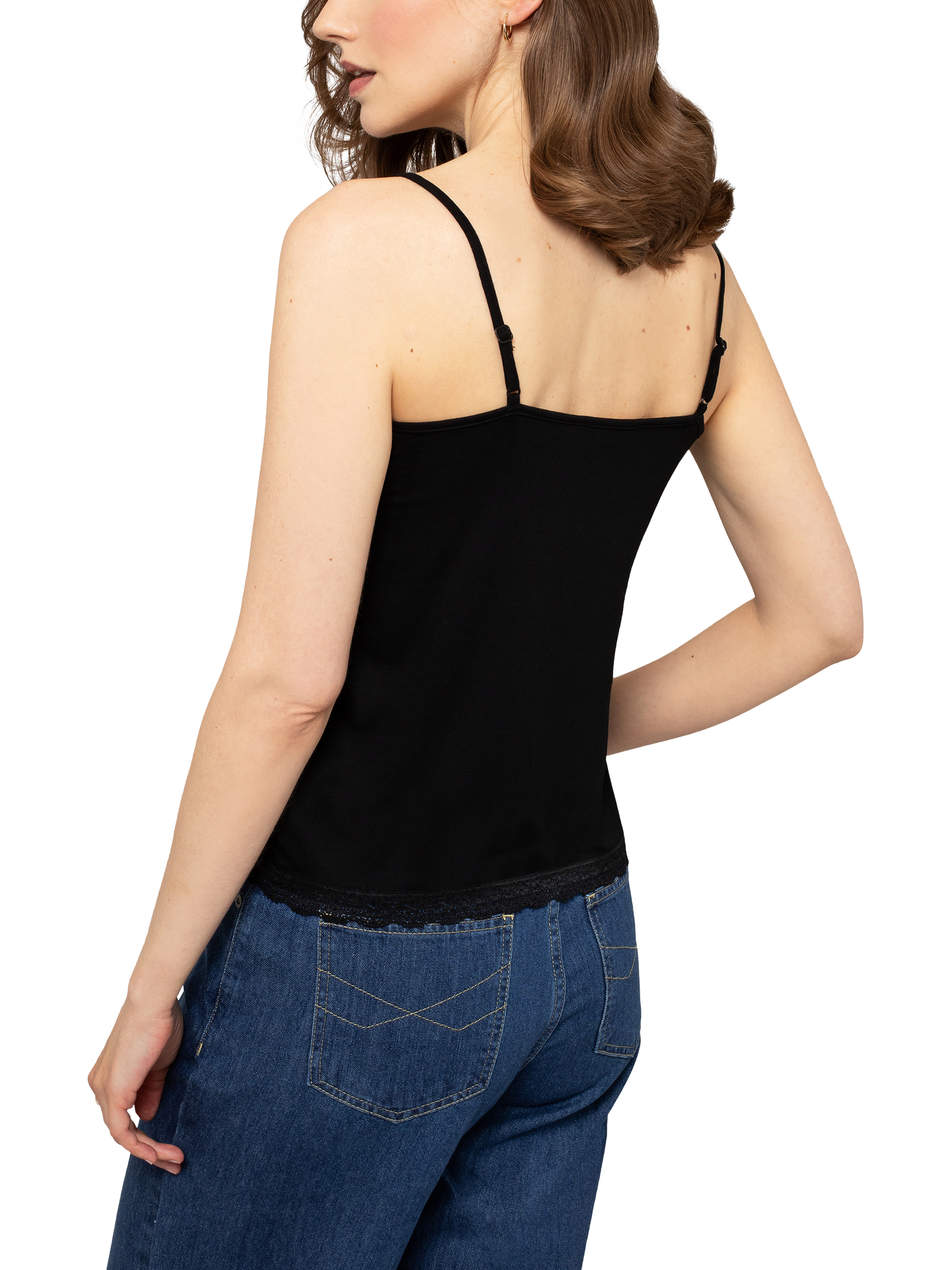 A loose-fitting camisole featuring delicate spaghetti straps which can be adjusted to your shape and lace trim on the v-neckline and hem.