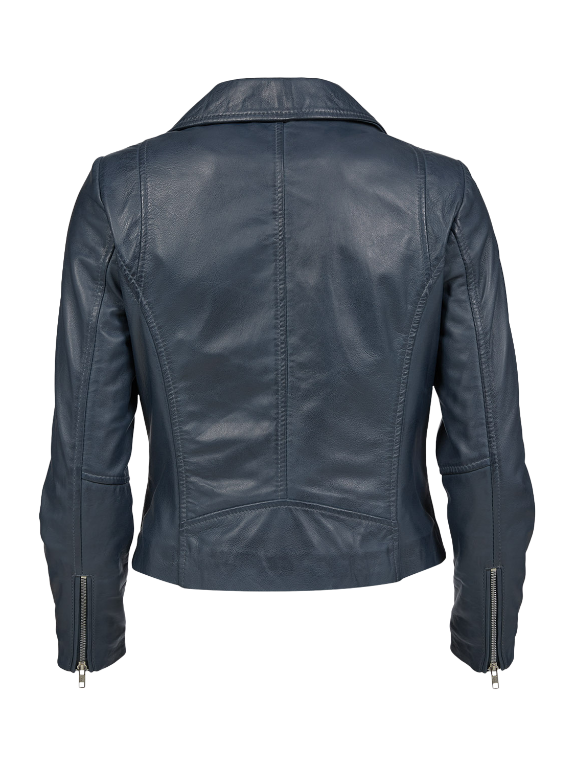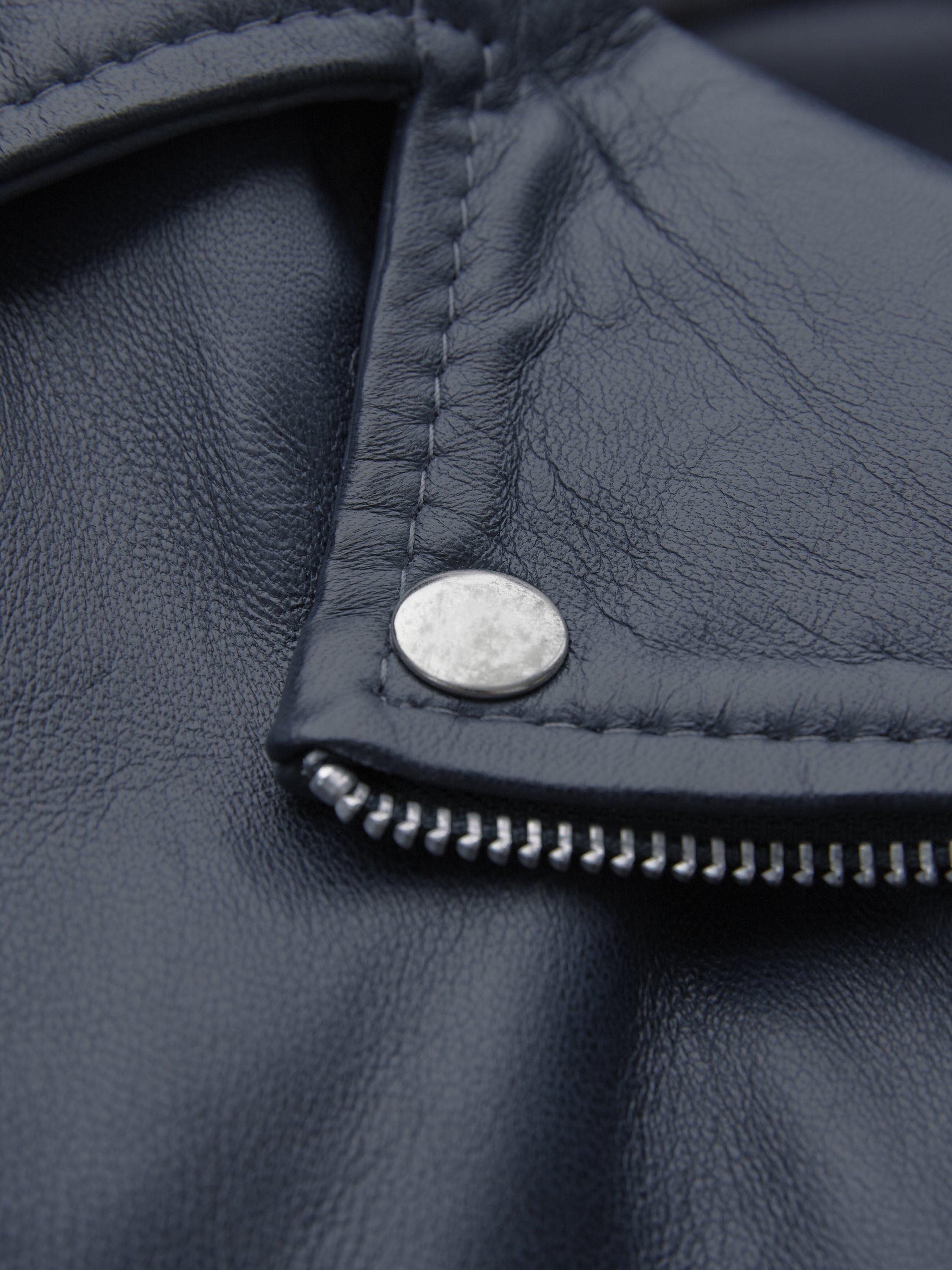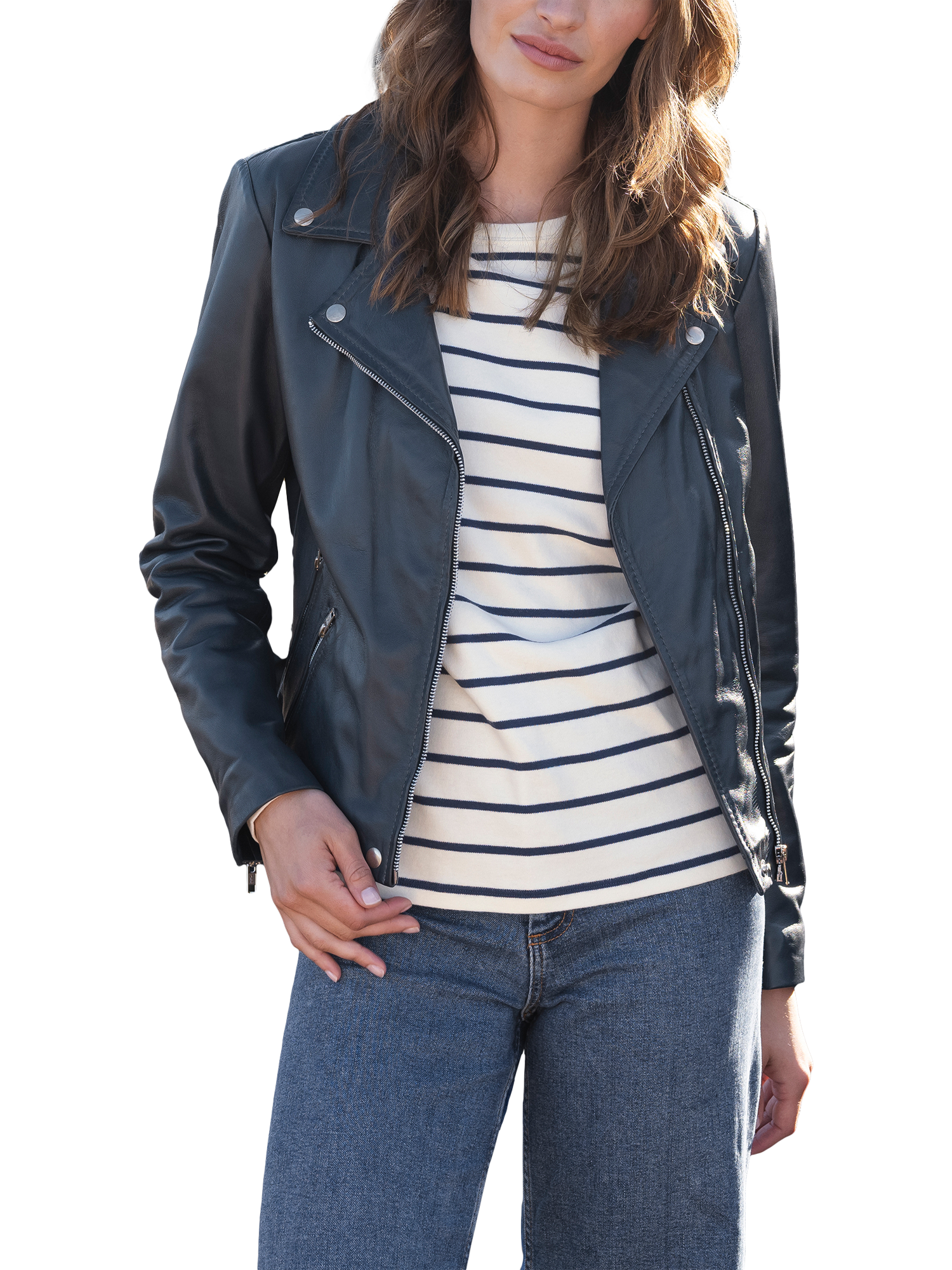 A classic biker style leather jacket with zipped pockets and popper stud detail on the collar lapels. Providing a slim, neat fit, the off-centre zip adds a flattering element.