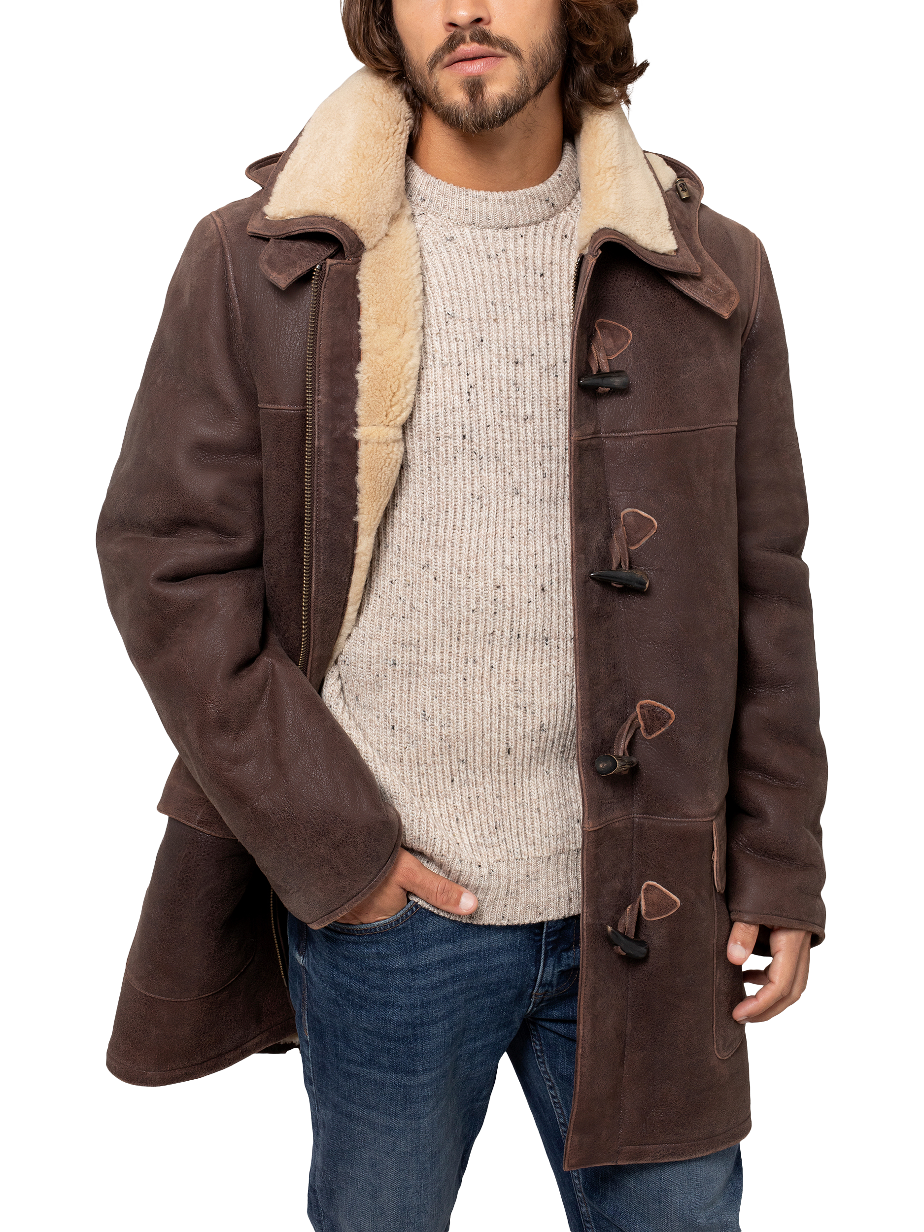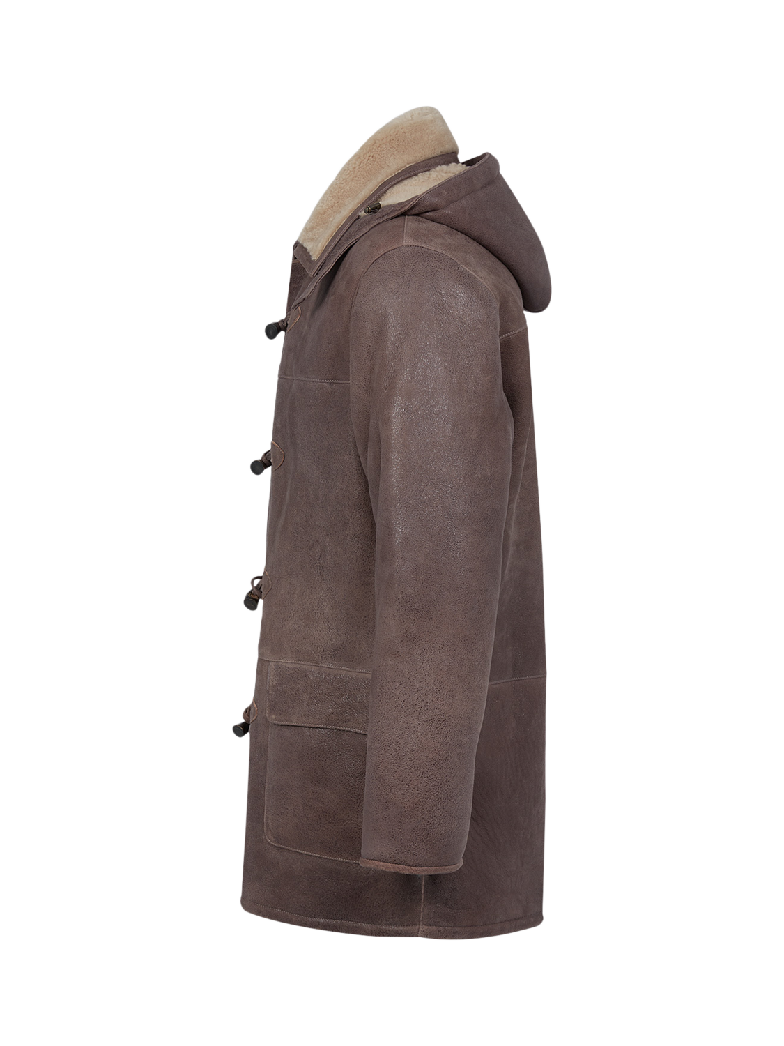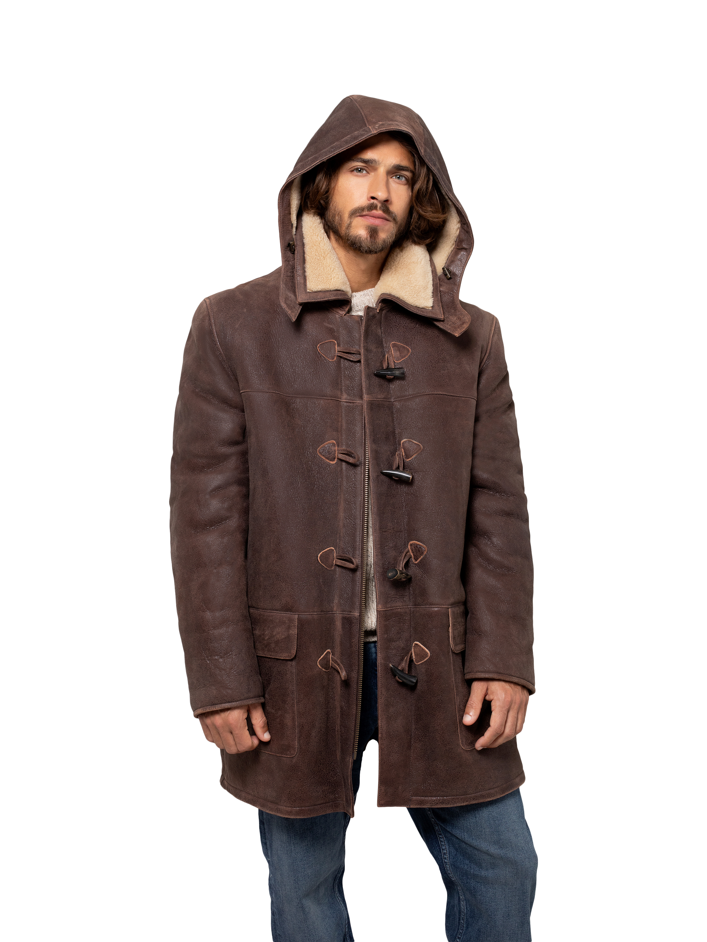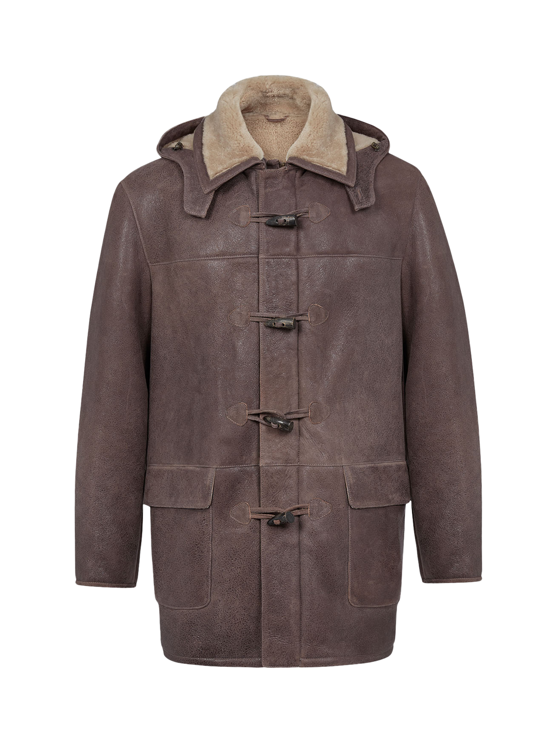 Crafted in rich leather with an antiqued finish and short, curly wool at the interior. Authentic horn toggles secure through the front with the benefit of an additional zip to keep the elements out.