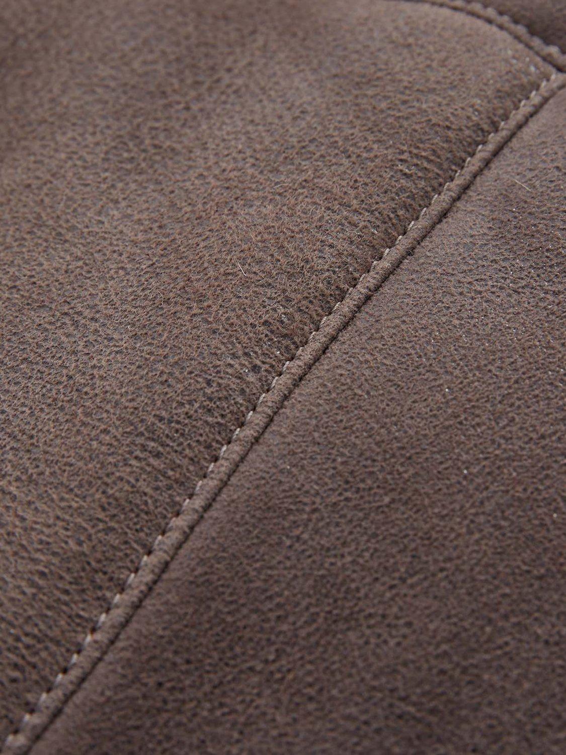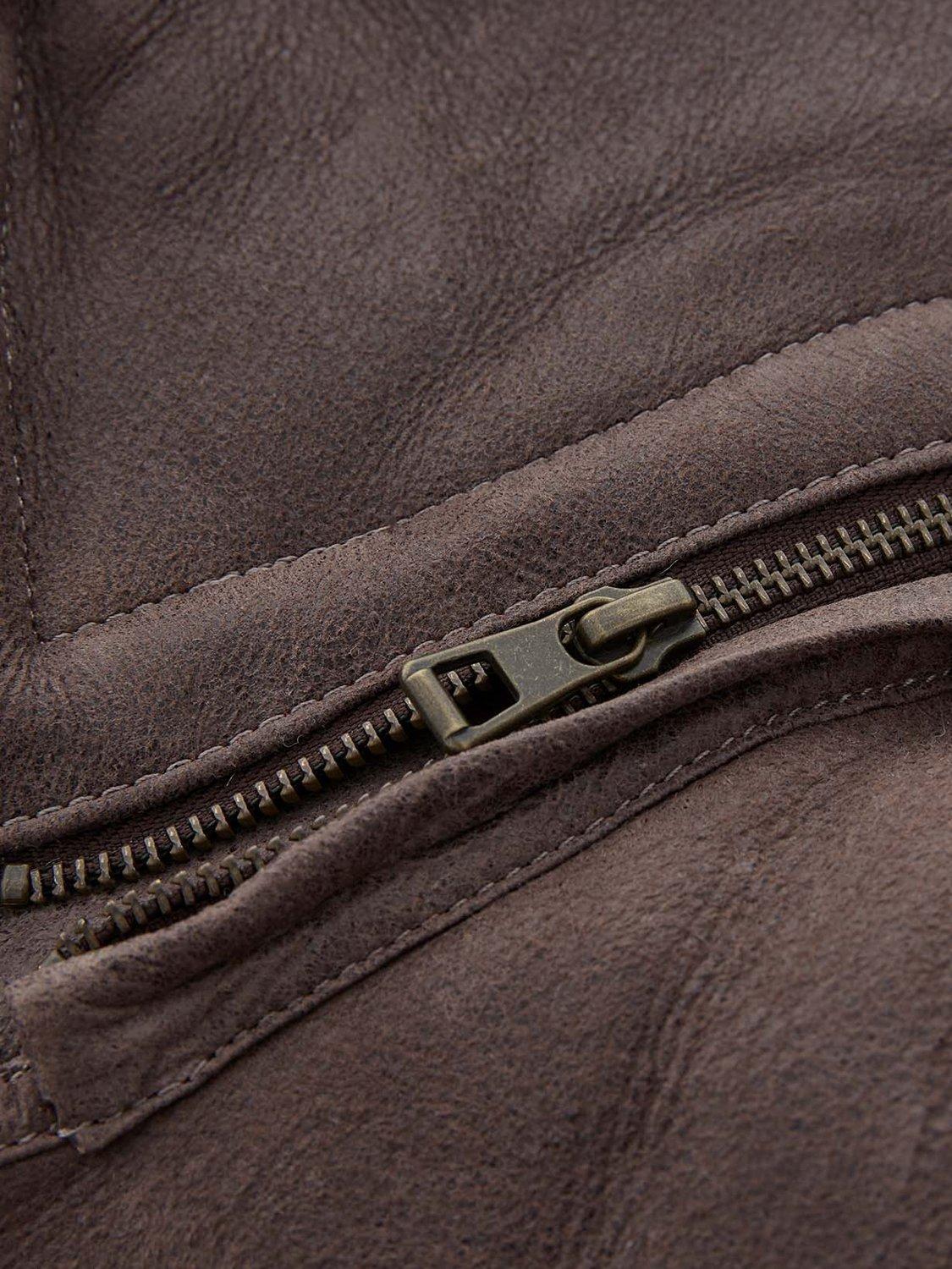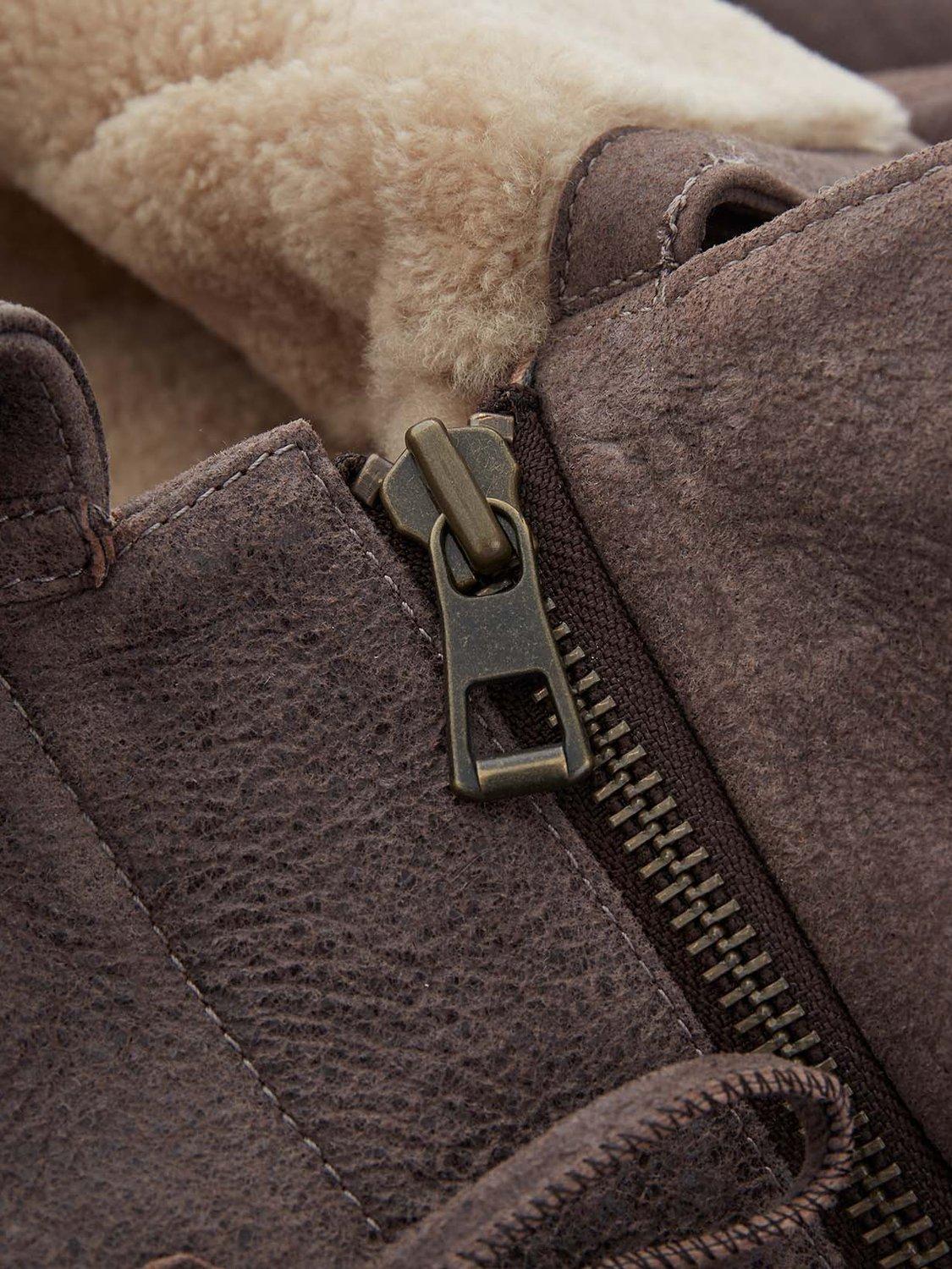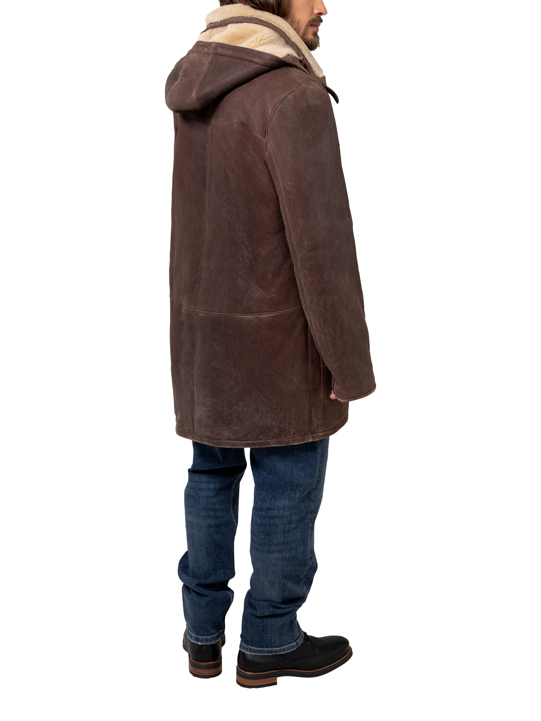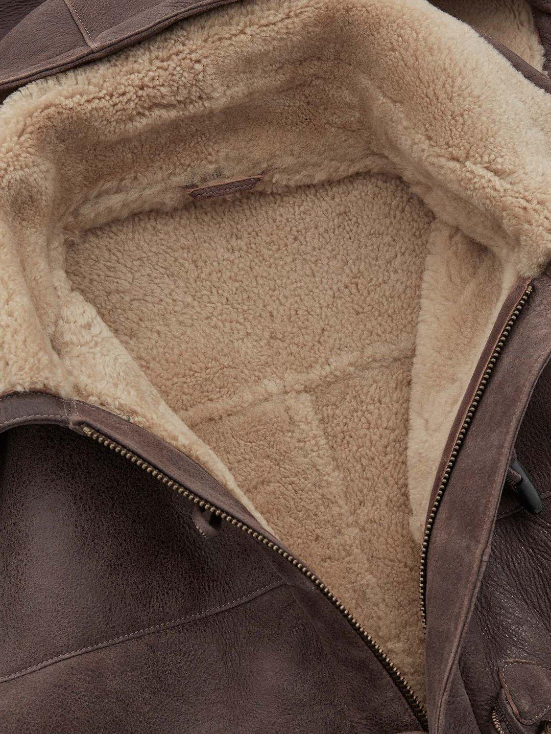 Crafted in rich leather with an antiqued finish and short, curly wool at the interior. Authentic horn toggles secure through the front with the benefit of an additional zip to keep the elements out.