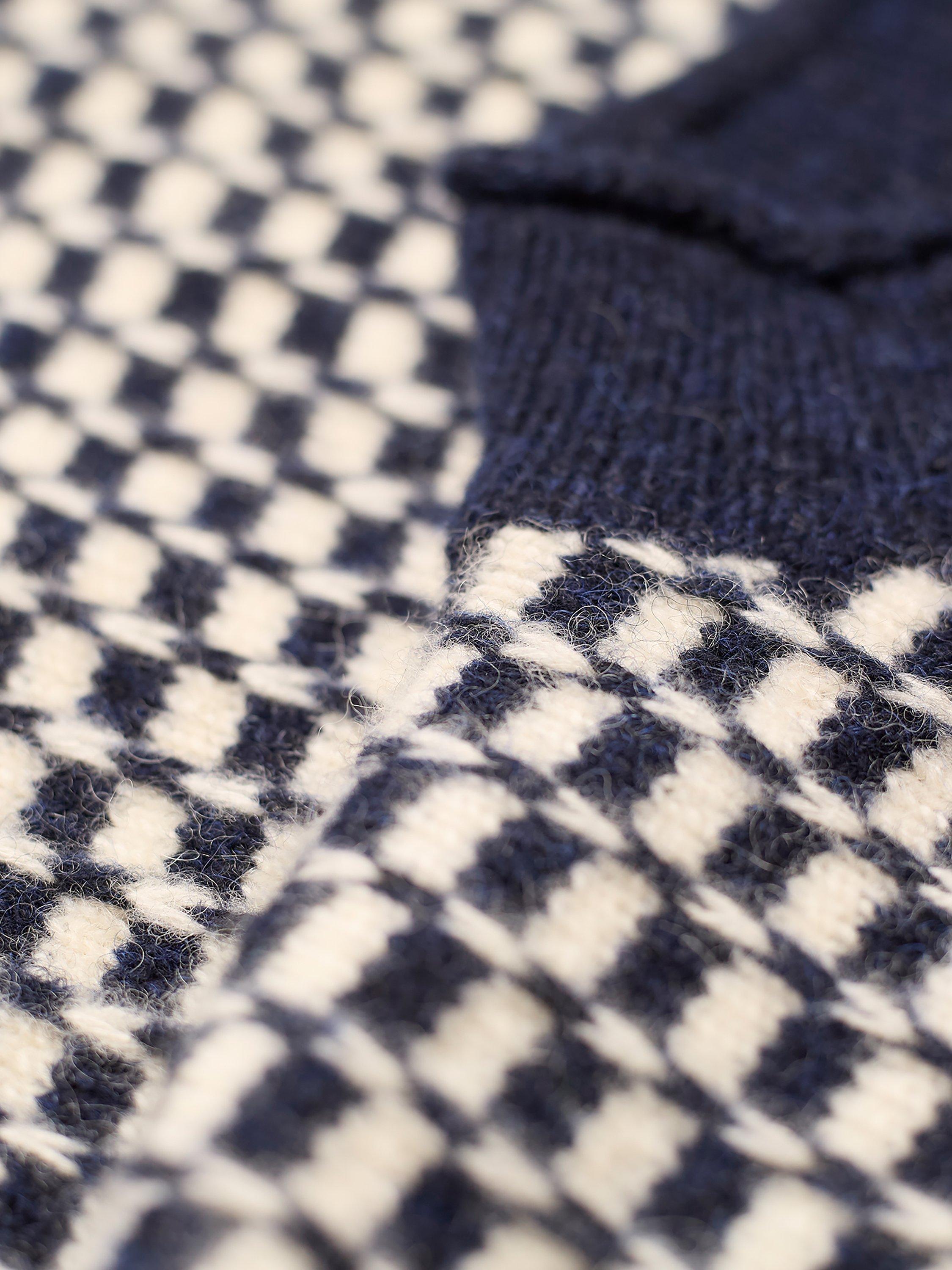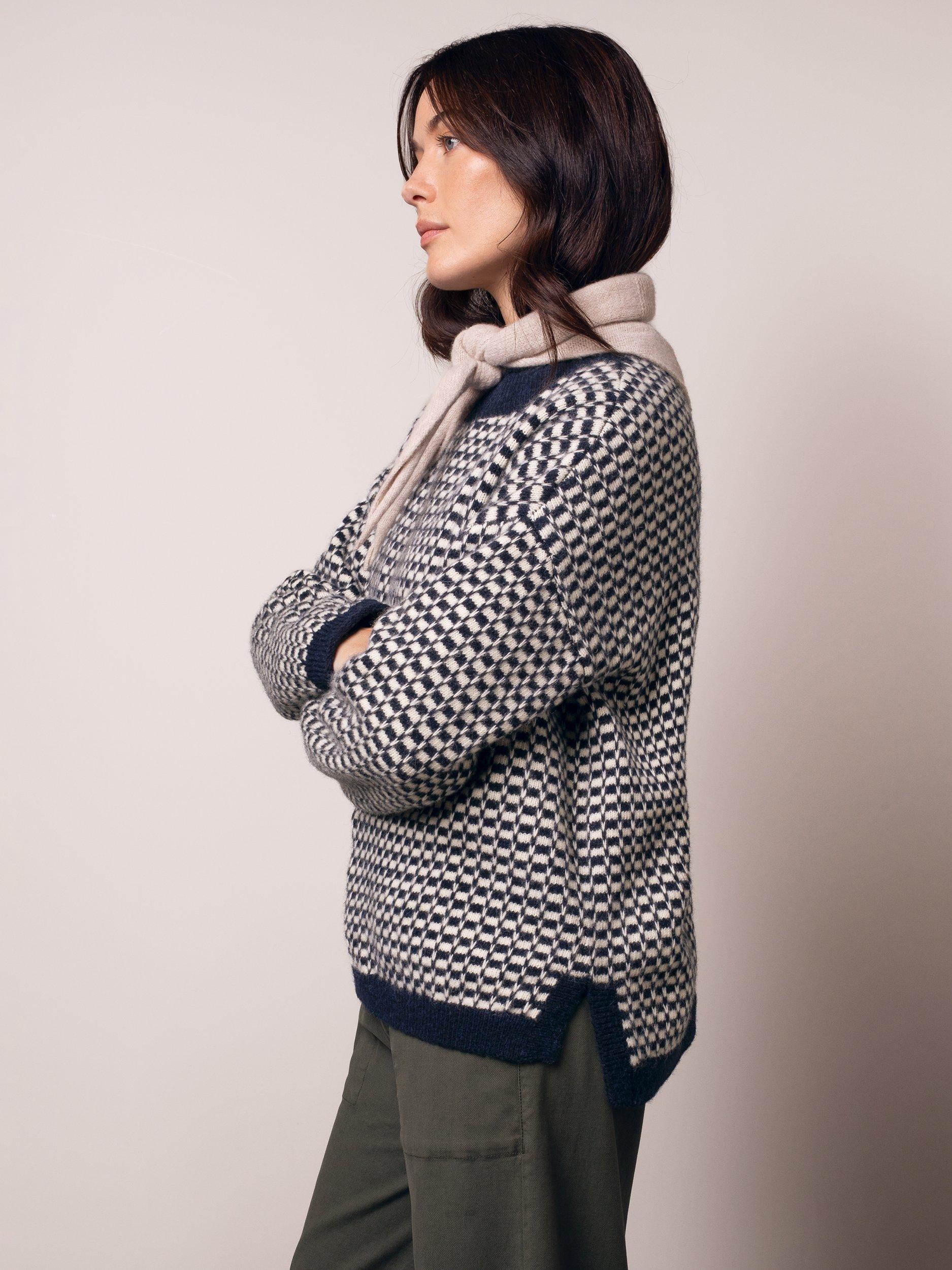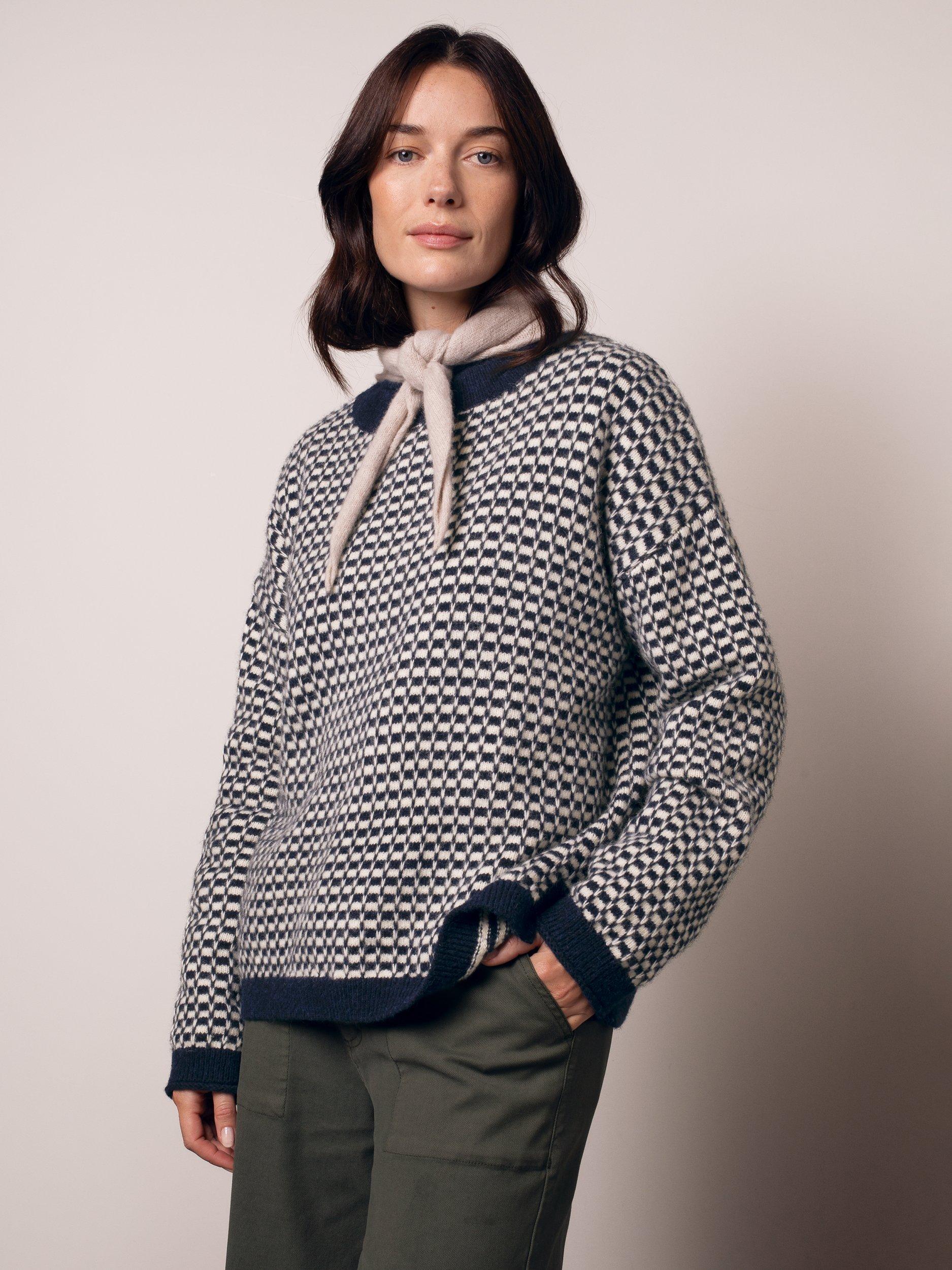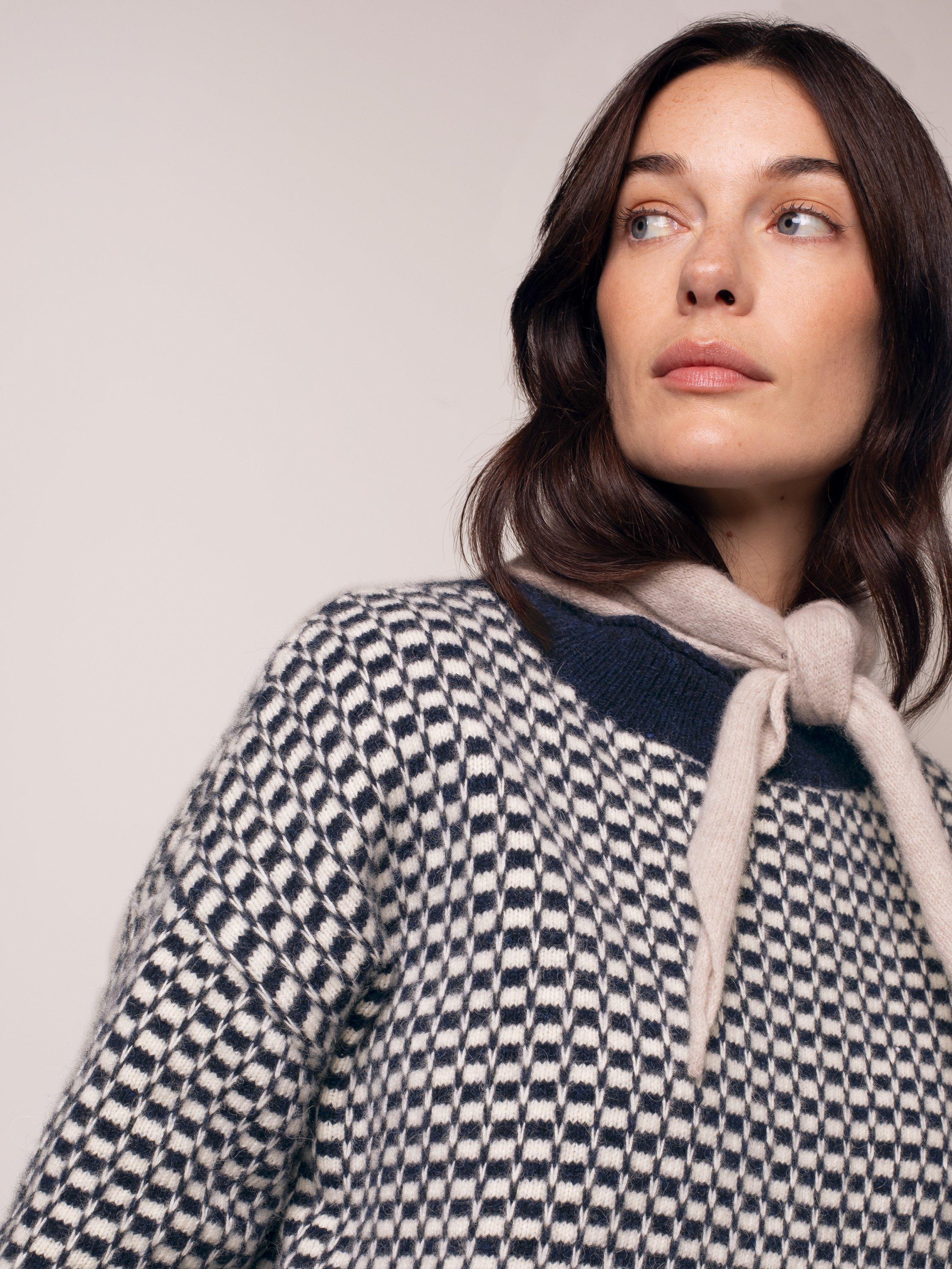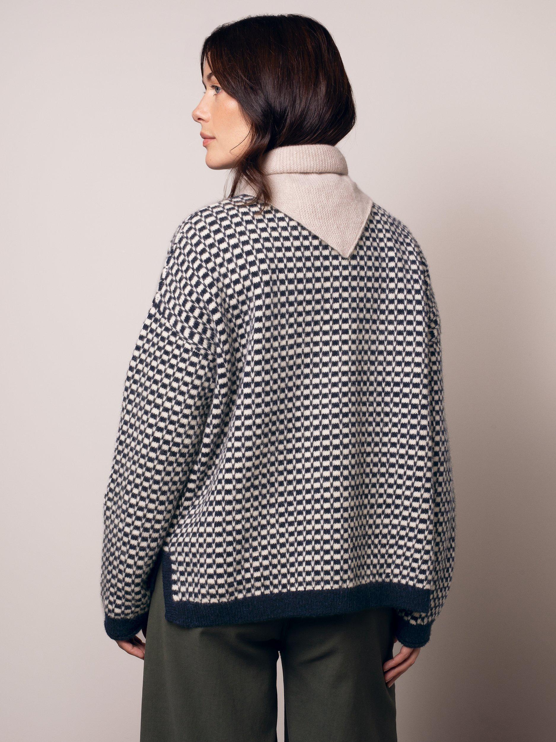 Introducing the charming Micro check funnel neck jumper; a special addition to your classic knitwear options. Super comfy in a boxy fit, breathable wide neck and in a sumptuous wool mix yarn composition. Pair with jeans and suede boots for a luxe every day outfit.