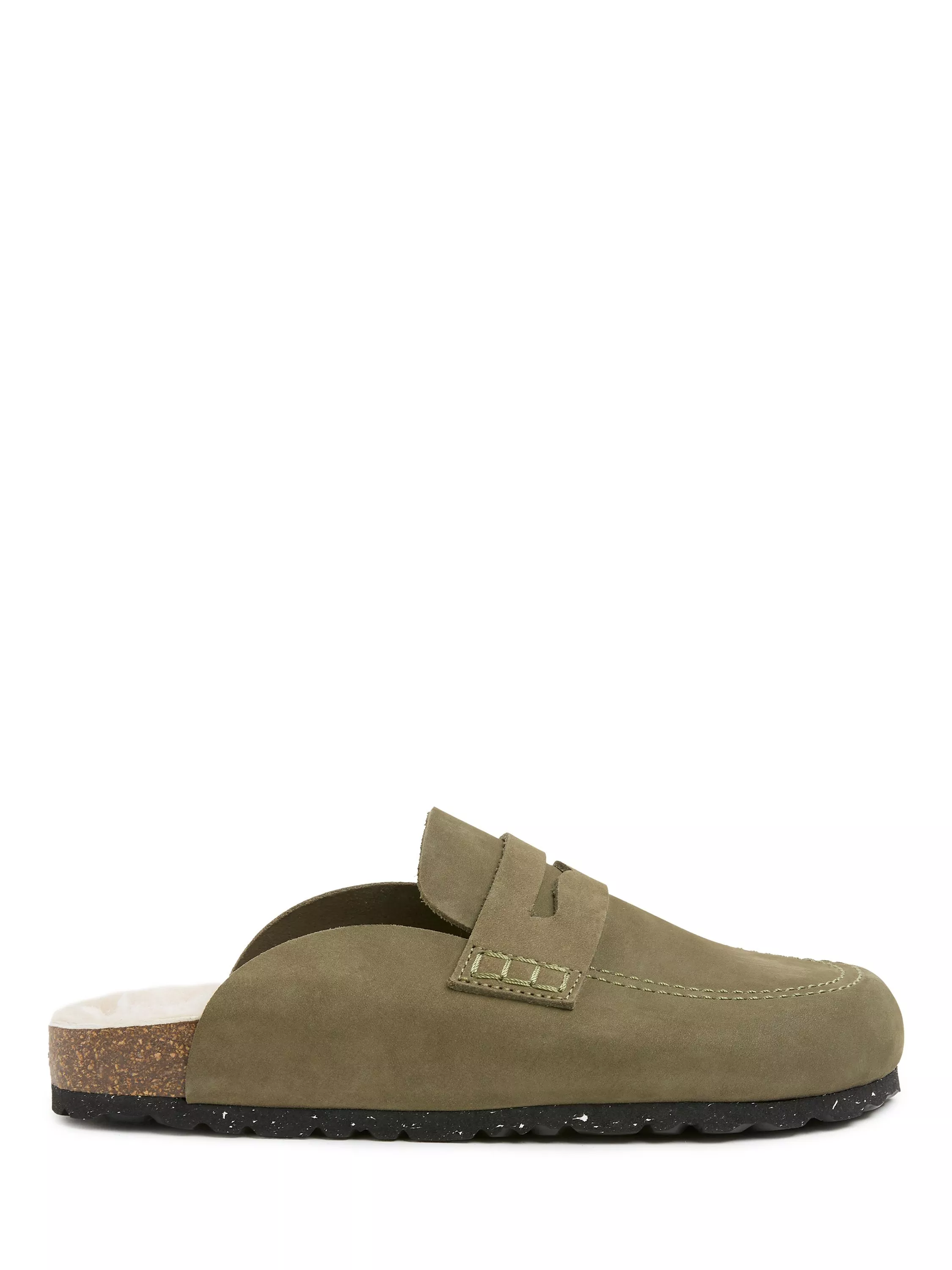 Penny loafer detailed slip-on clogs feature a nubuck upper. The insole is luxuriously lined with real sheepskin, complemented by a cork midsole and an outsole made from EVA.