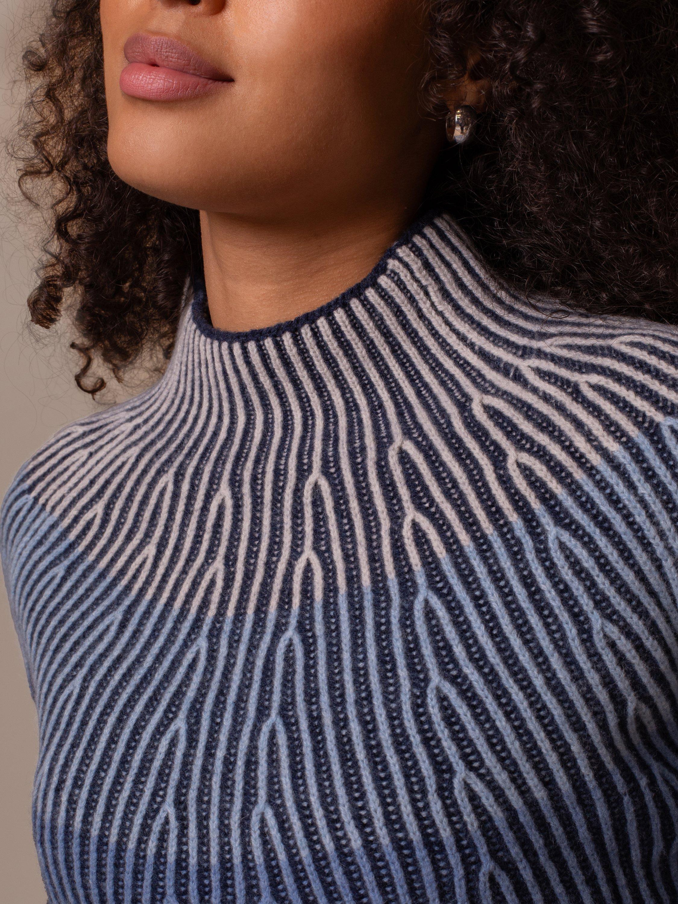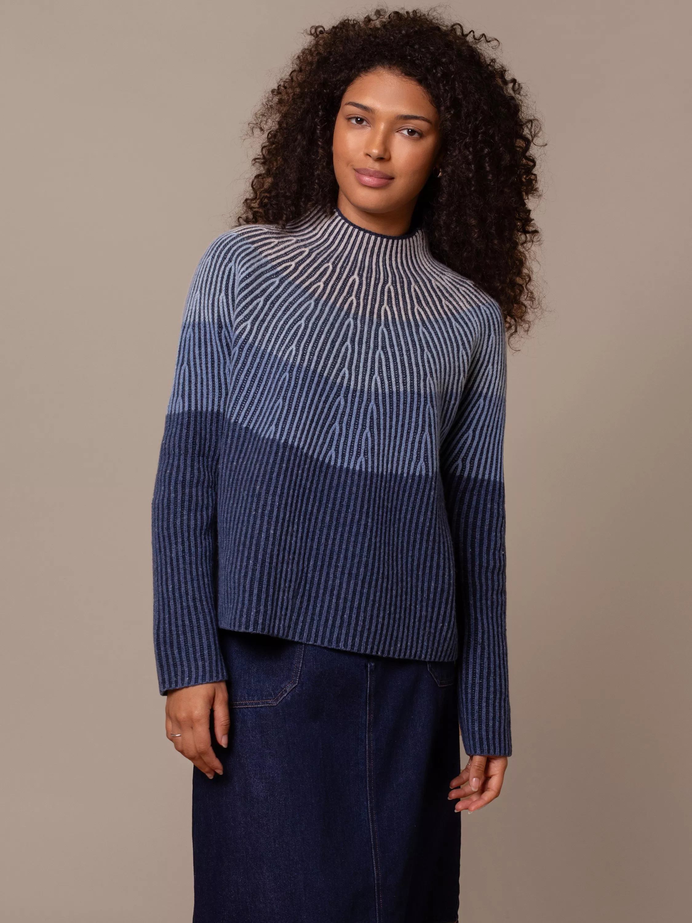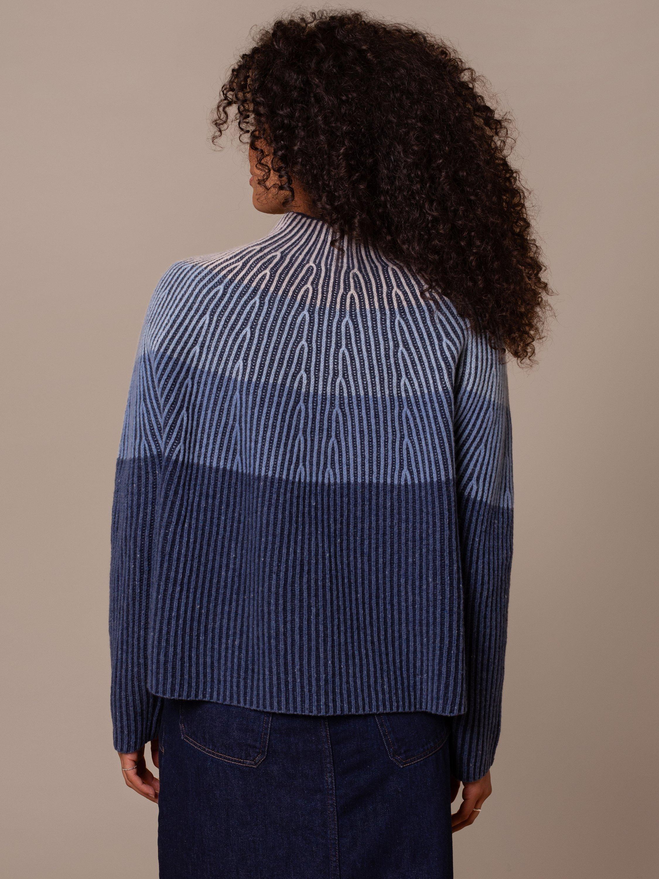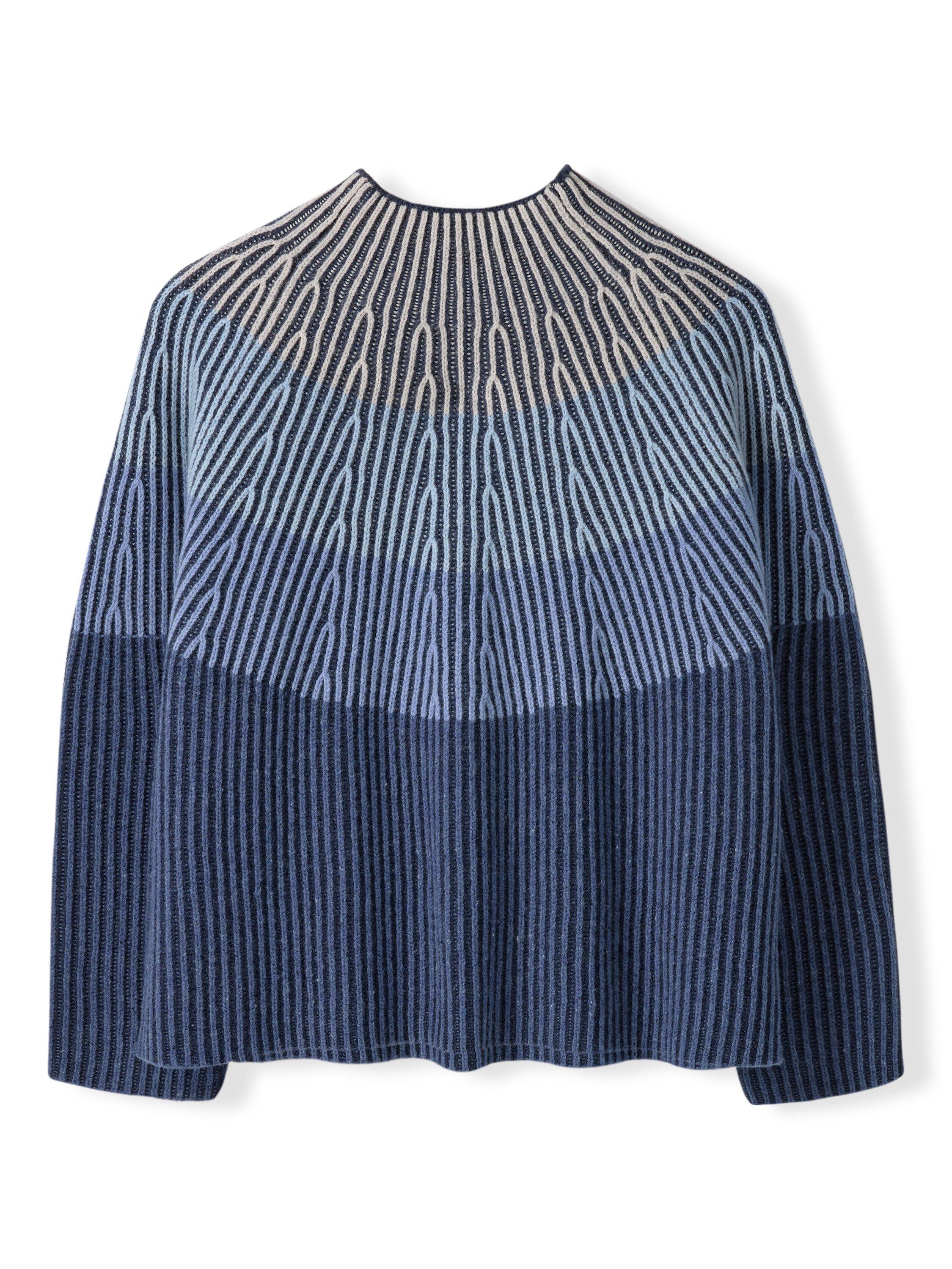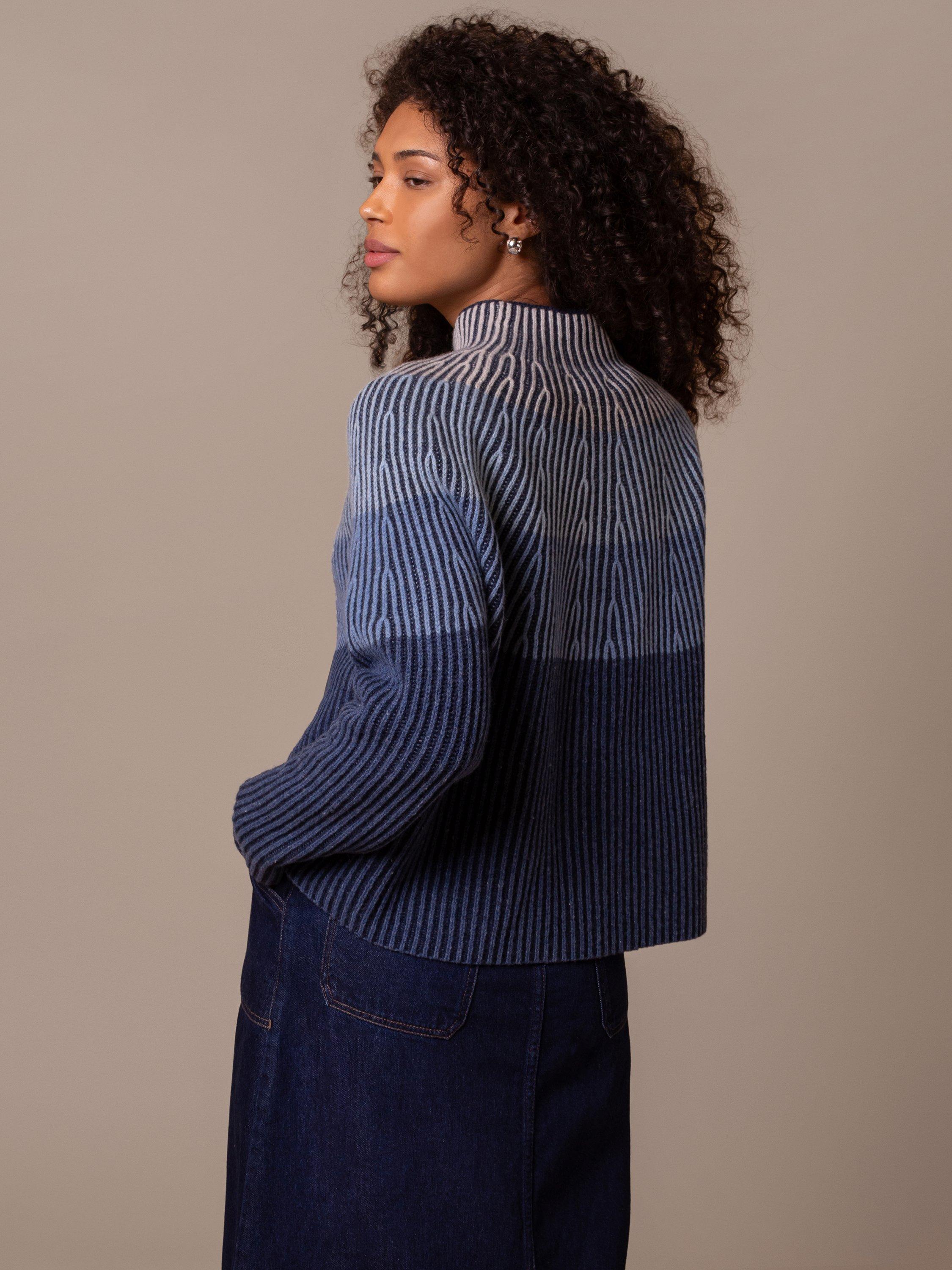 Beautiful ombre-effect gradient jumper with calming tonal colours. Ideal for refreshing your wardrobe, it has an all-over ribbed knit in a boxy shape that looks great against dark denim jeans. Made of soft lambswool for comfort.