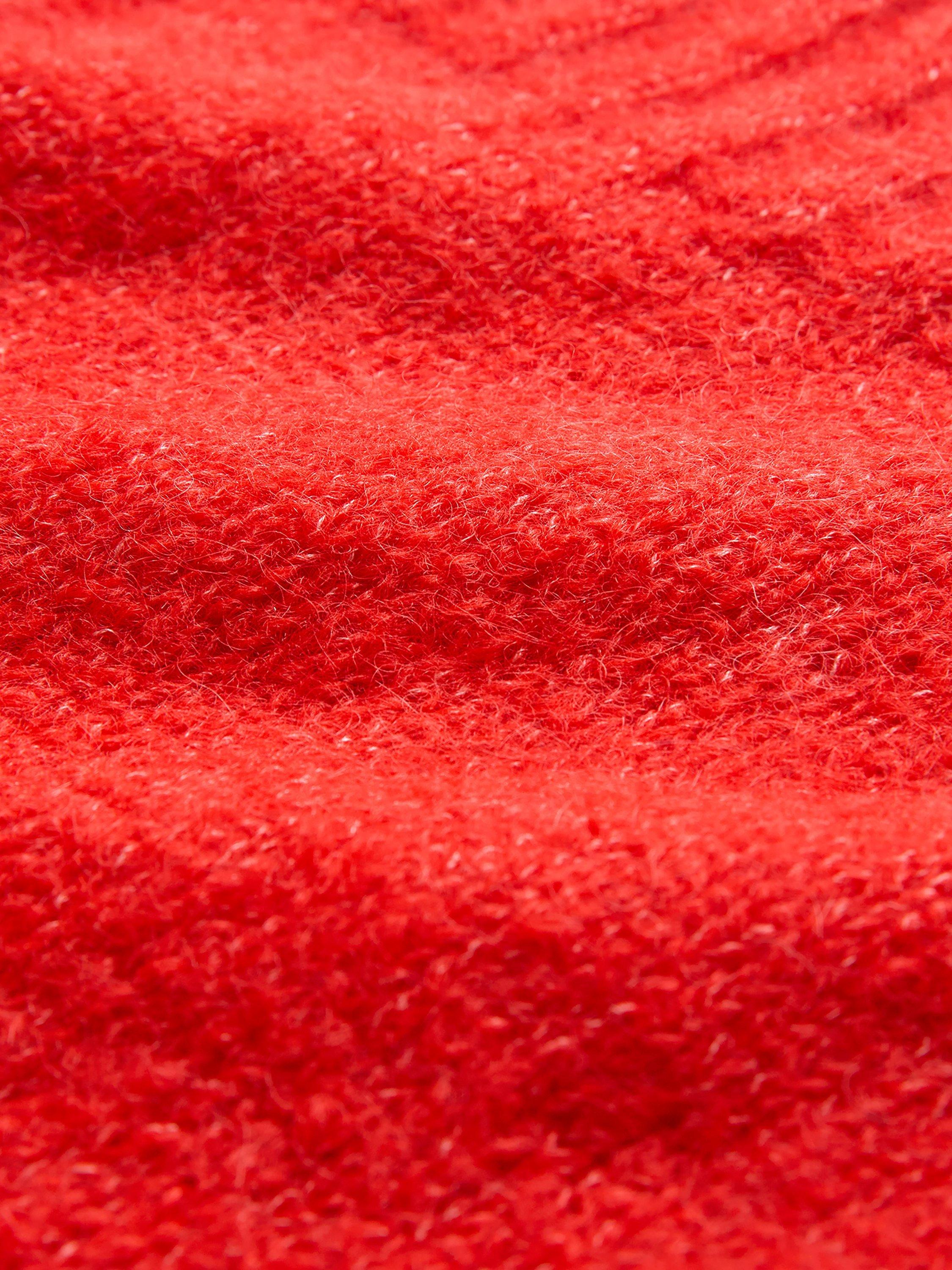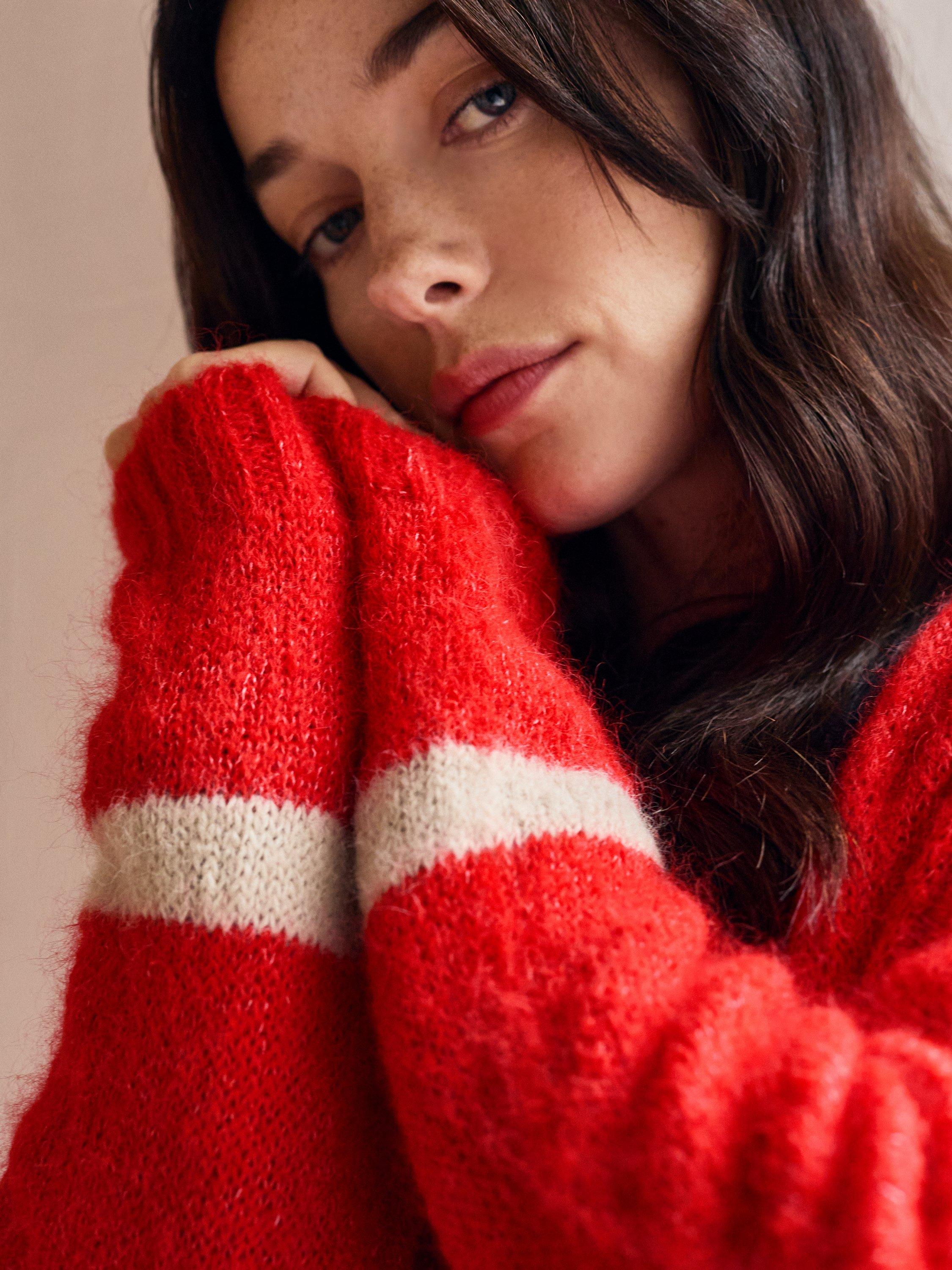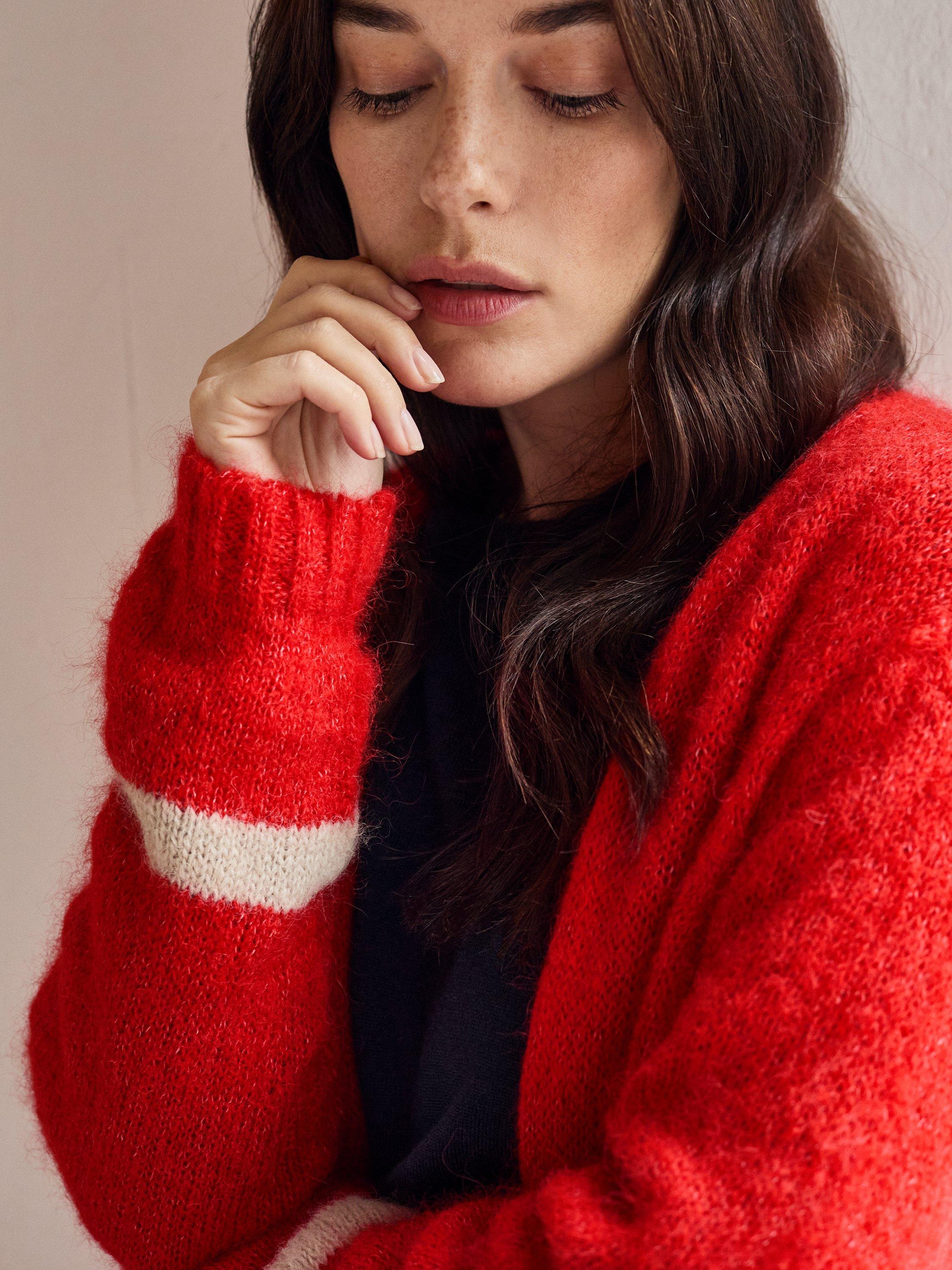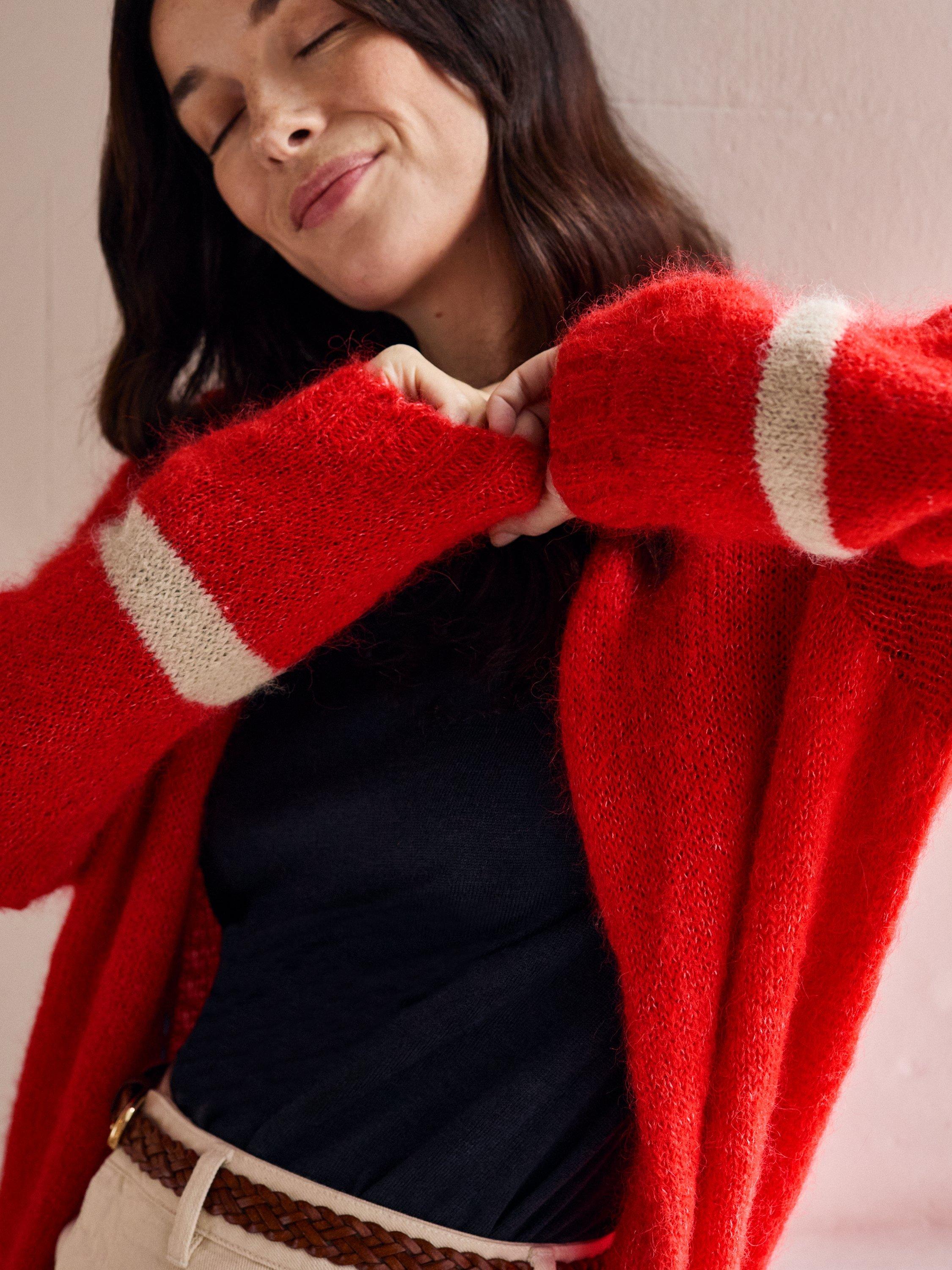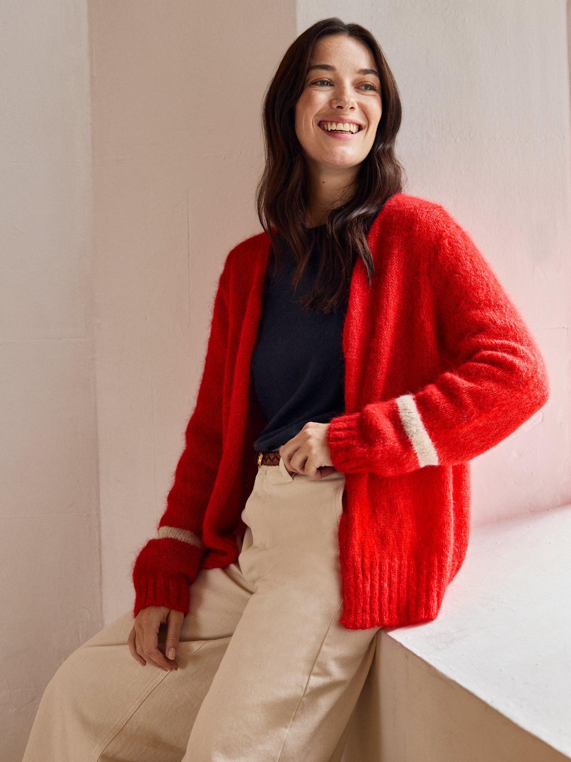 This beautiful, luxurious, slouchy cardigan is crafted from a lofty, fluffy yarn. It is incredibly soft to touch, and is perfect for chilly spring and summer evenings. With deep ribbed cuffs and hem, and a narrower rib at the collar and placket, it's finished off with a contrast tipping stripe at the cuff of each slightly ballooned sleeve.