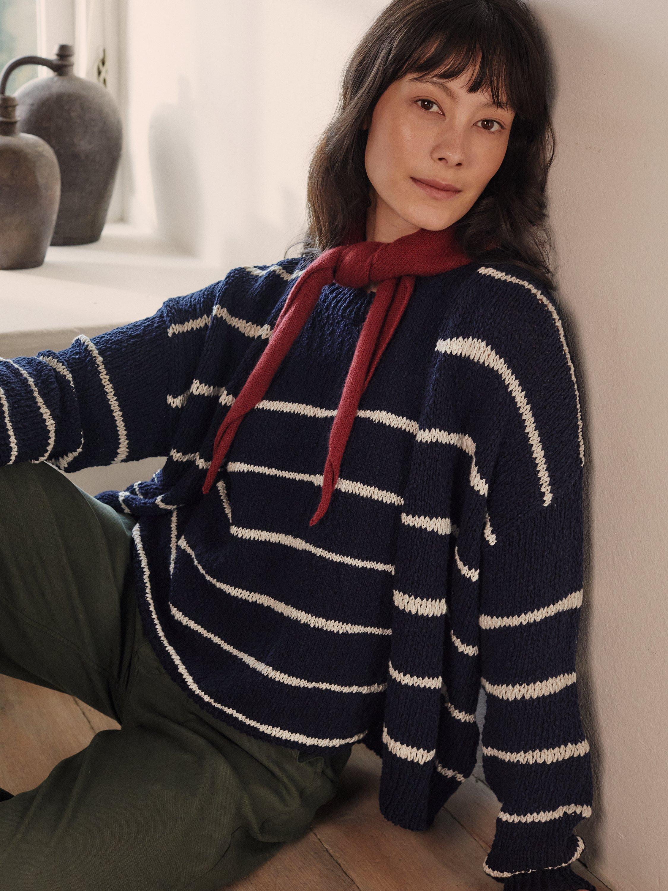 This relaxed-fit cardigan features a distinctive drop-stitch Breton stripe. Crafted with care, its edge-to-edge style offers a refined yet comfortable layer, perfect for everyday wear that honours natural fibres and thoughtful design.