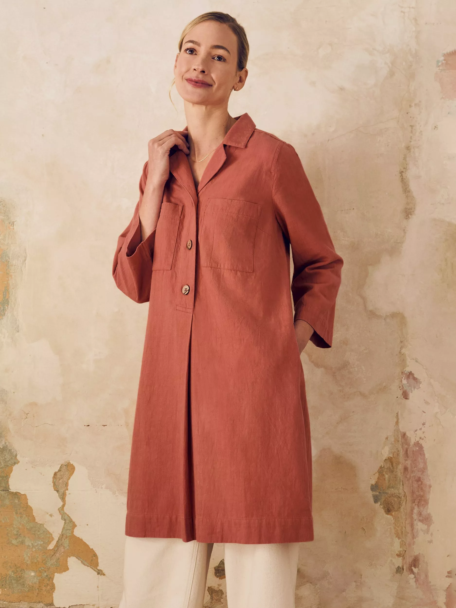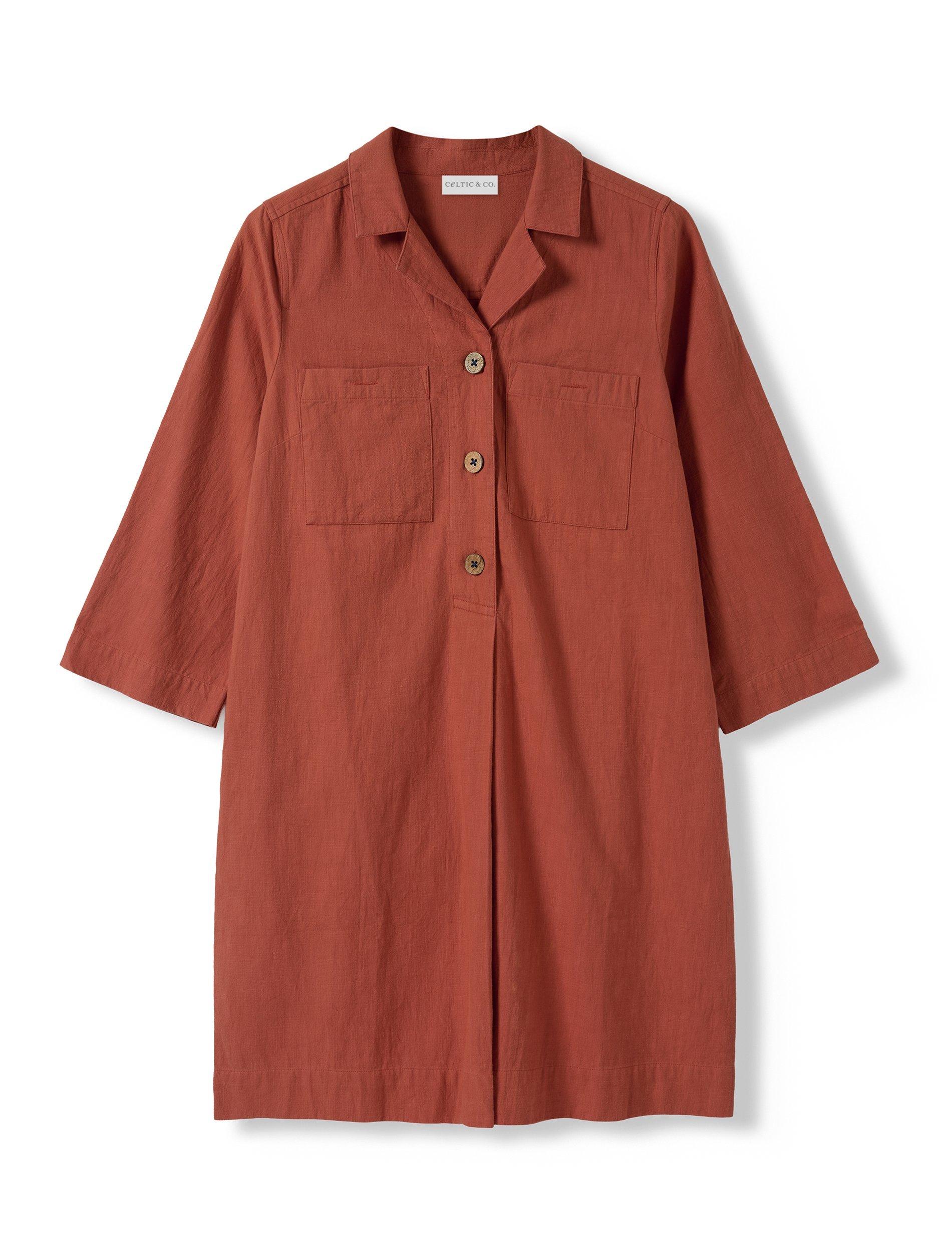 This knee-length dress features a relaxed fit and a collared neckline with a half-button placket fastening for effortless wear. Crafted with natural coconut buttons, it reflects a thoughtful approach to materials. The easy body fit ensures comfort, making it a refined choice for those who appreciate understated, quality design.