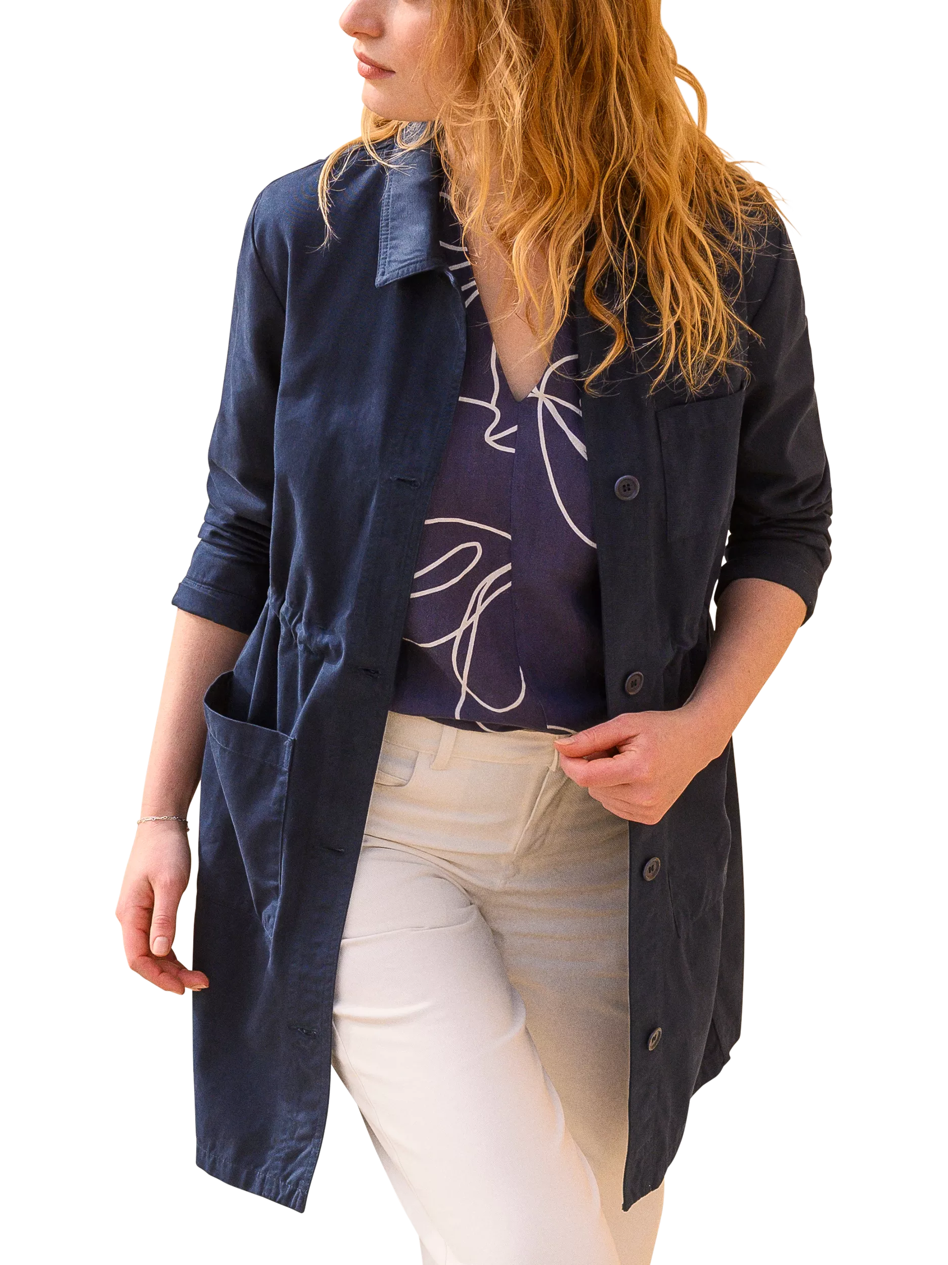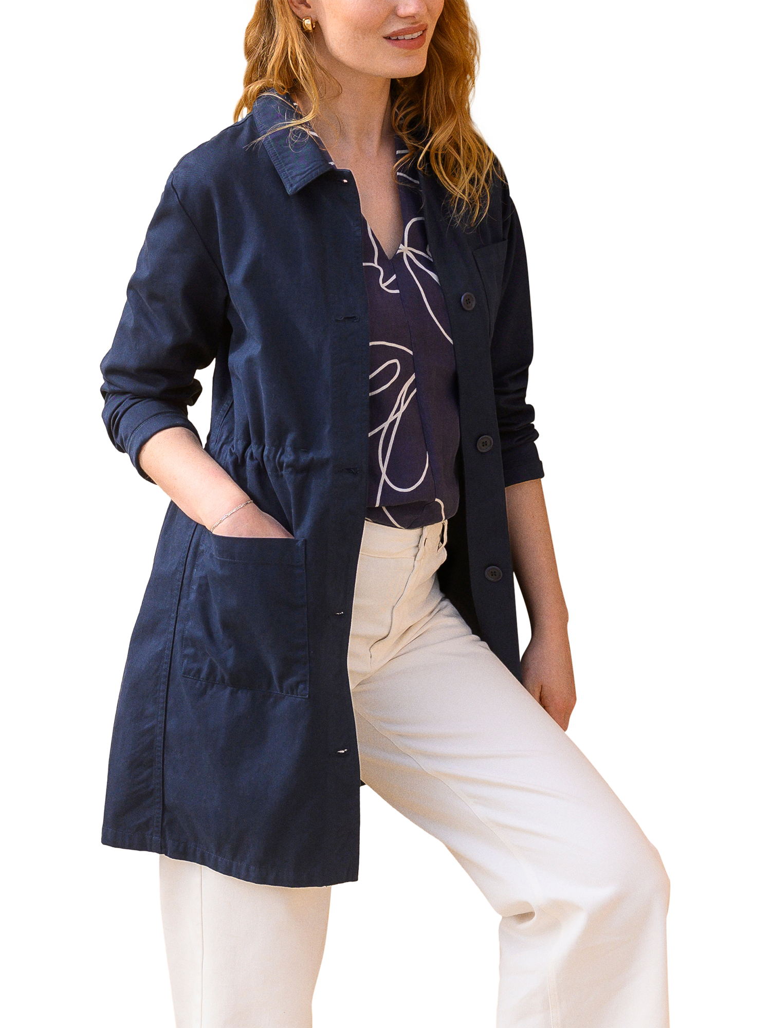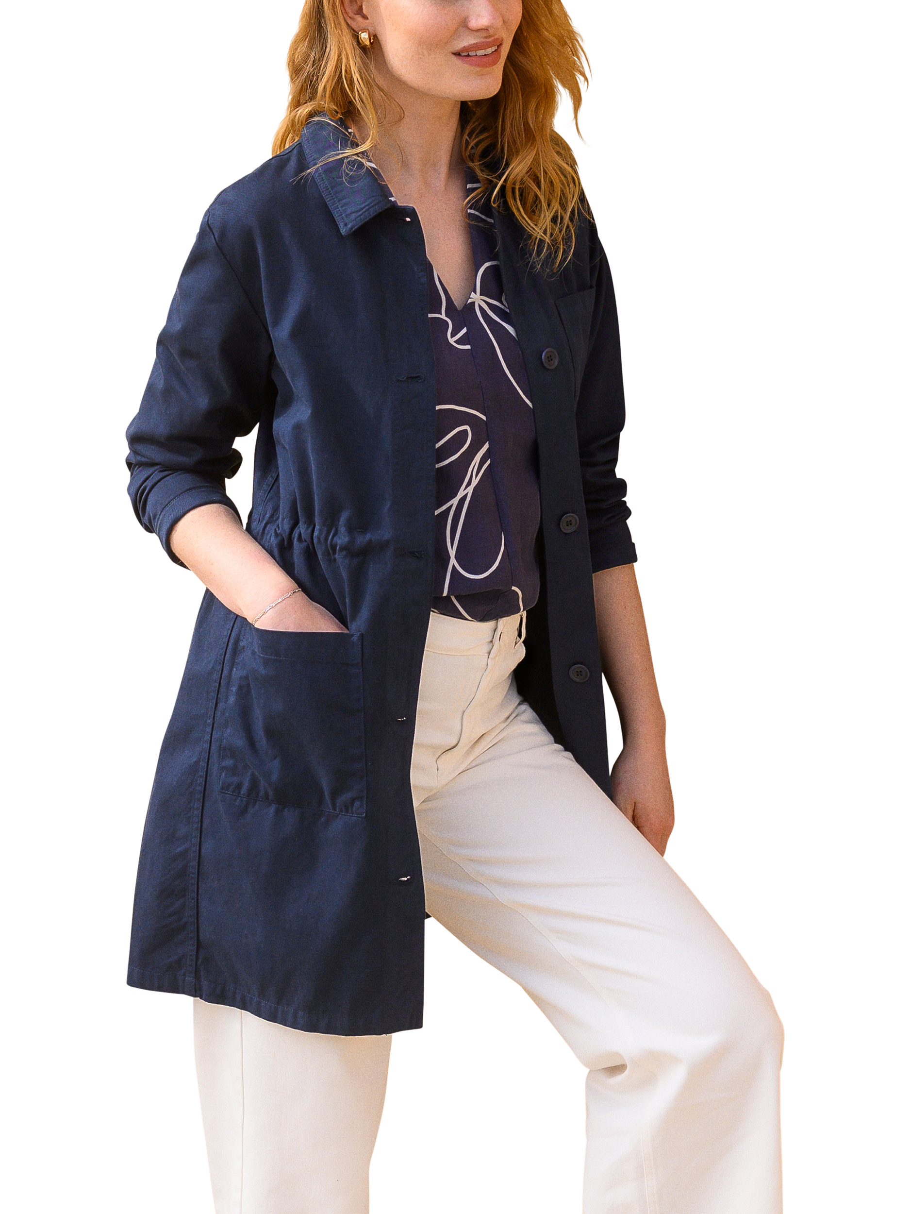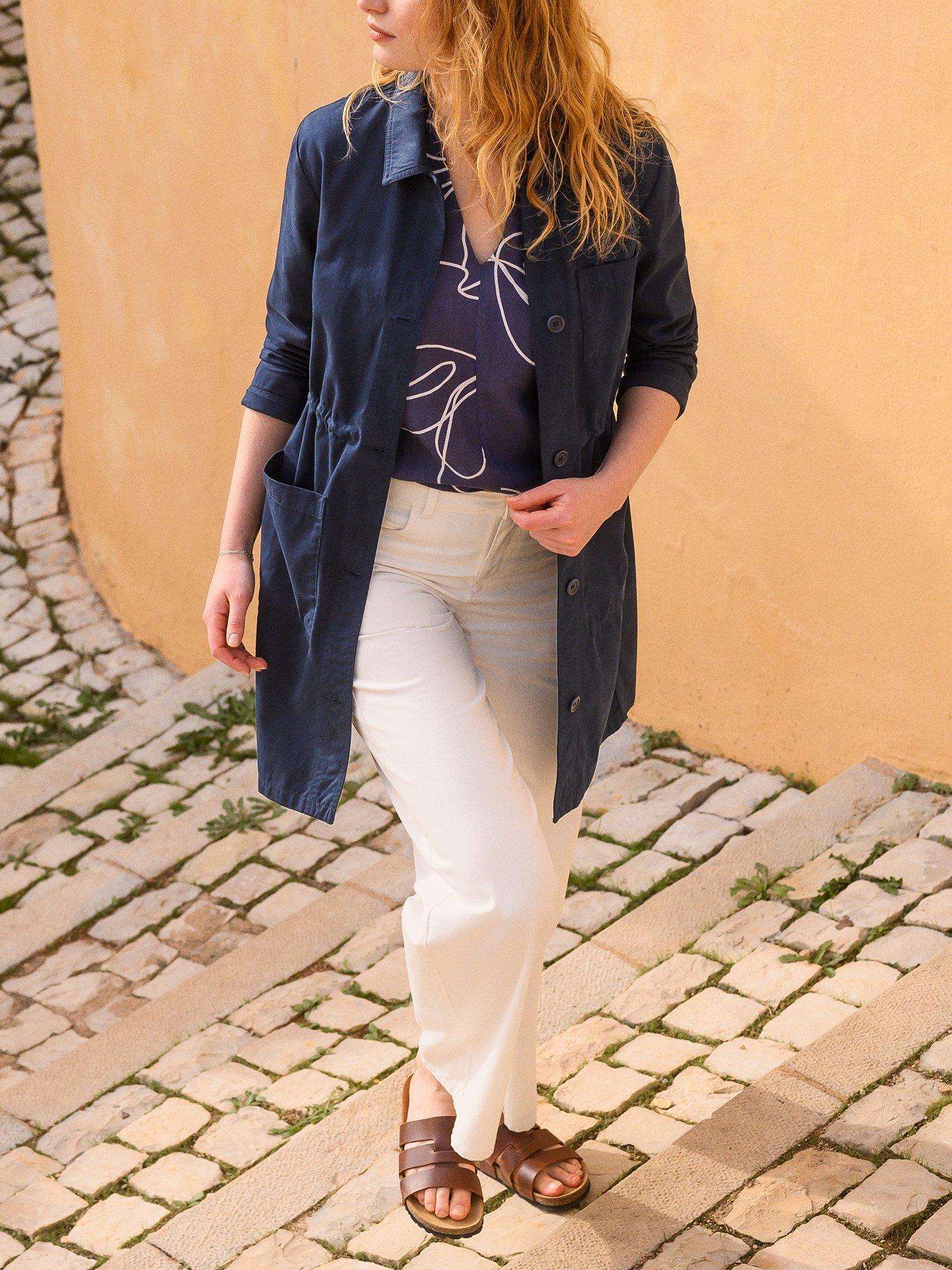 A versatile, 3/4 length, mid-weight jacket that is perfect for spring. Made from smooth cotton fabric, the surface is slightly peached, making it soft to the touch. Featuring a chest pocket, two hip pockets, collar detail and Corozo buttons, this coat has an internal tie at the waist that can be adjusted: cinch it in for a fitted look, or leave it loose for a boxy shape.