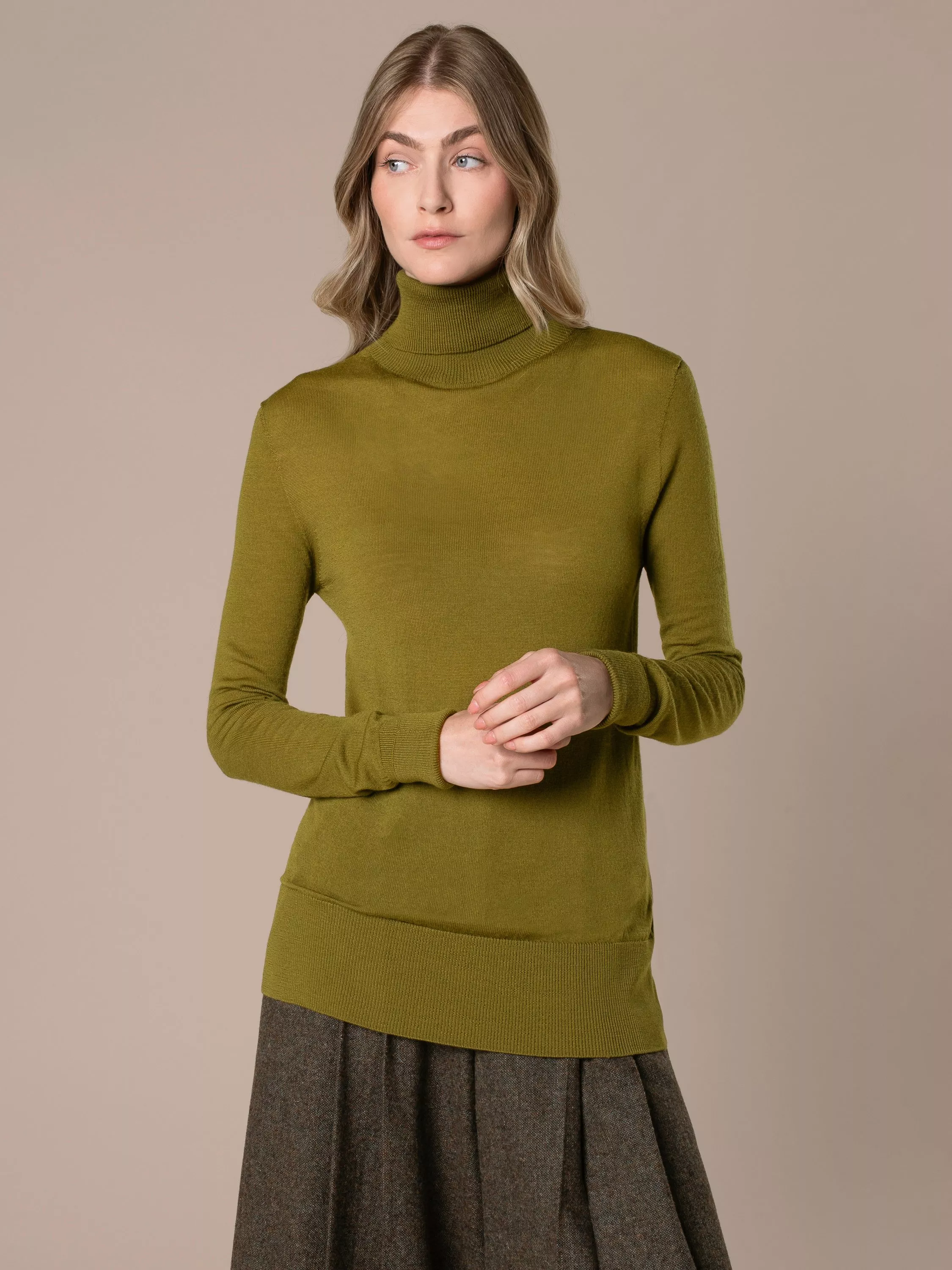Form-fitting style meets heavenly softness in the Merino roll-neck jumper. This versatile piece is designed to offer a slim fit with a deep-ribbed waistband that falls at the hips, making it a great option for layering.