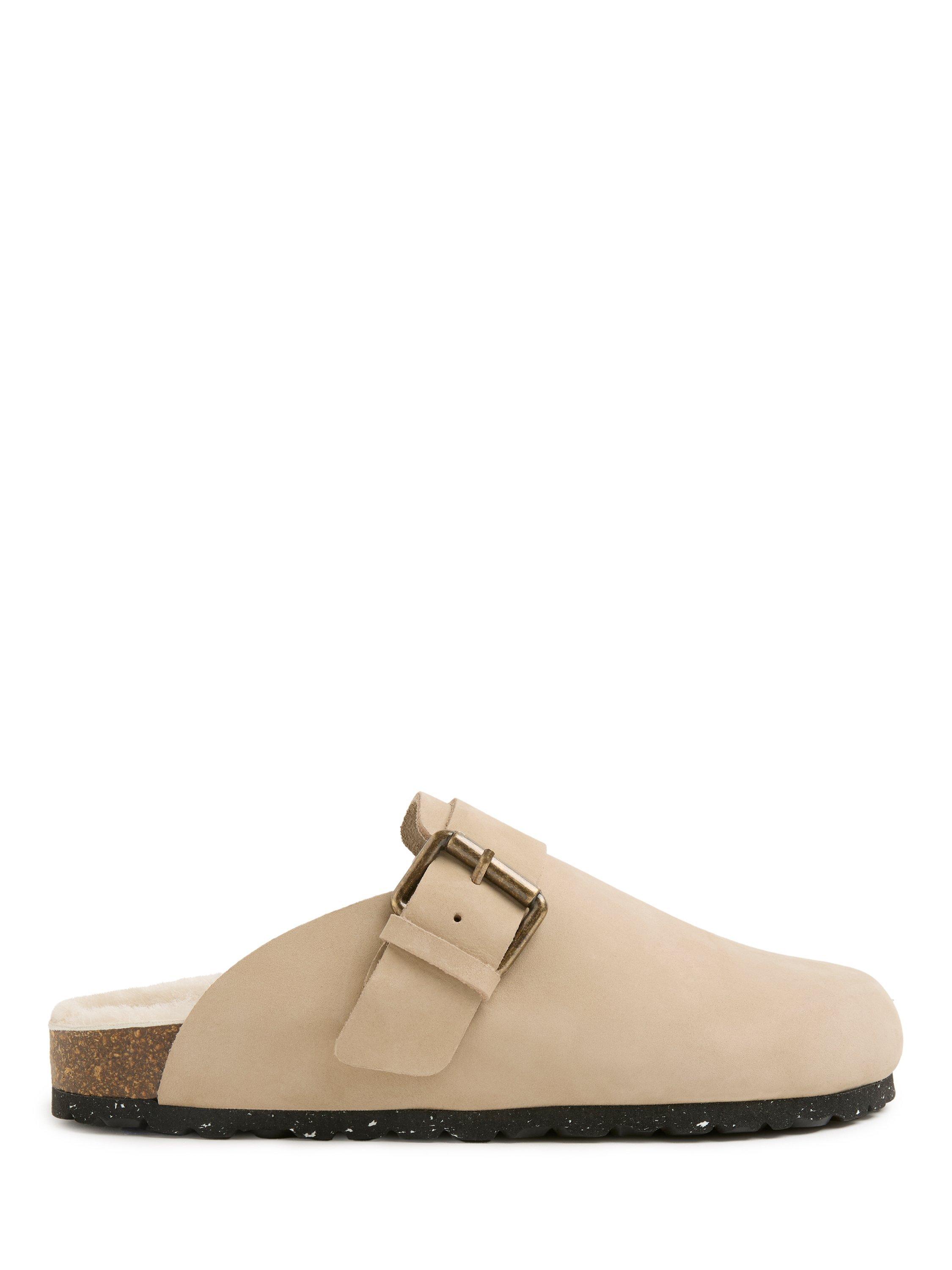 A slip-on with buckled strap detail. Features lined insole with real sheepskin. The midsole is made out of cork, and the outsole is made with EVA.