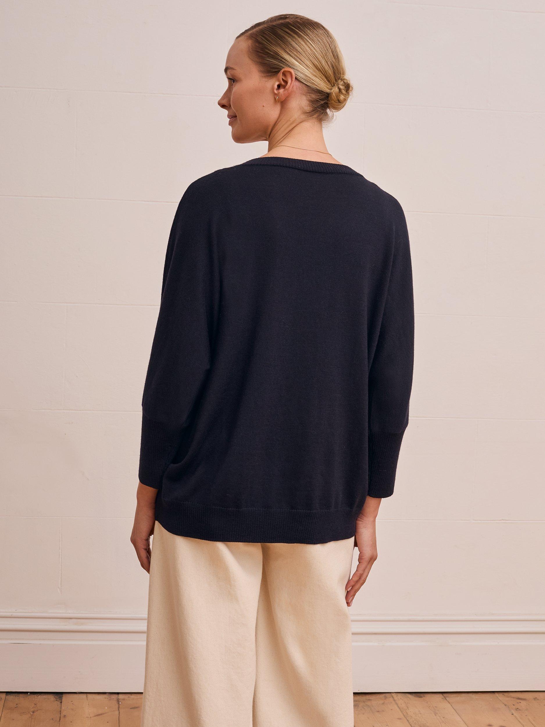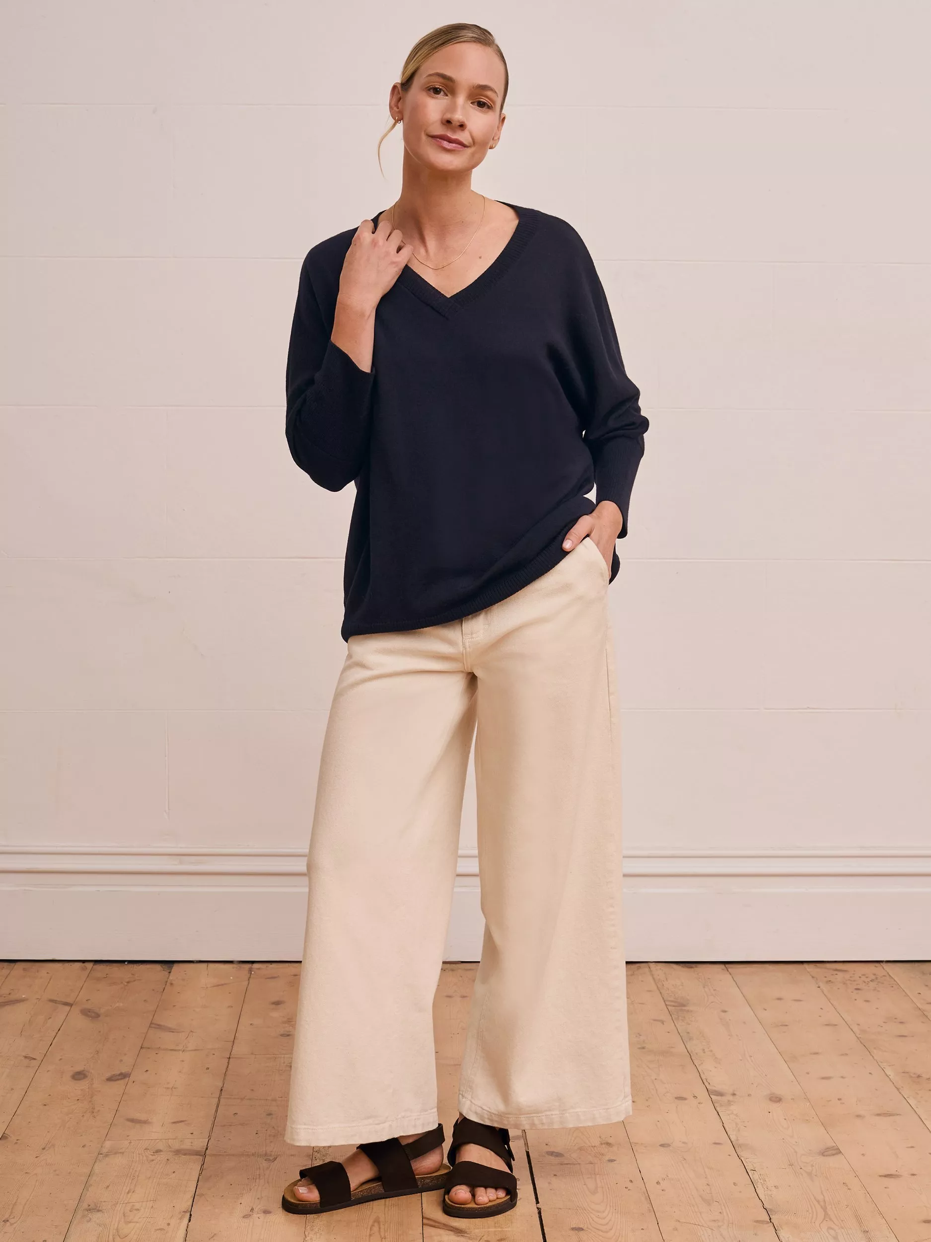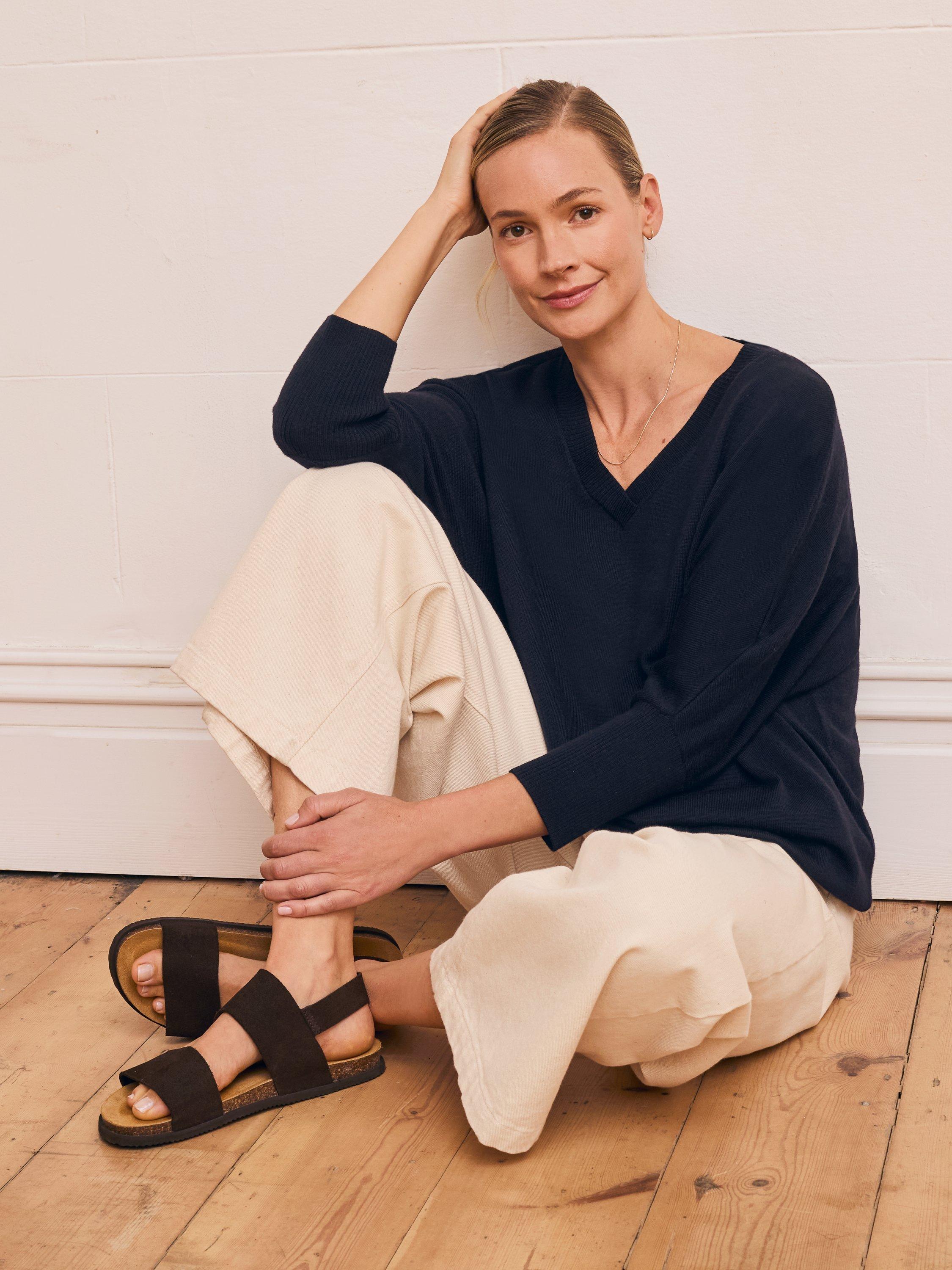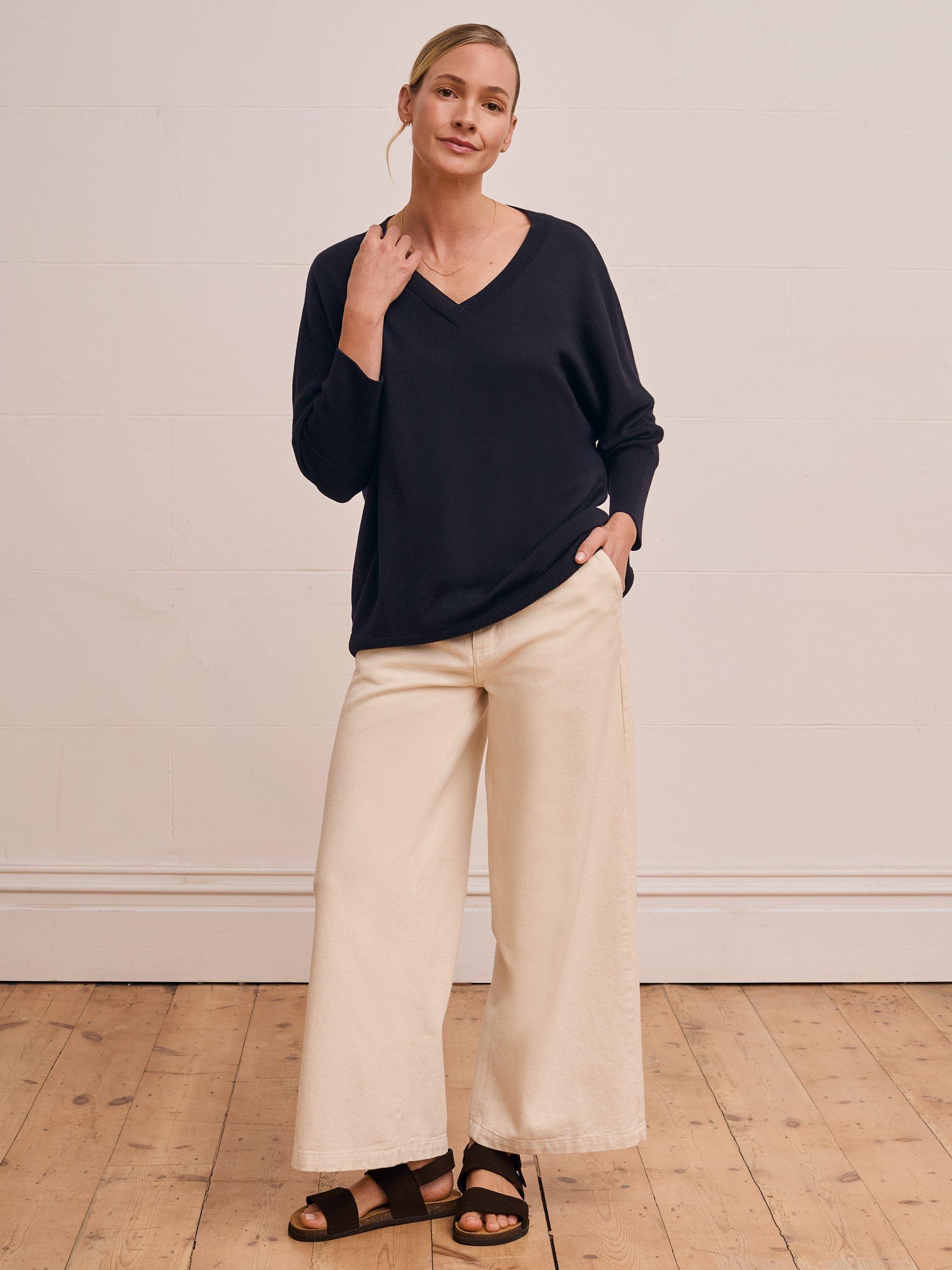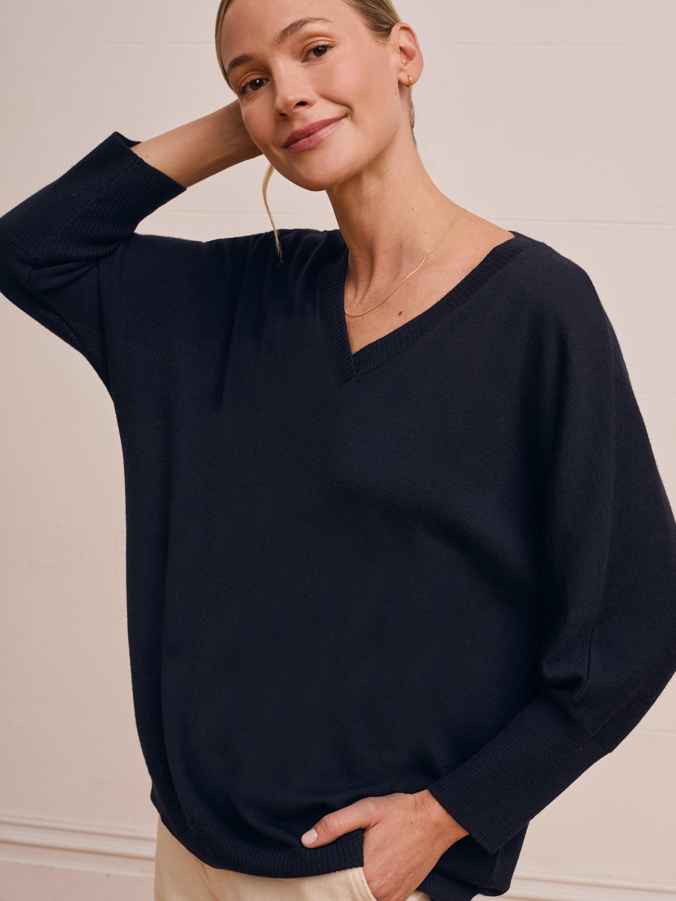 This top combines a relaxed fit with a V neckline and grown-on details for a comfortable silhouette. A stylish alternative to your go-to Crew knit with a snuggly cashmere feel handle.