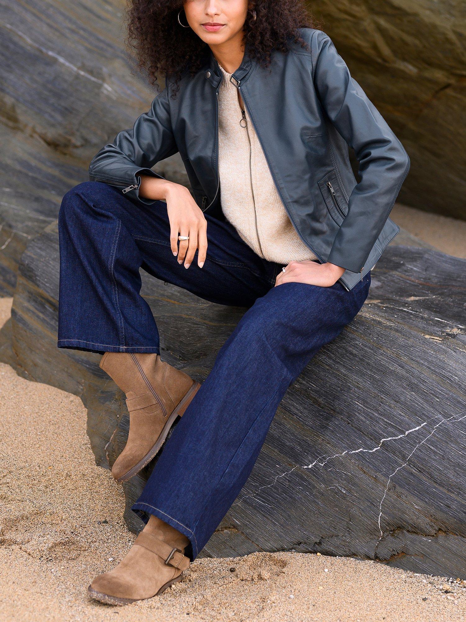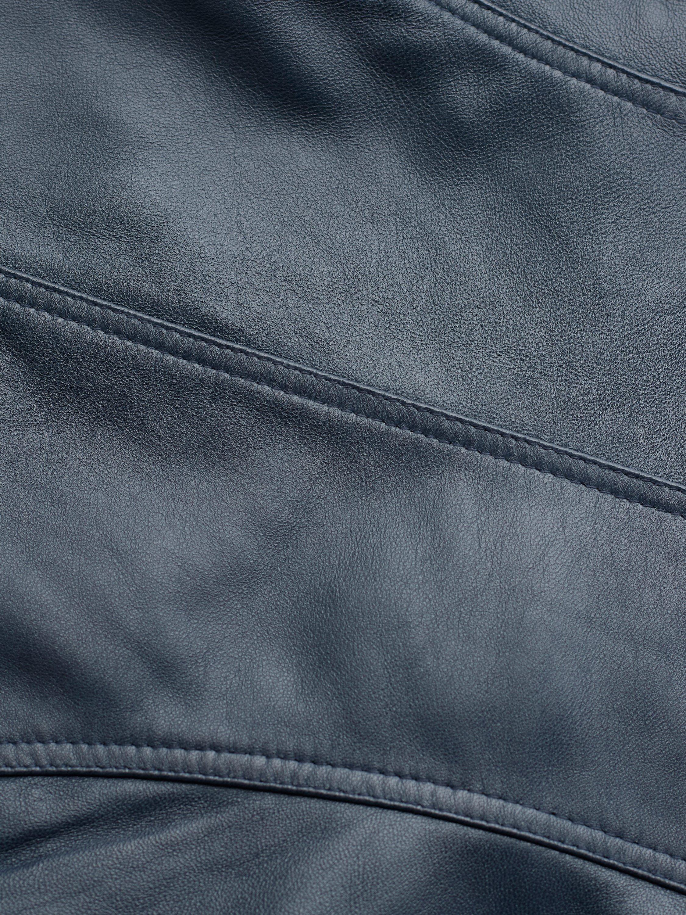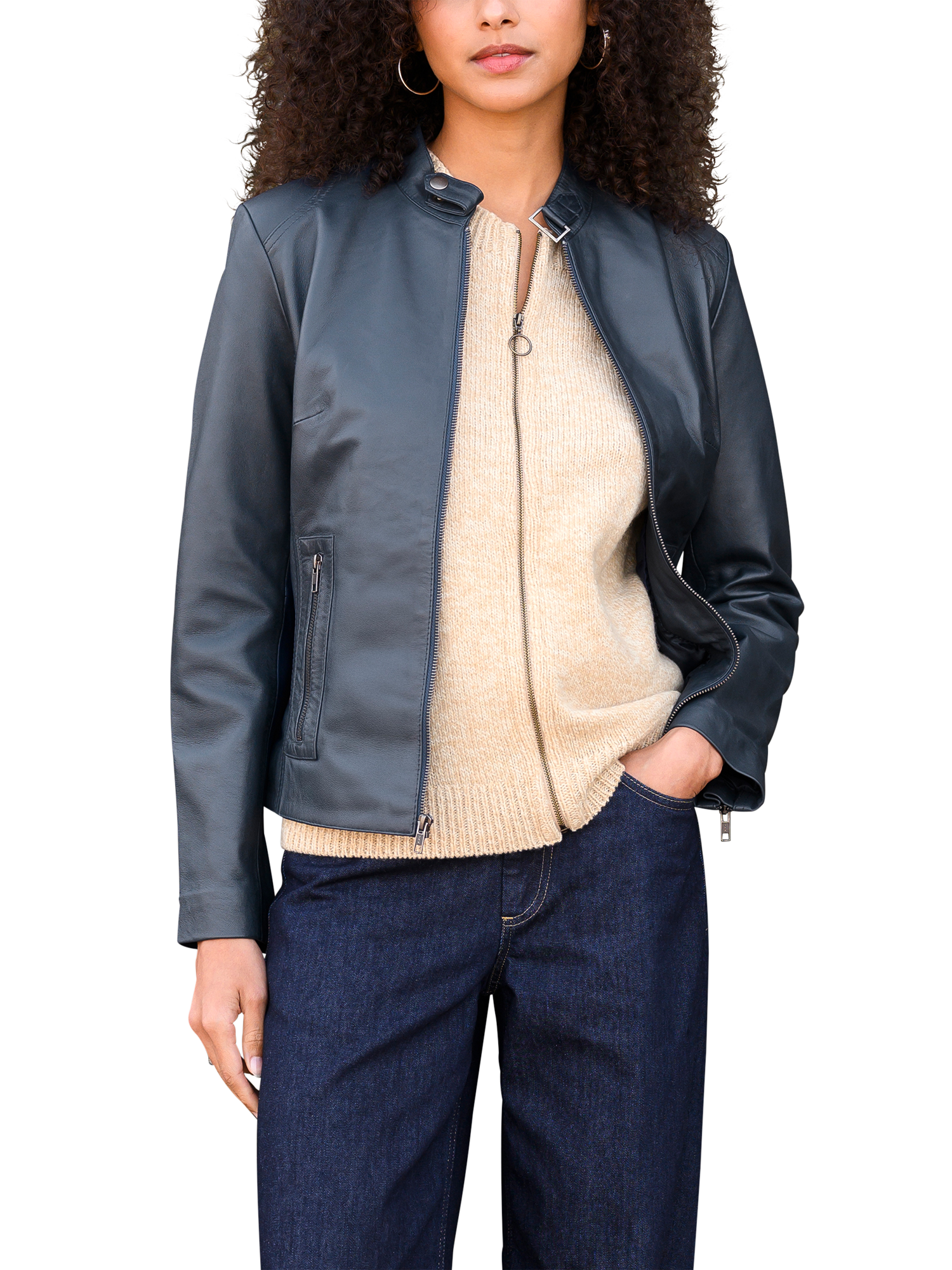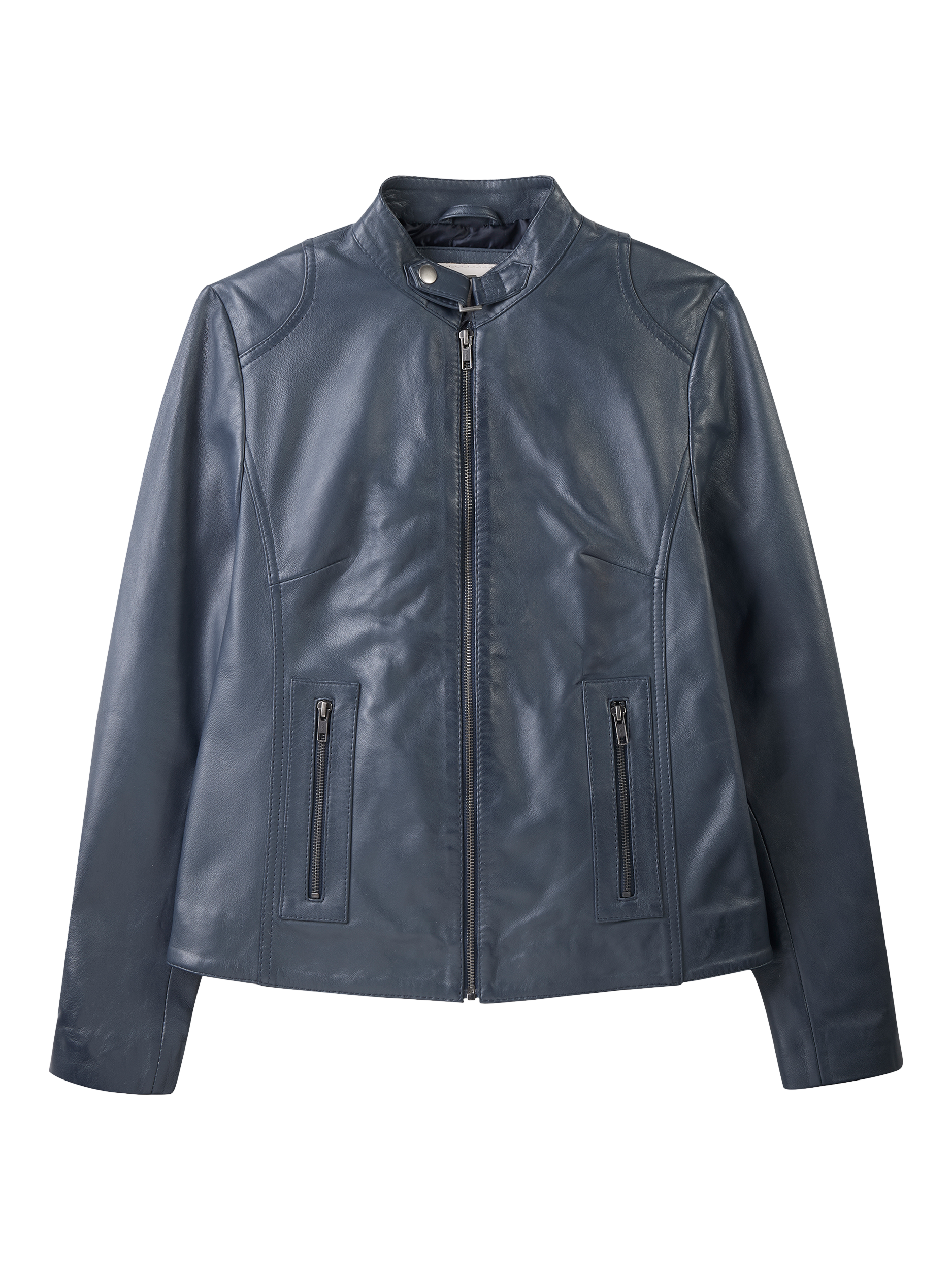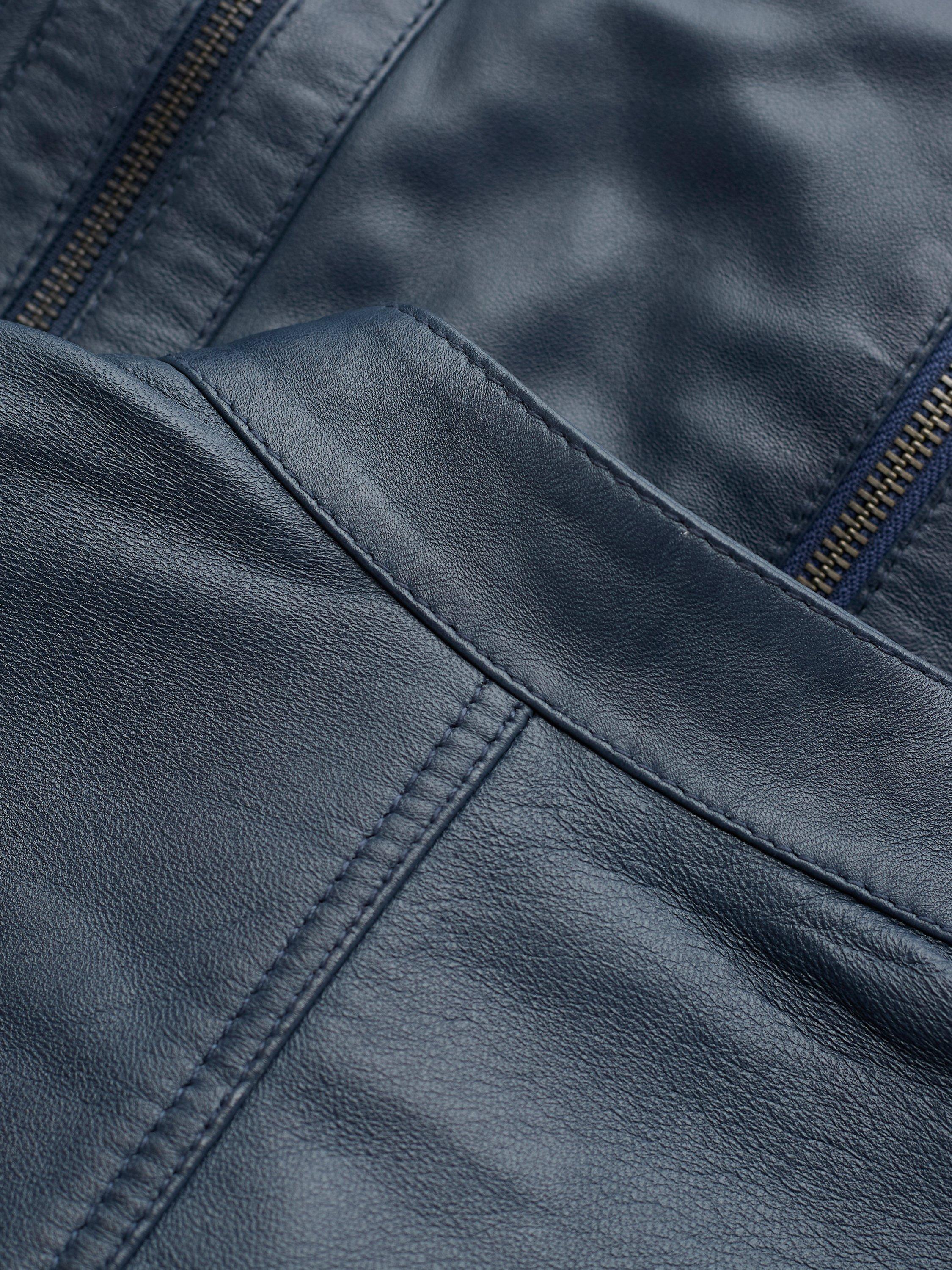 This slim-fit biker jacket showcases a stand collar with a poppered tab, offering a sleek silhouette. Designed with side pockets, it combines luxury with a contemporary edge, making it a versatile addition to your wardrobe.