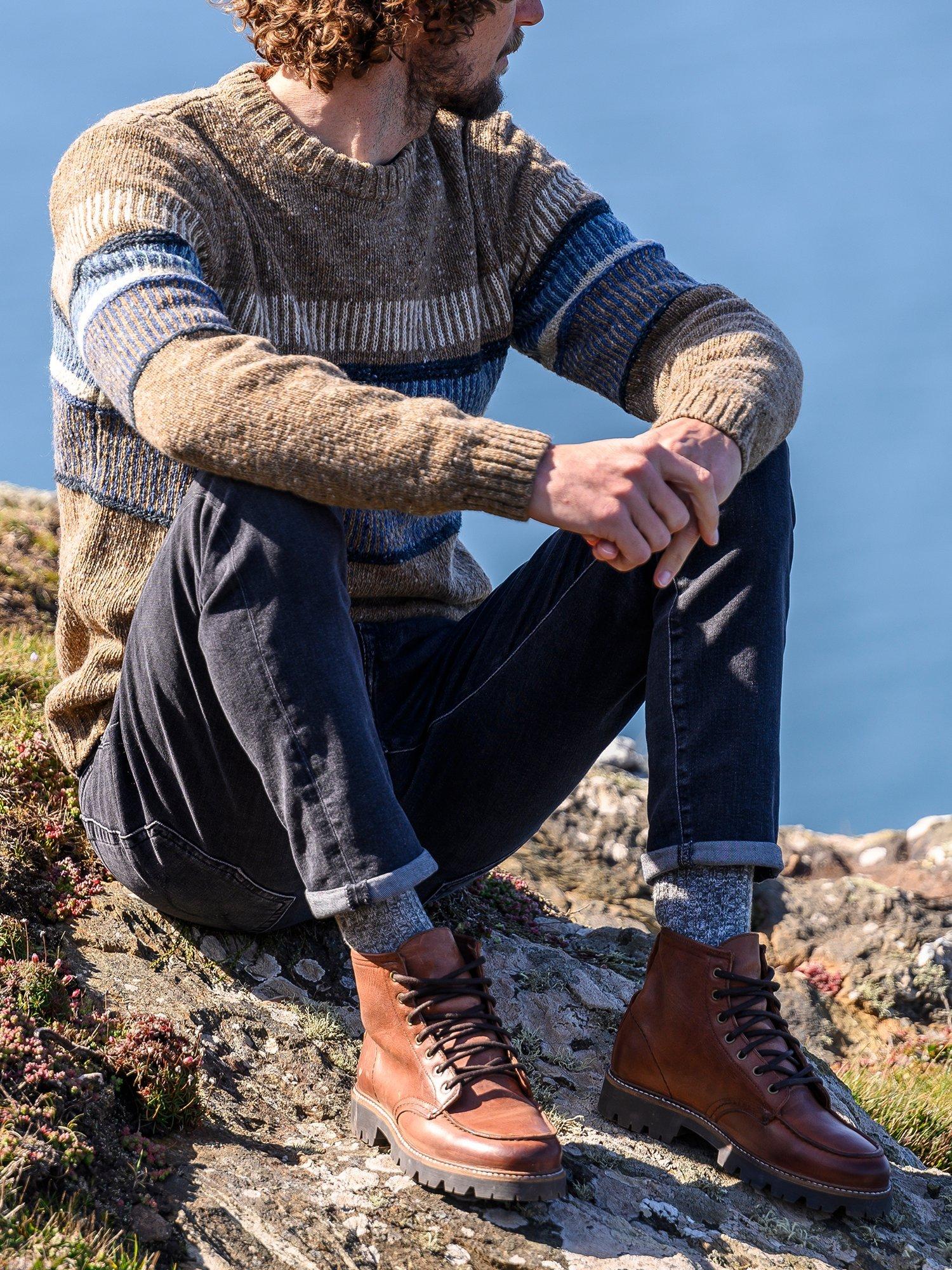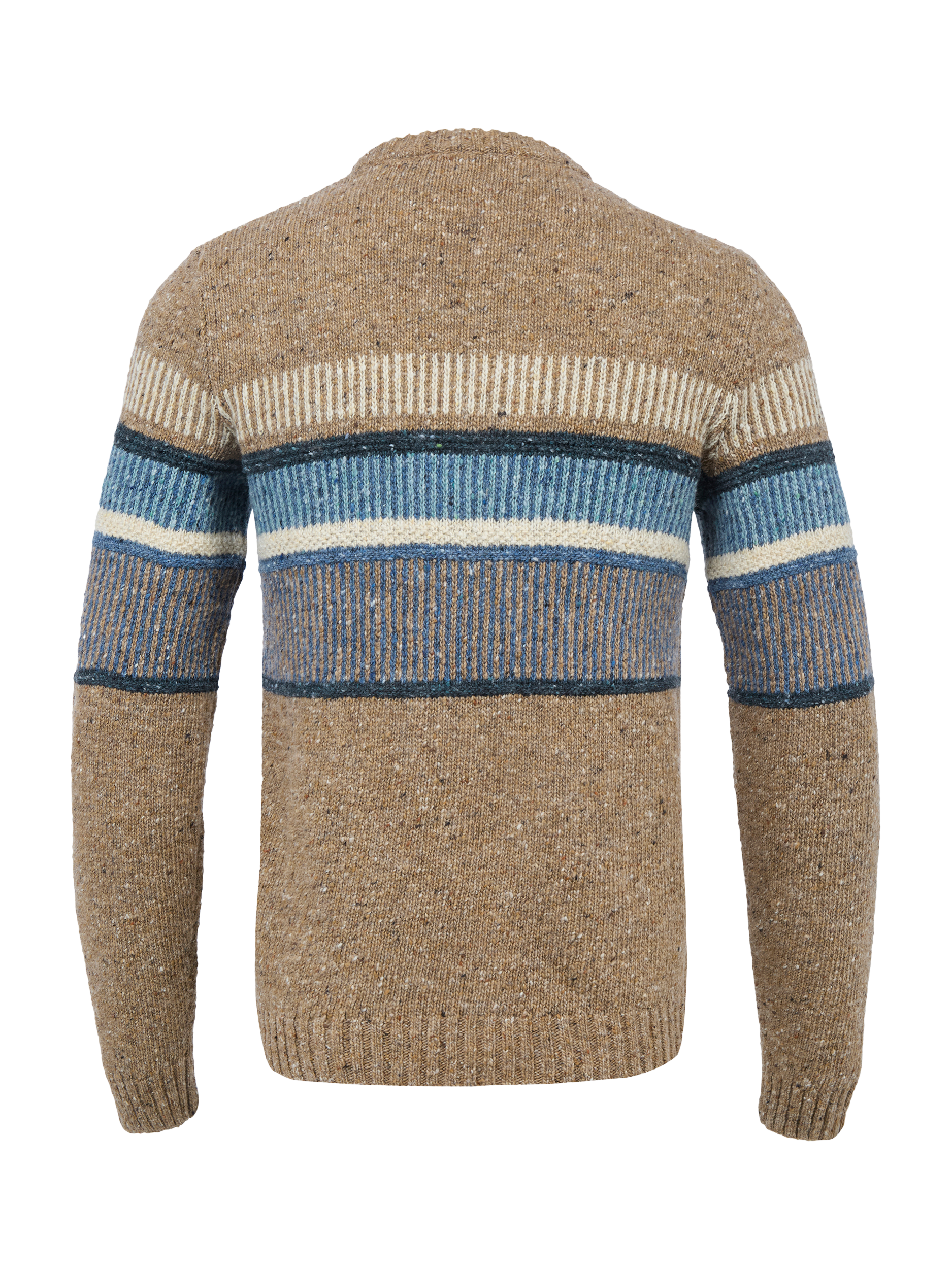 Made from real Donegal yarn, this wool jumper features a textured stitch pattern in contrasting colours running across the chest and sleeves. Created in a classic shape, it has a crew neck plus a ribbed collar, cuffs and hem. It's designed to be pulled on, worn with everything and well loved.