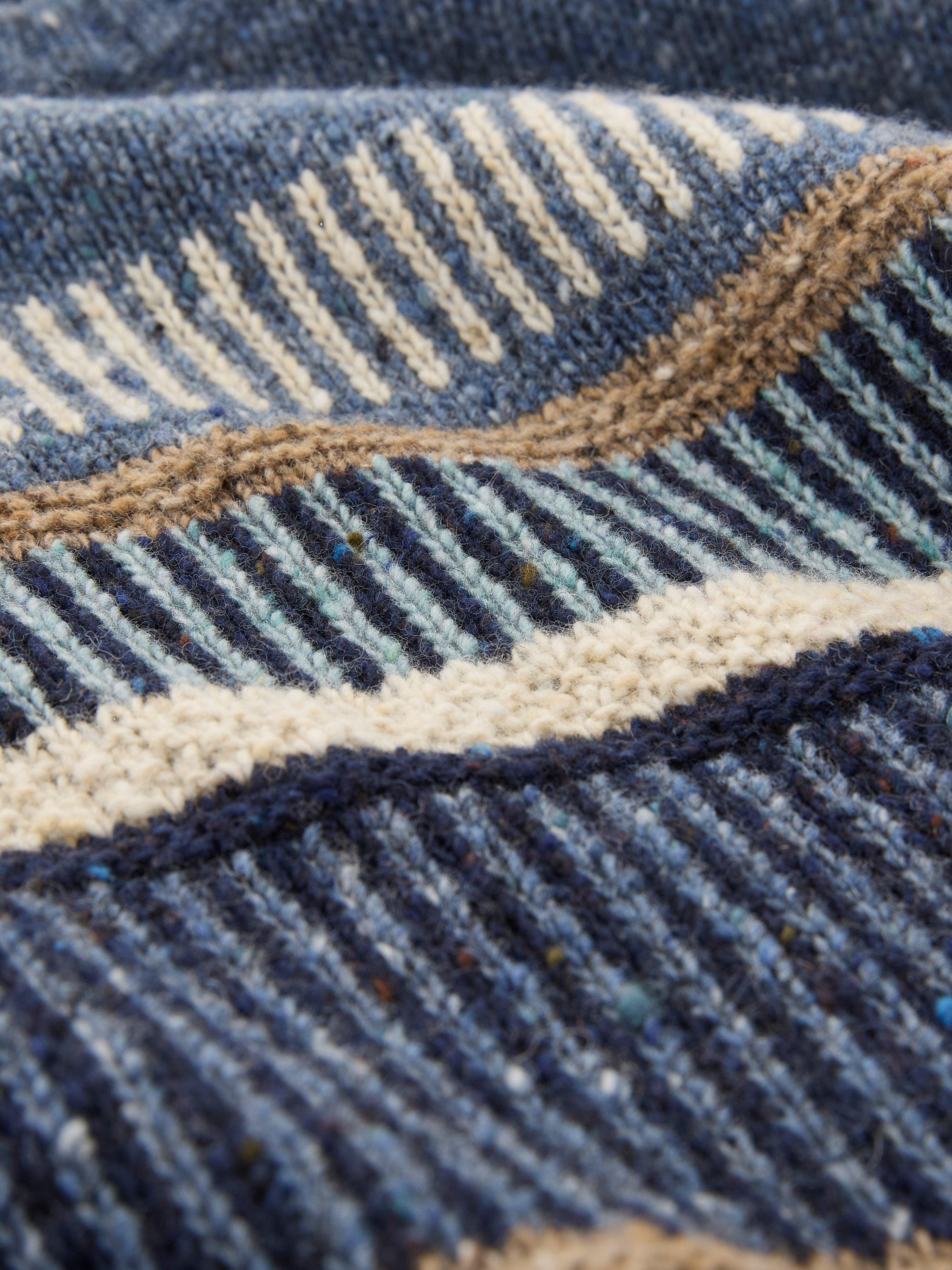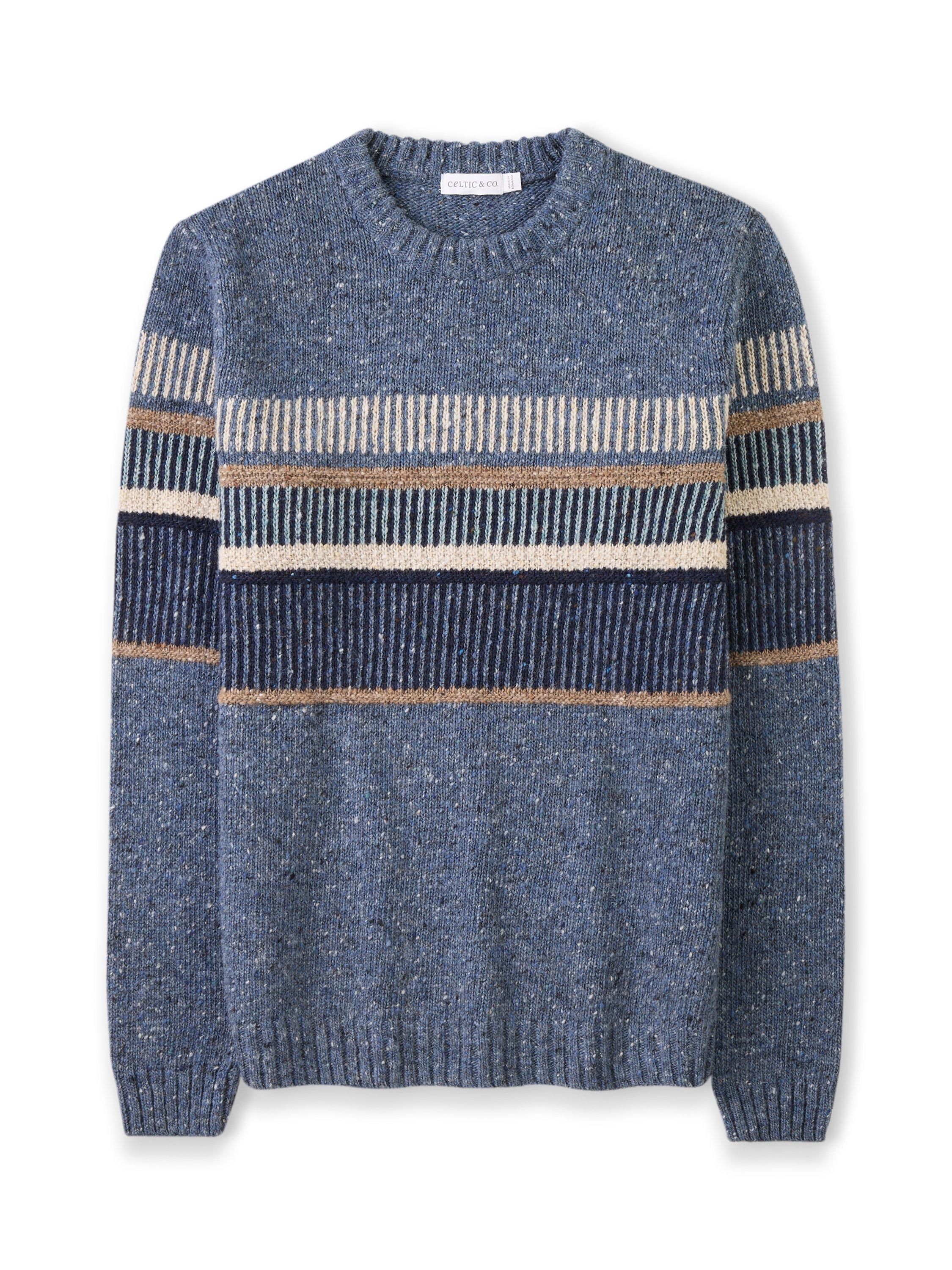 Made from real Donegal yarn, this wool jumper features a textured stitch pattern in contrasting colours running across the chest and sleeves. Created in a classic shape, it's got a crew neck plus a ribbed collar, cuffs and hem. It’s designed to be pulled on, worn with everything and well-loved.
